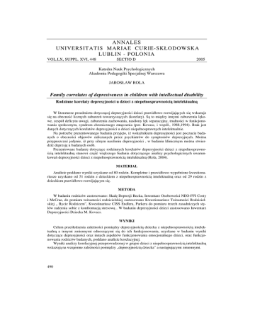ANNALES UNIVERSITATIS MARIAE CURIE-SKŁODOWSKA LUBLIN - POLONIA VOL.LX, SUPPL. XVI, 448 SECTIO D 2005 Katedra Nauk Psychologicznych Akademia Pedagogiki Specjalnej Warszawa JAROSŁAW ROLA Family correlates of depresiveness in children with intellectual disability Rodzinne korelaty depresyjności u dzieci z niepełnosprawnością intelektualną W literaturze przedmiotu dotyczącej depresyjności dzieci prawidłowo rozwijających się wskazuje się na obecność licznych zaburzeń towarzyszących (korelaty). Są to między innymi zaburzenia lękowe, zespół deficytu uwagi, zaburzenia zachowania, nasilony lęk separacyjny, trudności w funkcjonowaniu społecznym, syndrom chronicznego zmęczenia (por. Kovasc, i współ., 1988,1994). Brak jest danych dotyczących korelatów depresyjności u dzieci niepełnosprawnych intelektualnie. Na potrzeby prezentowanego badania przyjęto, iż wskaźnikiem depresyjności jest poczucie badanych o obecności objawów zaliczanych przez psychiatrów do symptomów depresyjnych. Można przypuszczać jedynie, iż przy silnym nasileniu depresyjności , w badaniu klinicznym można stwierdzić depresję u badanych osób. Prezentowane badanie dotyczące rodzinnych korelatów depresyjności dzieci z niepełnosprawnością intelektualną stanowi część większego badania dotyczącego analizy psychologicznych uwarunkowań depresyjności dzieci z niepełnosprawnością intelektualną (Rola, 2004). MATERIAŁ Analizie poddano wyniki uzyskane od 80 rodzin. Kompletne i prawidłowo wypełnione kwestionariusze uzyskano od 51 rodzin z dzieckiem z niepełnosprawnością intelektualną oraz od 29 rodzin z dzieckiem prawidłowo rozwijającym się. METODA W badaniu rodziców zastosowano: Skalę Depresji Becka, Inwentarz Osobowości NEO-FFI Costy i McCrae, do pomiaru tożsamości rodzicielskiej zastosowano Kwestionariusz Tożsamości Rodzicielskiej „ Bycie Rodzicem”, Kwestinariusz CISS Endlera, Parkera do pomiaru trzech zasadniczych stylów radzenia sobie z konfrontacją stresową . W badaniu depresyjności dzieci zastosowano Inwentarz Depresyjności Dziecka M. Kovacs. WYNIKI Celem prześledzenia zależności pomiędzy depresyjnością dziecka z niepełnosprawnością intelektualną a innymi zmiennymi odnoszącymi się do ich funkcjonowania, uzyskane w badaniu wyniki dotyczące depresyjności oraz innych aspektów funkcjonowania emocjonalnego dzieci, oraz funkcjonowania rodziców badanych, poddano analizie korelacyjnej. Wyniki analizy korelacyjnej przeprowadzonej w grupie dzieci z niepełnosprawnością intelektualną wskazują na wzajemne zależności pomiędzy „depresyjnością dziecka” a następującymi zmiennymi. 490 Tabela 1. Wyniki analizy korelacyjnej (korelacje nieparametryczne) dla grupy dzieci niepełnosprawnych intelektualnie Zmienne Lęk u dziecka Chwiejność emocjonalna Obniżony nastrój Problemy interpersonalne Nieefektywność Anhedonia Obniżona samoocena Właściwe umiejętności społeczne Impulsywność Wsparcie matki w percepcji dziecka Odrzucenie matki w percepcji dziecka Wsparcie ojca w percepcji dziecka Odrzucenie przez ojca w percepcji dziecka Depresja dziecka z niepełnosprawnością intelektualną ,454** ,249* ,597** ,591** ,591** ,596** ,458** -,394** ,310** -,330** ,232* -,366** ,216* N Istotność dwustronna 51 51 51 51 51 51 51 51 51 51 51 51 51 ,000 ,015 ,000 ,000 ,000 ,000 ,000 ,000 ,002 ,001 ,016 ,000 ,027 Korelacja zmiennych w grupie dzieci niepełnosprawnych intelektualnie pozwala na stwierdzenie silnego związku pomiędzy depresyjnością dziecka a poziomem jego lęku i chwiejnością emocjonalną dziecka. Lęk i depresja, jak wynika z literatury przedmiotu to zmienne dość często ze sobą współwystępujące. U osób w depresji zazwyczaj stwierdza się wysoki poziom zarówno lęku sytuacyjnego, jak i lęku rozumianego jako względnie trwała dyspozycja do reagowania w lękowy sposób (por. Tyra, 1999, Costell, 1993, Rola, 1996). Współwystępowanie depresyjności z chwiejnością emocjonalną badanych dzieci z niepełnosprawnością intelektualną wiązać można z odczuwanym przez dziecko brakiem stałości w zakresie doświadczeń emocjonalnych. Chwiejność emocjonalna zwana również labilnością emocjonalną oznacza niemożność ze strony dziecka do przeżywania całego szerokiego zakresu stanów emocjonalnych będących odpowiedzią na sytuacje społeczne. Związana jest z nadmiernie łatwym przechodzeniem z nastroju nieco podwyższonego (np. radość) do obniżonego (smutek). Owa niezdolność do doświadczania całego bogactwa stanów emocjonalnych stanowić może konsekwencję ograniczonej zdolności pomieszczenia emocji dziecka przez samego rodzica, bądź jego działań podejmowanych w kierunku ograniczenia ekspresji emocjonalnej dziecka z niepełnosprawnością intelektualną. Konsekwencją tego jest pewnego rodzaju „stępienie” afektu, jego spłaszczenie. Trudno jest wskazać na związek przyczynowo skutkowy pomiędzy depresyjnością a chwiejnością emocjonalną. Wyniki analizy korelacyjnej nie upoważniają zresztą do takiego formułowania hipotez. Prześledźmy zanim powrócimy do omówienia kolejnych korelatów depresji u dzieci, które z analizowanych zmiennych współwystępują z chwiejnością emocjonalną dziecka. W nawiasach podano wartości uzyskanych współczynników korelacji. Pojawienie się przy współczynniku ** oznacza, iż korelacja jest istotna na poziomie 0,01 (dwustronnie), z kolei obecność * oznacza iż korelacja jest istotna na poziomie 0.05 (dwustronnie). Wyniki analizy korelacyjnej pozwalają na stwierdzenie obecności silnego związku pomiędzy chwiejnością emocjonalną dziecka niepełnosprawnego intelektualnie a poziomem jego lęku (r=0,389*, p<0,001), jego agresywnością słowną i fizyczną (r=0,589**, p<0,000), obniżonym nastrojem (r=0,226*, p<0,021), problemami interpersonalnymi (r=0,217*, p<0,053), nieefektywnością (r=0,463, p<,000), anhedonią (r=0,452**, p<,000) ora