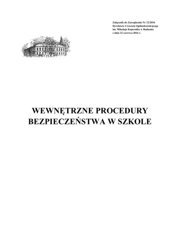 Załącznik do Zarządzenia Nr 12/2016 Dyrektora I Liceum Ogólnokształcącego im. Mikołaja Kopernika w Radomiu z dnia 22 czerwca 2016 r. WEWNĘTRZNE PROCEDURY BEZPIECZEŃSTWA W SZKOLE Celem Wewnętrznych Procedur Bezpieczeństwa w Szkole jest: ustalenie sposobu postępowania w sytuacjach trudnych i zagrażających bezpieczeństwu w szkole, usprawnienie oraz zwiększenie skuteczności oddziaływań szkoły w sytuacjach zagrożenia, zwiększenie świadomości prawnej pracowników szkoły (kadry pedagogicznej, pracowników administracji i obsługi) oraz rodziców, ustalenie metod współpracy między szkołą, Policją, Strażą Pożarną. służbami medycznymi itp. wypracowanie jednolitych metod współpracy między rodzicami a szkołą, wyznaczenie jasnych i czytelnych reguł postępowania. Telefony alarmowe: 999 998 997 992 994 991 112 – pogotowie ratunkowe straż pożarna policja pogotowie gazowe pogotowie wodno-kanalizacyjne pogotowie energetyczne europejski numer alarmowy Telefony służb miejskich: 48 345 32 52 – 48 345 32 59 – 48 36 20 121 – 48 36 20 577 – 48 362 08 83 – 48 331 45 10 – 48 360 87 01 – 48 362 54 61 – Komenda Miejska Policji Dzielnicowy Miejskie Centrum Zarządzania Kryzysowego Wydział Bezpieczeństwa, Zarządzania Kryzysowego i Ochrony Urzędu Miejskiego w Radomiu Wydział Edukacji Urzędu Miejskiego Poradnia Psychologiczno-Pedagogiczna nr 3 Miejski Ośrodek Pomocy Społecznej Towarzystwo Przyjaciół Dzieci 2 Podstawa prawna: Ustawa z dnia 7 września 1991 r. o systemie oświaty (Dz.U.2015.2156 ze zm.) Statut I Liceum Ogólnokształcącego im. Mikołaja Kopernika w Radomiu Procedury dla nauczycieli opracowane przez Wydział Prewencji Komendy Stołecznej Policji http://wprewencji.policja.waw.pl/portal/wp/1882/296/Procedury_dla_nauczycieli.html, [dostęp 22.10.2015 r.] 3 SPIS TREŚCI PROCEDURY INTERWENCYJNE WOBEC MŁODZIEŻY ZAGROŻONEJ UZALEŻNIENIAMI LUB DEMORALIZACJĄ ........................................................................ 6 1.1. Procedury postępowania pracowników szkoły w sytuacjach zagrożenia uczniów demoralizacją................................................................................................................................ 6 1.2. Procedury interwencyjne w sytuacji podejrzenia ucznia o palenie papierosów ................ 7 1.3. Procedura interwencyjna w przypadku, gdy pracownik szkoły podejrzewa, że na terenie szkoły znajduje się uczeń będący pod wpływem alkoholu lub innych środków odurzających (np. narkotyków, dopalaczy itp.) .................................................................................................. 8 1.4. Procedura interwencyjna w przypadku, gdy pracownik szkoły podejrzewa, że na terenie szkoły konkretny uczeń jest w posiadaniu substancji odurzającej (np. narkotyków, dopalaczy itp.) 8 1.5. Procedury w przypadku, gdy pracownik szkoły znajduje na terenie obiektu substancję przypominającą wyglądem narkotyk............................................................................................ 9 1.6. Procedura postępowania Dyrektora Szkoły w przypadku, gdy policja dokonuje zatrzymania nieletniego sprawcy czynu karalnego przebywającego na zajęciach w szkole ....... 9 Aby jednak ono nastąpiło, musi zaistnieć jedna z wymienionych niżej przesłanek: ............... 9 Procedura ...................................................................................................................................... 10 2. PROCEDURY INTERWENCYJNE W SYTUACJI ZAISTNIENIA PRZEMOCY, KRADZIEŻY I NISZCZENIA MIENIA ................................................................................... 11 2.1. Procedura postępowania w przypadku ujawnienia zachowań agresywnych (przemocy fizycznej, psychicznej) ............................................................................................................... 11 2.2. Procedura postępowania wobec ucznia sprawcy czynu karalnego lub przestępstwa, w tym cyberprzemocy ........................................................................................................................... 11 2.3. Procedura postępowania wobec ucznia, który stał się ofiarą przemocy fizycznej .......... 12 2.4. Procedura postępowania w sytuacji, gdy ofiarą przemocy jest pracownik szkoły ......... 12 2.5. Procedury postępowania w przypadku przyjścia do szkoły ucznia z urazami wskazującymi na przemoc fizyczną w domu ............................................................................. 12 Zasady udzielania pomocy na terenie szkoły dziecku krzywdzonemu. ................................... 12 1. Nadzór nad prowadzeniem przypadku dziecka krzywdzonego sprawuje Dyrektor Szkoły udzielając wsparcia i pomocy osobom bezpośrednio zaangażowanym w pomoc. ..... 12 2. Koordynatorem pomocy dziecku krzywdzonemu jest pedagog szkolny lub wychowawca oddziału klasowego. Dyrektor może zadanie koordynacji powierzyć także innej osobie. .... 12 3. Każdy pracownik szkoły, który zauważy lub podejrzewa u ucznia symptomy krzywdzenia, jest zobowiązany zareagować – jeśli to konieczne, udzielić pierwszej pomocy 4 oraz przekazać informację o zaobserwowanym zdarzeniu wychowawcy, pedagogowi szkolnemu opisując w notatce wygląd, stan, dolegliwości oraz zachowanie dziecka, cytaty jego wypowiedzi oraz podjęte działania. O sytuacji powiadamiany jest również Dyrektor Szkoły............................................................................................................................................. 12 4. W przypadku podejrzenia przemocy domowej wobec dziecka szkoła wszczyna procedurę „Niebieskich Kart” uruchamiając tym samym interwencję w środowisku ucznia. 12 5. W sytuacji poważnego zagrożenia bezpieczeństwa dziecka należy NATYCHMIAST przesłać zawiadomienie o sytuacji dziecka do sądu rejonowego (wydział rodzinny i nieletnich) lub zawiadomienie o podejrzeniu popełnienia przestępstwa do pro