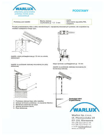 2010-10-27 Oferta handlowa - Thermoserr 2006 Nasze pasma świetlne, klapy oddymiające i klapy wentylacyjne mogą być montowane na podstawach różnego typu Podstawy pod świetliki Blacha stalowa ocynkowana gr. 1,5 - 3 mm ocynk, lakierowana wg palety RAL ocieplona Poniżej przedstawiamy kilka z wielu standardowych, najczęściej stosowanych podstaw, ale oczywiście są możliwe rozwiązania innego typu. świetlik z płytą poliwęglanową gr.16 mm na cokole żelbetowym świetlik na podstawie stalowej mocowanej do płyty żelbetowej 1. 2. 3. 4. 5. klapa dymowa z poliwęglanem gr. 10 mm świetlik na podstawie stalowej mocowanej do konstrukcji stalowej Podstawa stalowa klapy albo świetlika Izolacja termiczna podstawy ( na życzenie Klienta ) Membrana dachowa lub papa Izolacja termiczna dachu Płyta żelbetowa 17 Strona główna System Thermoserr http://thermoserr.pl/oferta_17.html 1 Klapy dymowe pneumatyczne 9 1/2