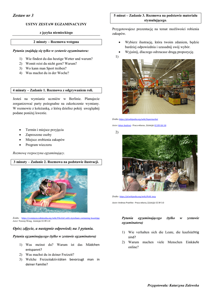 5 minut – Zadanie 3. Rozmowa na podstawie materiału stymulującego. Zestaw nr 3 USTNY ZESTAW EGZAMINACYJNY z języka niemieckiego Przygotowujesz prezentację na temat możliwości robienia zakupów. 2 minuty – Rozmowa wstępna Pytania znajdują się tylko w zestawie egzaminatora: 1) 2) 3) 4) Wie findest du das heutige Wetter und warum? Womit reist du nicht gern? Warum? Wo kann man Sport treiben? Was machst du in der Woche? Wybierz ilustrację, która twoim zdaniem, będzie bardziej odpowiednia i uzasadnij swój wybór. Wyjaśnij, dlaczego odrzucasz drugą propozycję. 1) 4 minuty – Zadanie 1. Rozmowa z odgrywaniem roli. Jesteś na wymianie uczniów w Berlinie. Planujecie zorganizować party pożegnalne na zakończenie wymiany. W rozmowie z koleżanką, z którą dzielisz pokój uwzględnij podane poniżej kwestie. Źródło: https://pl.wikipedia.org/wiki/Supermarket Autor: Artur Andrzej - Praca własna , Licencja: CC BY-SA 3.0 Termin i miejsce przyjęcia Zaproszone osoby Miejsce zrobienia zakupów Program wieczoru 2) Rozmowę rozpoczyna egzaminujący. 3 minuty – Zadanie 2. Rozmowa na podstawie ilustracji. Źródło: https://pl.wikipedia.org/wiki/Pchli_targ Autor: Andreas Praefcke - Praca własna, Licencja: CC BY 3.0 Źródło: https://commons.wikimedia.org/wiki/File:Girl_with_styrofoam_swimming_board.jpg Autor: Tommy Wong, Licencja: CC BY 2.0 Pytania egzaminującego egzaminatora) (tylko w zestawie Opisz zdjęcie, a następnie odpowiedz na 3 pytania. Pytania egzaminującego (tylko w zestawie egzaminatora) 1) Was meinst du? Warum ist das Mädchen entspannt? 2) Was machst du in deiner Freizeit? 3) Welche Freizeitaktivitäten bevorzugt man in deiner Familie? 1) Wie verhalten sich die Leute, die kaufsüchtig sind? 2) Warum machen viele Menschen Einkäufe online? Przygotowała: Katarzyna Zalewska