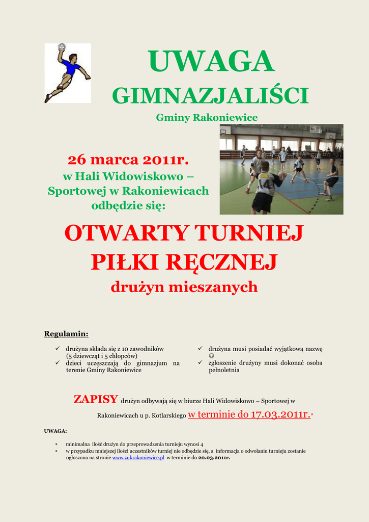 UWAGA GIMNAZJALIŚCI Gminy Rakoniewice 26 marca 2011r. w Hali Widowiskowo – Sportowej w Rakoniewicach odbędzie się: OTWARTY TURNIEJ PIŁKI RĘCZNEJ drużyn mieszanych Regulamin: drużyna składa się z 10 zawodników (5 dziewcząt i 5 chłopców) dzieci uczęszczają do gimnazjum na terenie Gminy Rakoniewice drużyna musi posiadać wyjątkową nazwę zgłoszenie drużyny musi dokonać osoba pełnoletnia ZAPISY drużyn odbywają się w biurze Hali Widowiskowo – Sportowej w Rakoniewicach u p. Kotlarskiego w terminie do 17.03.2011r.* UWAGA: minimalna ilość drużyn do przeprowadzenia turnieju wynosi 4 w przypadku mniejszej ilości uczestników turniej nie odbędzie się, a informacja o odwołaniu turnieju zostanie ogłoszona na stronie www.zukrakoniewice.pl w terminie do 20.03.2011r.