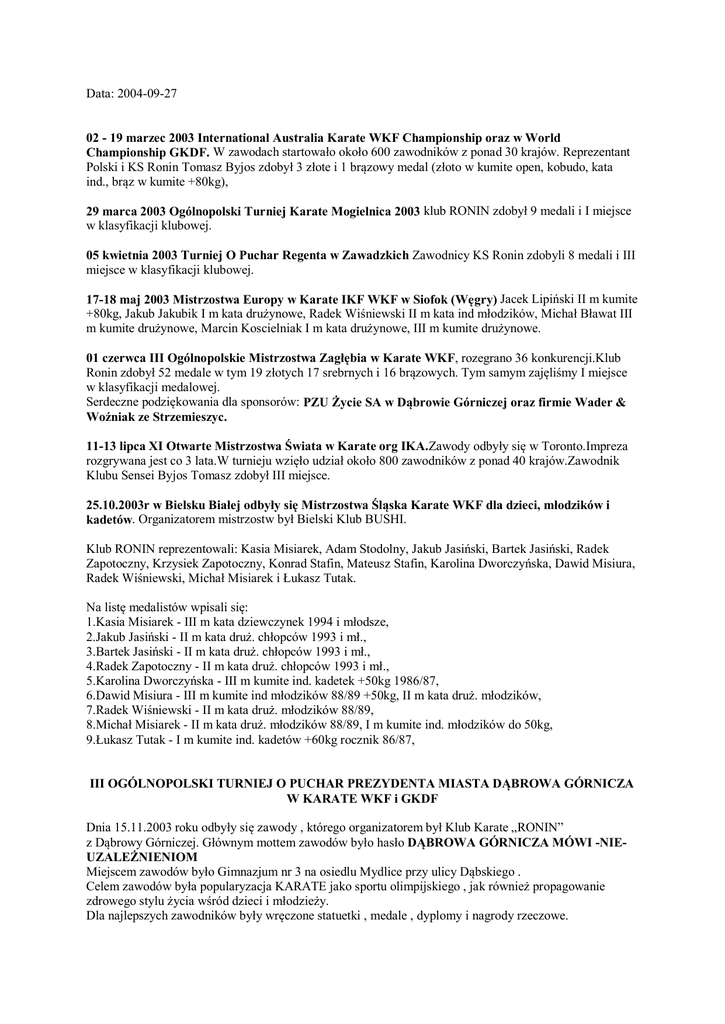 Data: 2004-09-27 02 - 19 marzec 2003 International Australia Karate WKF Championship oraz w World Championship GKDF. W zawodach startowało około 600 zawodników z ponad 30 krajów. Reprezentant Polski i KS Ronin Tomasz Byjos zdobył 3 złote i 1 brązowy medal (złoto w kumite open, kobudo, kata ind., brąz w kumite +80kg), 29 marca 2003 Ogólnopolski Turniej Karate Mogielnica 2003 klub RONIN zdobył 9 medali i I miejsce w klasyfikacji klubowej. 05 kwietnia 2003 Turniej O Puchar Regenta w Zawadzkich Zawodnicy KS Ronin zdobyli 8 medali i III miejsce w klasyfikacji klubowej. 17-18 maj 2003 Mistrzostwa Europy w Karate IKF WKF w Siofok (Węgry) Jacek Lipiński II m kumite +80kg, Jakub Jakubik I m kata drużynowe, Radek Wiśniewski II m kata ind młodzików, Michał Bławat III m kumite drużynowe, Marcin Koscielniak I m kata drużynowe, III m kumite drużynowe. 01 czerwca III Ogólnopolskie Mistrzostwa Zagłębia w Karate WKF, rozegrano 36 konkurencji.Klub Ronin zdobył 52 medale w tym 19 złotych 17 srebrnych i 16 brązowych. Tym samym zajęliśmy I miejsce w klasyfikacji medalowej. Serdeczne podziękowania dla sponsorów: PZU Życie SA w Dąbrowie Górniczej oraz firmie Wader & Woźniak ze Strzemieszyc. 11-13 lipca XI Otwarte Mistrzostwa Świata w Karate org IKA.Zawody odbyły się w Toronto.Impreza rozgrywana jest co 3 lata.W turnieju wzięło udział około 800 zawodników z ponad 40 krajów.Zawodnik Klubu Sensei Byjos Tomasz zdobył III miejsce. 25.10.2003r w Bielsku Białej odbyły się Mistrzostwa Śląska Karate WKF dla dzieci, młodzików i kadetów. Organizatorem mistrzostw był Bielski Klub BUSHI. Klub RONIN reprezentowali: Kasia Misiarek, Adam Stodolny, Jakub Jasiński, Bartek Jasiński, Radek Zapotoczny, Krzysiek Zapotoczny, Konrad Stafin, Mateusz Stafin, Karolina Dworczyńska, Dawid Misiura, Radek Wiśniewski, Michał Misiarek i Łukasz Tutak. Na listę medalistów wpisali się: 1.Kasia Misiarek - III m kata dziewczynek 1994 i młodsze, 2.Jakub Jasiński - II m kata druż. chłopców 1993 i mł., 3.Bartek Jasiński - II m kata druż. chłopców 1993 i mł., 4.Radek Zapotoczny - II m kata druż. chłopców 1993 i mł., 5.Karolina Dworczyńska - III m kumite ind. kadetek +50kg 1986/87, 6.Dawid Misiura - III m kumite ind młodzików 88/89 +50kg, II m kata druż. młodzików, 7.Radek Wiśniewski - II m kata druż. młodzików 88/89, 8.Michał Misiarek - II m kata druż. młodzików 88/89, I m kumite ind. młodzików do 50kg, 9.Łukasz Tutak - I m kumite ind. kadetów +60kg rocznik 86/87, III OGÓLNOPOLSKI TURNIEJ O PUCHAR PREZYDENTA MIASTA DĄBROWA GÓRNICZA W KARATE WKF i GKDF Dnia 15.11.2003 roku odbyły się zawody , którego organizatorem był Klub Karate „RONIN” z Dąbrowy Górniczej. Głównym mottem zawodów było hasło DĄBROWA GÓRNICZA MÓWI -NIEUZALEŻNIENIOM Miejscem zawodów było Gimnazjum nr 3 na osiedlu Mydlice przy ulicy Dąbskiego . Celem zawodów była popularyzacja KARATE jako sportu olimpijskiego , jak również propagowanie zdrowego stylu życia wśród dzieci i młodzieży. Dla najlepszych zawodników były wręczone statuetki , medale , dyplomy i nagrody rzeczowe. Do III Ogólnopolskiego Turnieju zostało zgłoszone 95 osób ( zawodników i zawodniczek). Sponsorem Głównym imprezy był Urząd Miasta w Dąbrowie Górniczej, Wydział Profilaktyki i Uzależnień który ufundował kilkadziesiąt nagród dla dzieci. Składamy podziękowania na ręce Pani Chętkowskiej. Kluby Karate biorące udział w zawodach : 1. JISSEN OTWOCK 2. BUSHI BIELSKO BIAŁA 3. WASHIDE GRODKÓW 4. UKS ŁÓDŹ 5. SHINDO CIESZYN 6. RONIN DĄBROWA GÓRNICZA Klub Sportowy „RONIN” zdobył łącznie 30 medali , z czego 11 złotych , 9 srebrnych i 10 brązowych. Zostały wręczone statuetki dla najlepszego zawodnika turnieju , którym został Jakubik Jakub z Klubu Karate „Ronin” , oraz dla najmłodszego uczestnika , którym została Karolina Byjos urodzona 09.08.1997 roku z Klubu Karate „Washide” Grodków . Zestawienie medalistów Klubu Sportowego Ronin : ZŁOTY MEDAL - Jakubik Jakub - kumite r. 85 do 87 , kata ind. r. 85 do 87 , kobudo r. 85 / 88 Misiura Anna - kumite r. 85 do 87 , kata ind. r. 85 do 87 Misiura Dawid - kumite r. 88 / 89 , kata ind. r. 88 / 89 , Misiarek Katarzyna - kata ind. r. 94 i młodsze Zapotoczny Radek - kata drużynowe r. 92 i młodsi , kobudo r. 93 i młodsi Jasiński Bartek - kata drużynowe r. 92 i młodsi Białas Mateusz - kata drużynowe r. 92 i młodsi Wiśniewski Radek - kobudo r. 89 do 92 SREBRNY MEDAL – Jakubik Jakub - kata drużynowe r. 85 do 87 Misiura Dawid - kata drużynowe r. 85 do 87 , kata drużynowe r. 88 / 89 Tutak Łukasz - kumite r. 85 do 87 Dworczyńska Karolina - kumite r. 85 do 87 Misiarek Michał - kumite r. 88 / 89 , kata drużynowe r. 88 / 89 Krajewska Angelika - kata ind. r. 85 do 87 Wiśniewski Radosław - kata drużynowe r. 85 do 87 , kata drużynowe r. 88 / 89 Zapotoczny Krzysztof - kata drużynowe r. 90 / 91 , kobudo r. 89 do 92 Zapotoczny Radek - kata drużynowe r. 90 / 91 Białas Michał - kata drużynowe r. 90 / 91 Jasiński Bartek - kobudo r. 93 i młodsi BRĄZOWY MEDAL – Misiura Dawid - kobudo r. 85 do 88 Misiura Anna - kobudo r. 85 do 88 Krajewska Angelika - kumite r. 85 do 87 Dworczyńska Karolina - kata ind. r. 85 do 87 Zapotoczny Krzysztof - kata ind. r. 90 / 91 Zapotoczny Radosław - kata ind. r. 92 / 93 Misiarek Michał - kobudo r. 89 do 92 Misiarek Katarzyna - kata drużynowe r. 92 i młodsi Prus Michał - kata drużynowe r. 92 i młodsi Stodolny Adam - kata drużynowe r. 92 i młodsi , kobudo r. 93 i młodsi Białas Mateusz - kobudo r. 93 i młodsi Zestawienie medalowe wszystkich drużyn : MEDALE Miejsce Nazwa Klubu ZŁOTO SREBRO BRĄZ 1. RONIN Dąbrowa Górnicza11 9 10 2. BUSHI Bielsko Biała 3 4 11 3. SHINDO Cieszyn 3 4 3 4. UKS Łódź 2 1 4 5. WASHIDE Grodków 1 1 5 6. JISSEN Otwock 1 1 3 Europa Cup WKF Europan Karate Federation Siofok Węgry 6-7.12.2003 Reprezentanci GKDF Polska (Global Karate Do 