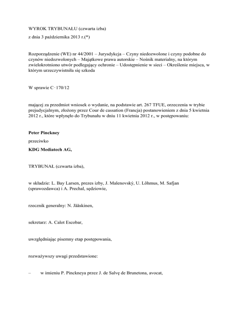 WYROK TRYBUNAŁU (czwarta izba) z dnia 3 października 2013 r.(*) Rozporządzenie (WE) nr 44/2001 – Jurysdykcja – Czyny niedozwolone i czyny podobne do czynów niedozwolonych – Majątkowe prawa autorskie – Nośnik materialny, na którym zwielokrotniono utwór podlegający ochronie – Udostępnienie w sieci – Określenie miejsca, w którym urzeczywistniła się szkoda W sprawie C‑170/12 mającej za przedmiot wniosek o wydanie, na podstawie art. 267 TFUE, orzeczenia w trybie prejudycjalnym, złożony przez Cour de cassation (Francja) postanowieniem z dnia 5 kwietnia 2012 r., które wpłynęło do Trybunału w dniu 11 kwietnia 2012 r., w postępowaniu: Peter Pinckney przeciwko KDG Mediatech AG, TRYBUNAŁ (czwarta izba), w składzie: L. Bay Larsen, prezes izby, J. Malenovský, U. Lõhmus, M. Safjan (sprawozdawca) i A. Prechal, sędziowie, rzecznik generalny: N. Jääskinen, sekretarz: A. Calot Escobar, uwzględniając pisemny etap postępowania, rozważywszy uwagi przedstawione: – w imieniu P. Pinckneya przez J. de Salvę de Brunetona, avocat, – w imieniu rządu francuskiego przez G. de Bergues’a i B. Beaupère‑Manokhę, działających w charakterze pełnomocników, – w imieniu rządu greckiego przez S. Chalę, działającą w charakterze pełnomocnika, – w imieniu rządu austriackiego przez C. Pesendorfer, działającą w charakterze pełnomocnika, – w imieniu rządu polskiego przez B. Majczynę i M. Szpunara, działających w charakterze pełnomocników, – w imieniu Komisji Europejskiej przez A.M. Rouchaud‑Joët, działającą w charakterze pełnomocnika, po zapoznaniu się z opinią rzecznika generalnego na posiedzeniu w dniu 13 czerwca 2013 r., wydaje następujący Wyrok 1 Wniosek o wydanie orzeczenia w trybie prejudycjalnym dotyczy wykładni art. 5 pkt 3 rozporządzenia Rady (WE) nr 44/2001 z dnia 22 grudnia 2000 r. w sprawie jurysdykcji i uznawania orzeczeń sądowych oraz ich wykonywania w sprawach cywilnych i handlowych (Dz.U. L 12, s. 1, zwanego dalej „rozporządzeniem”). 2 Wniosek ten został złożony w ramach sporu między P. Pinckneyem, zamieszkałym we Francji, a KDG Mediatech AG (zwaną dalej „spółką Mediatech”), spółką z siedzibą w Austrii, w przedmiocie żądania odszkodowania z tytułu naruszenia majątkowych praw autorskich P. Pinckneya, jakiego miała się dopuścić wspomniana spółka. Ramy prawne Rozporządzenie 3 Motywy 2, 11, 12 i 15 rozporządzenia stwierdzają: „(2) Różnice pomiędzy przepisami poszczególnych państw o jurysdykcji i uznawaniu orzeczeń utrudniają należyte funkcjonowanie rynku wewnętrznego. Dlatego nieodzownym jest wydanie przepisów celem ujednolicenia przepisów o jurysdykcji w sprawach cywilnych i handlowych oraz uproszczenia formalności ze względu na szybkie i nieskomplikowane uznawanie i wykonywanie orzeczeń z państw członkowskich związanych niniejszym rozporządzeniem. […] (11) Przepisy o jurysdykcji powinny być w wysokim stopniu przewidywalne i powinny zależeć zasadniczo od miejsca zamieszkania pozwanego, a tak ustalona jurysdykcja powinna mieć miejsce zawsze, z wyjątkiem kilku dokładnie określonych przypadków, w których ze względu na przedmiot sporu lub umowę stron uzasadnione jest inne kryterium powiązania. Siedziba osób prawnych musi być zdefiniowana wprost w rozporządzeniu celem wzmocnienia przejrzystości wspólnych przepisów i uniknięcia konfliktów kompetencyjnych. (12) Jurysdykcja oparta na łączniku miejsca zamieszkania powinna zostać uzupełniona jurysdykcją opartą na innych łącznikach, które powinny zostać dopuszczone ze względu na ścisły związek pomiędzy sądem a sporem prawnym lub w interesie prawidłowego wymiaru sprawiedliwości. […] (15) W interesie zgodnego [jednolitości] wymiaru sprawiedliwości należy unikać tak dalece, jak jest to tylko możliwe, równoległych postępowań, aby w dwóch państwach członkowskich nie zapadały niezgodne ze sobą orzeczenia […]”. 4 Przepisy o jurysdykcji ujęte są w rozdziale II rozporządzenia, który obejmuje art. 2–31. 5 Artykuł 2 rozporządzenia, który wchodzi w skład sekcji 1 rozdziału II, zatytułowanej „Przepisy ogólne”, ma następujące brzmienie: „Z zastrzeżeniem przepisów niniejszego rozporządzenia osoby mające miejsce zamieszkania na terytorium państwa członkowskiego mogą być pozywane, niezależnie od ich obywatelstwa, przed sądy tego państwa członkowskiego”. 6 Artykuł 3 rozporządzenia, zawarty w tej samej sekcji, stanowi w ust. 1: „Osoby mające miejsce zamieszkania na terytorium państwa członkowskiego mogą być pozywane przed sądy innego państwa członkowskiego tylko zgodnie z przepisami sekcji 2–7 niniejszego rozdziału”. 7 W sekcji 2 rozdziału II rozporządzenia, zatytułowanej „Jurysdykcja szczególna”, znajduje się między innymi jego art. 5. Artykuł ten w pkt 3 przewiduje, że: „Osoba, która ma miejsce zamieszkania na terytorium państwa członkowskiego, może być pozwana w innym państwie członkowskim: […] 3) jeżeli przedmiotem postępowania jest czyn niedozwolony lub czyn podobny do czynu niedozwolonego albo roszczenia wynikające z takiego czynu – przed sąd miejsca, gdzie nastąpiło lub może nastąpić zdarzenie wywołujące szkodę”. Dyrektywa 2001/29/WE 8 Dyrektywa 2001/29/WE Parlamentu Europejskiego i Rady z dnia 22 maja 2001 r. w sprawie harmonizacji niektórych aspektów praw autorskich i pokrewnych w społeczeństwie informacyjnym (Dz.U. L 167, s. 10) zawiera rozdział II, zatytułowany „Prawa i wyjątki”, w którym mieszczą się między innymi art. 2–4, dotyczące, odpowiednio, prawa do publicznego udostępniania utworów i prawa podawania do publicznej wiadomości innych przedmiotów objętych ochroną oraz prawa do rozpowszechniania. Postępowanie główne i pytania prejudycjalne 9 Peter Pinckney, zamieszkały w Tuluzie (Francja), twierdzi, że jest autorem, kompozytorem i wykonawcą dwunastu p