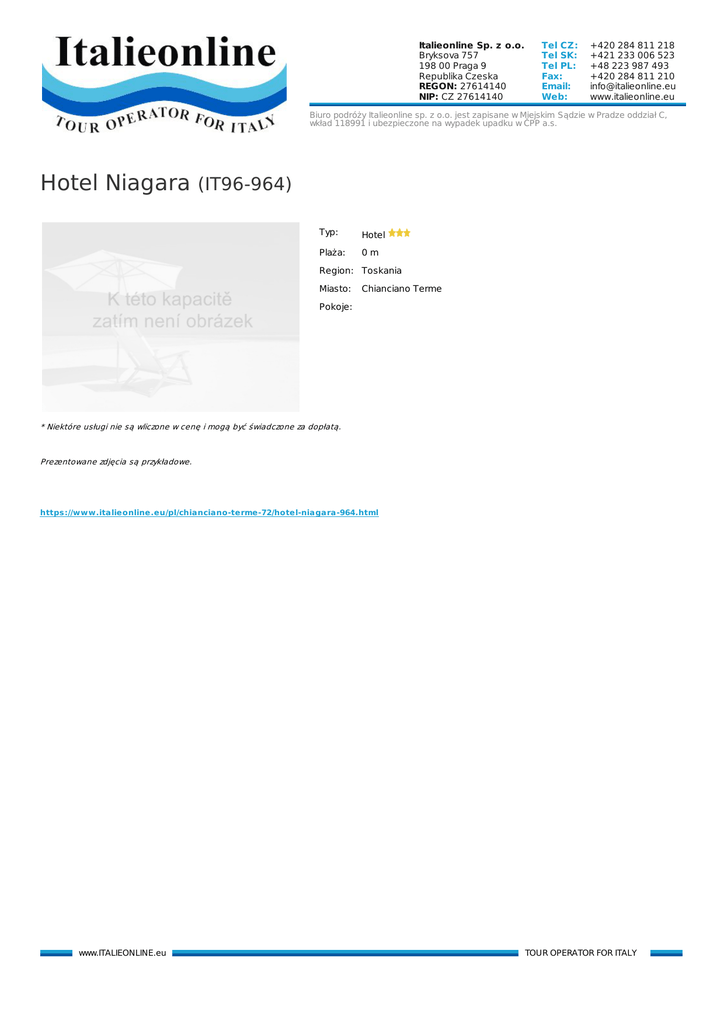 Italieonline Sp. z o.o. Bryksova 757 198 00 Praga 9 Republika Czeska REGON: 27614140 NIP: CZ 27614140 Tel CZ: Tel SK: Tel PL: Fax: Email: Web: +420 284 811 218 +421 233 006 523 +48 223 987 493 +420 284 811 210 [email protected] www.italieonline.eu Biuro podróży Italieonline sp. z o.o. jest zapisane w Miejskim Sądzie w Pradze oddział C, wkład 118991 i ubezpieczone na wypadek upadku w ČPP a.s. Hotel Niagara (IT96-964) Typ: Hotel Plaża: 0m Region: Toskania Miasto: Chianciano Terme Pokoje: * Niektóre usługi nie są wliczone w cenę i mogą być świadczone za dopłatą. Prezentowane zdjęcia są przykładowe. https://www.italieonline.eu/pl/chianciano-terme-72/hotel-niagara-964.html www.ITALIEONLINE.eu TOUR OPERATOR FOR ITALY