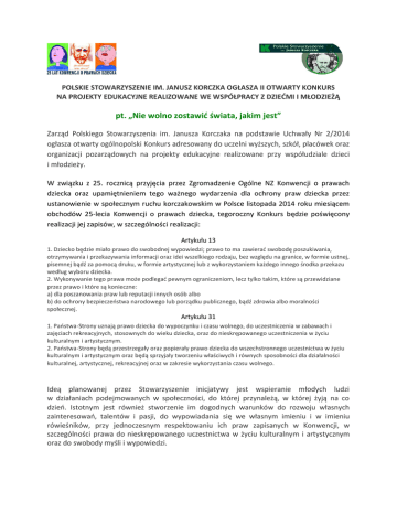 POLSKIE STOWARZYSZENIE IM. JANUSZ KORCZKA OGŁASZA II OTWARTY KONKURS NA PROJEKTY EDUKACYJNE REALIZOWANE WE WSPÓŁPRACY Z DZIEĆMI I MŁODZIEŻĄ pt. „Nie wolno zostawić świata, jakim jest” Zarząd Polskiego Stowarzyszenia im. Janusza Korczaka na podstawie Uchwały Nr 2/2014 ogłasza otwarty ogólnopolski Konkurs adresowany do uczelni wyższych, szkół, placówek oraz organizacji pozarządowych na projekty edukacyjne realizowane przy współudziale dzieci i młodzieży. W związku z 25. rocznicą przyjęcia przez Zgromadzenie Ogólne NZ Konwencji o prawach dziecka oraz upamiętnieniem tego ważnego wydarzenia dla ochrony praw dziecka przez ustanowienie w społecznym ruchu korczakowskim w Polsce listopada 2014 roku miesiącem obchodów 25-lecia Konwencji o prawach dziecka, tegoroczny Konkurs będzie poświęcony realizacji jej zapisów, w szczególności realizacji: Artykułu 13 1. Dziecko będzie miało prawo do swobodnej wypowiedzi; prawo to ma zawierać swobodę poszukiwania, otrzymywania i przekazywania informacji oraz idei wszelkiego rodzaju, bez względu na granice, w formie ustnej, pisemnej bądź za pomocą druku, w formie artystycznej lub z wykorzystaniem każdego innego środka przekazu według wyboru dziecka. 2. Wykonywanie tego prawa może podlegać pewnym ograniczeniom, lecz tylko takim, które są przewidziane przez prawo i które są konieczne: a) dla poszanowania praw lub reputacji innych osób albo b) do ochrony bezpieczeństwa narodowego lub porządku publicznego, bądź zdrowia albo moralności społecznej. Artykułu 31 1. Państwa-Strony uznają prawo dziecka do wypoczynku i czasu wolnego, do uczestniczenia w zabawach i zajęciach rekreacyjnych, stosownych do wieku dziecka, oraz do nieskrępowanego uczestniczenia w życiu kulturalnym i artystycznym. 2. Państwa-Strony będą przestrzegały oraz popierały prawo dziecka do wszechstronnego uczestnictwa w życiu kulturalnym i artystycznym oraz będą sprzyjały tworzeniu właściwych i równych sposobności dla działalności kulturalnej, artystycznej, rekreacyjnej oraz w zakresie wykorzystania czasu wolnego. Ideą planowanej przez Stowarzyszenie inicjatywy jest wspieranie młodych ludzi w działaniach podejmowanych w społeczności, do której przynależą, w której żyją na co dzień. Istotnym jest również stworzenie im dogodnych warunków do rozwoju własnych zainteresowań, talentów i pasji, do wypowiadania się we własnym imieniu i w imieniu rówieśników, przy jednoczesnym respektowaniu ich praw zapisanych w Konwencji, w szczególności prawa do nieskrępowanego uczestnictwa w życiu kulturalnym i artystycznym oraz do swobody myśli i wypowiedzi. Uczestniczenie w konkursie i tworzenie projektów ma być też okazją do wprowadzania korzystnych zmian w swoim otoczeniu, do „wzięcia spraw w swoje ręce”, do podążania za myślą Janusza Korczaka: „Nie wolno zostawić świata, jakim jest”. Projekty składane na Konkurs winny nawiązywać do postaci i idei Janusza Korczaka – wielkiego humanisty, lekarza, pisarza, filozofa, pedagoga, a przede wszystkim prekursora podmiotowego traktowania dziecka, o którego prawa i interesy dopominał się przez całe swoje życie. Celem konkursu jest upowszechnianie i wdrażanie zapisów Konwencji o prawach dziecka oraz promowanie dorobku pedagogicznego i twórczego Janusza Korczaka poprzez aktywizację dzieci i młodzieży do: podejmowania własnych inicjatyw w promowaniu i upowszechnianiu praw dziecka, budowania różnego rodzaju samorządności w środowisku lokalnym, tworzenia własnych form wypowiedzi i komunikacji społecznej, również przy użyciu środków artystycznego wyrazu, kształtowania umiejętności uczestniczenia w życiu społecznym i w kulturze, rozwijania zainteresowań i talentów, organizacji czasu wolnego. Szczególnie cenne dla organizatorów Konkursu będą projekty: integrujące działalność różnych instytucji i grup społecznych, np.: projekty wielopokoleniowe, angażujące środowisko lokalne, włączające osoby z niepełnosprawnością, wykorzystujące nowe technologie. Koniecznym warunkiem, jaki projekt winien spełniać jest współudział dzieci i młodzieży od momentu jego tworzenia, poprzez realizację i ocenę efektów projektu. Projekt powinien być realizowany w listopadzie 2014 roku. Podmiot zgłaszający swój udział w Konkursie może złożyć nie więcej niż dwa wnioski aplikacyjne. Nadesłane projekty będą oceniane przez specjalnie do tego celu powołane Jury. Organizatorzy przewidują również nadanie nagrody przez uczestników Konkursu dla jednego z projektów wyłonionego drogą plebiscytu przeprowadzonego na stronie internetowej Polskiego Stowarzyszenia im. Janusza Korczaka. Do udziału w plebiscycie Jury wybierze 10 najwyżej ocenionych projektów. Polskie Stowarzyszenie im. Janusza Korczaka przyzna nagrody dla laureatów konkursu w postaci dofinansowania do realizacji projektów do 3000 zł. Dotacja nie może przekroczyć 80% kosztów realizacji projektu, tzn. wnioskodawcy muszą zapewnić ze środków własnych (lub z innych źródeł) co najmniej 20% udziału. Wnioski aplikacyjne należy składać do 20 września 2014 roku (liczy się data stempla pocztowego) w 2 egzemplarzach: w formie papierowej na adres korespondencyjny Stowarzyszenia im. Janusza Korczaka: ul. Białobrzeska 15/56, 02-370 Warszawa, z dopiskiem: Konkurs na projekty edukacyjne „Nie wolno zostawiać świata takim, jakim jest - 2014” oraz w drugim egzemplarzu w formie elektronicznej na adres e-mail: [email protected]. Wniosek aplikacyjny Harmonogram Konkursu Karta oceny projektów1 1 Pozostałe dokumenty takie jak: umowa podpisywana z laureatem, wzór sprawozdania, ankieta ewaluacyjna zostaną przekazane podmiotom, które otrzymają dotację.