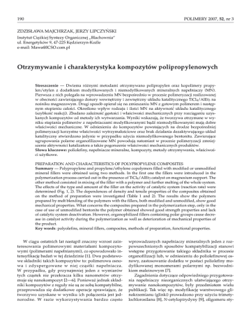 POLIMERY 2007, 52, nr 3 190 ZDZIS£AWA MAJCHRZAK, JERZY LIPCZYÑSKI Instytut Ciê¿kiej Syntezy Organicznej „Blachownia” ul. Energetyków 9, 47-225 Kêdzierzyn-KoŸle e-mail: [email protected] Otrzymywanie i charakterystyka kompozytów polipropylenowych Streszczenie — Dwiema ró¿nymi metodami otrzymywano polipropylen oraz kopolimery propylen/etylen z dodatkiem modyfikowanych i niemodyfikowanych mineralnych nape³niaczy (MN). Pierwsza z nich polega³a na wprowadzeniu MN bezpoœrednio w procesie polimeryzacji realizowanej w obecnoœci zawieraj¹cego donory wewnêtrzny i zewnêtrzny uk³adu katalitycznego TiCl4/AlEt3 na noœniku magnezowym. Drugi sposób opiera³ siê na zmieszaniu MN z gotowym polimerem i nastêpnym stopieniu ca³oœci. Okreœlono wp³yw rodzaju i iloœci MN na aktywnoœæ uk³adu katalitycznego (szybkoœæ reakcji). Zbadano zale¿noœæ gêstoœci i w³aœciwoœci mechanicznych przy rozci¹ganiu uzyskanych kompozytów od metody ich wytwarzania. Wyniki wskazuj¹, ¿e tworzywa otrzymane w wyniku stapiania polimerów z nape³niaczami modyfikowanymi b¹dŸ niemodyfikowanymi maj¹ dobre w³aœciwoœci mechaniczne. W odniesieniu do kompozytów powstaj¹cych na drodze bezpoœredniej polimeryzacji korzystne w³aœciwoœci wytrzyma³oœciowe oraz brak dzia³ania dezaktywuj¹cego uk³ad katalityczny stwierdzono jedynie w przypadku u¿ycia niemodyfikowanego bentonitu. Zawieraj¹ce ugrupowania polarne organofilizowane MN powoduj¹ natomiast w procesie polimeryzacji zmniejszenie aktywnoœci katalizatora a tak¿e pogorszenie w³aœciwoœci mechanicznych produktów. S³owa kluczowe: poliolefiny, nape³niacze mineralne, kompozyty, metody otrzymywania, w³aœciwoœci u¿ytkowe. PREPARATION AND CHARACTERISTICS OF POLYPROPYLENE COMPOSITES Summary — Polypropylene and propylene/ethylene copolymers filled with modified or unmodified mineral fillers were obtained using two methods. In the first one the fillers were introduced in the polymerization process carried out in the presence of TiCl4/AlEt3 catalyst on magnesium support. The other method consisted in mixing of the filler with a polymer and further melting of the whole system. The effects of the type and amount of the filler on the activity of catalytic system (reaction rate) were determined (Fig. 1, 2). The dependences of density and tensile properties of the composites obtained on the method of preparation were investigated (Table 1 and 2). The results show the polymers prepared by melt blending of the polymers with the fillers, both modified and unmodified, show good mechanical properties. What concerns the composites prepared in the polymerization step, only in the case of use of unmodified bentonite the polymer obtained showed good strength properties and lack of catalytic system deactivation. However, organophilized fillers containing polar groups cause decrease in catalyst activity during the polymerization as well as deterioration of mechanical properties of the product. Key words: polyolefins, mineral fillers, composites, methods of preparation, functional properties. W ci¹gu ostatnich lat nast¹pi³ znaczny wzrost zainteresowania polimerowymi materia³ami kompozytowymi (polimerami nape³nianymi), co spowodowa³o intensyfikacjê badañ w tej dziedzinie [1]. Dwa podstawowe sk³adniki takich kompozytów to: polimerowa osnowa i zdyspergowane w niej cz¹stki nape³niacza. W przypadku, gdy przynajmniej jeden z wymiarów tych cz¹stek nie przekracza kilku nanometrów otrzymuje siê nanokompozyt [2—6]. Poniewa¿ jednak sk³adniki kompozytów z regu³y nie s¹ ze sob¹ kompatybilne, przeprowadza siê dodatkowe operacje sprawiaj¹ce, ¿e tworzywo uzyskane w wyniku ich po³¹czenia jest jednorodne. W razie wykorzystywania bardzo czêsto wprowadzanych nape³niaczy mineralnych jeden z rozpowszechnionych sposobów kompatybilizacji stanowi wstêpne przygotowanie takiego sk³adnika w procesie organofilizacji lub, w odniesieniu do poliolefinowej osnowy, zastosowanie dodatku w postaci poliolefiny modyfikowanej monomerami polarnymi np. bezwodnikiem maleinowym [7]. Zagadnienia dotycz¹ce odpowiedniego przygotowania nape³niaczy nieorganicznych u³atwiaj¹cego otrzymywanie nanokompozytów, by³y przedmiotem wielu publikacji. Tak wiêc np. modyfikacjê warstwowego glinokrzemianu (glinki) prowadzono przy u¿yciu trimetylochlorosilanu [8], N-cetylopirydyny [9], oligomeru sty- POLIMERY 2007, 52, nr 3 renu lub metakrylanu metylu [10] b¹dŸ czwartorzêdowej soli amoniowej [11, 12]. Do organofilizacji kaolinitu stosowano sulfotlenek dimetylowy, metanol albo oktadecyloaminê [13]. Odrêbnym sposobem otrzymywania nape³nionych poliolefin jest proces polimeryzacji w obecnoœci nape³niacza. Na przyk³ad, podczas polimeryzacji etylenu na katalizatorach metalocenowych modyfikowane i niemodyfikowane krzemiany dodawano do œrodowiska reakcji [14], a podczas polimeryzacji propylenu stanowi³y one sk³adnik katalizatorów Zieglera-Natty [15]. Przedmiotem naszej referowanej poni¿ej pracy by³y kompozyty polipropylenowe. Badaniami objêto ich syntezê w procesie polimeryzacji propylenu lub jego kopolimeryzacji z etylenem pod wp³ywem wysoce aktywnego heterogenicznego katalizatora tytanowego na noœniku magnezowym (MgCl2) z udzia³em ftalanu dibutylowego jako donora wewnêtrznego (Dw) w obecnoœci modyfikowanych i niemodyfikowanych nape³niaczy a tak¿e ocenê w³aœciwoœci uzyskanych w ten sposób nape³nionych polimerów. CZÊŒÆ DOŒWIADCZALNA 191 reaktorze pojemnoœci 250 cm3 (pojemnoœæ robocza 100 cm3) z zamkniêciem œrubowym, wyposa¿onym w kapilary ze stali kwasoodpornej doprowadzaj¹ce argon oraz propylen lub uk³ad propylen + etylen, a tak¿e przewód odpowietrzaj¹cy (z zamontowanym na nim manometrem). Do mieszania œrodowiska reakcji s³u¿y³o teflonowe mieszad³o magnetyczne o regulowanej szybkoœci obrotów, a temperaturê mierzono miernikiem cyfrowym z termopar¹ Fe-Co. Do suchego odtlenionego reaktora w temp. 25 oC wprowadzano kolejn