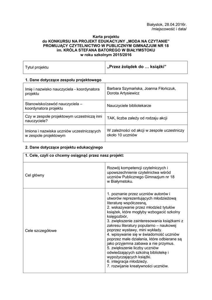 Białystok, 28.04.2016r. /miejscowość i data/ Karta projektu do KONKURSU NA PROJEKT EDUKACYJNY „MODA NA CZYTANIE” PROMUJĄCY CZYTELNICTWO W PUBLICZNYM GIMNAZJUM NR 18 im. KRÓLA STEFANA BATOREGO W BIAŁYMSTOKU w roku szkolnym 2015/2016 Tytuł projektu „Przez żołądek do … książki” 1. Dane dotyczące zespołu projektowego Imię i nazwisko nauczyciela - koordynatora projektu Barbara Szymańska, Joanna Fiłończuk, Dorota Artysiewicz Stanowisko/zawód nauczyciela – koordynatora projektu Nauczyciele bibliotekarze Czy w zespole projektowym uczestniczą inni nauczyciele? TAK, liczba zależy od rodzaju akcji Imiona i nazwiska uczniów uczestniczących w zespole projektowym W zależności od akcji w zespole uczestniczy około 10 uczniów 2. Dane dotyczące projektu edukacyjnego 1. Cele, czyli co chcemy osiągnąć przez nasz projekt: Cel główny Rozwój kompetencji czytelniczych i upowszechnienie czytelnictwa wśród uczniów Publicznego Gimnazjum nr 18 w Białymstoku. Cele szczegółowe 1. poznanie przez uczniów autorów i utworów reprezentujących młodzieżową literaturę współczesną, 2. wskazywanie przez młodzież tytułów książek, które mogłyby wzbogacić szkolny księgozbiór, 3. zwiększenie zainteresowania książkami z zakresu literatury popularno – naukowej poprzez wystawy, mini wykłady. 4. wpisywanie się w świadomość uczniów poprzez małe działania, które odbierane są jako przyjemna zabawa a nie przymus. 5. zwiększenie liczby uczniów odwiedzających szkolną bibliotekę i wypożyczających książki. 6. integracja młodzieży. 7. rozwijanie kreatywności uczniów. 2. Rodzaj projektu 3. Metody pracy 4. Formy pracy 5. Szacunkowy czas potrzebny do realizacji badawczy X czytelniczy X edukacyjny X społeczny medialny X analiza danych X praca w grupie X metoda grup dyskusyjnych metody aktywizujące X metody plastyczne metody ruchowe X praca z komputerem praca z tekstem X praca z zastosowaniem nowoczesnych technologii (aparat fotograficzny, kamera, itp.) X sondaż diagnostyczny X techniki manualne warsztaty wywiady inne (jakie – mini wykład) X X X X X indywidualna międzyklasowa w grupach w grupach uczniowsko-rodzicielskich w zespole klasowym inne (jakie - ………………………………….) wrzesień 2015 - kwiecień 2016 6. Opis realizacji projektu: 1. ustalenie planu działań projektowych (IX 2015). 2. ustalenie składu grupy uczniów do Etap I – Przygotowanie i planowanie poszczególnych akcji odpowiedzialnych za projektu (diagnoza potrzeb, informacje przygotowanie imprezy (2 tygodnie przed wstępne, działania przygotowawcze, każdą akcją). wprowadzenie, opracowanie planu realizacji 3. poszukiwanie różnorodnych informacji projektu i in.) merytorycznych niezbędnych do przeprowadzenia akcji (2 tygodnie przed każdą akcją). 1. wykonanie plastyczno - techniczne elementów gazetek (2 tygodnie przed każdą akcją, jeśli do danej akcji jest potrzebna). 2. przygotowanie wypożyczalni i czytelni do kawiarenki literackiej (przeddzień akcji). 3. przygotowanie oraz zakup naczyń jednorazowych (tacki, łyżeczki, kubeczki, serwetki) i środków czystości niezbędnych do każdej akcji (tydzień przed imprezą). 4. przeprowadzenie ankiety diagnozującej (początek XI 2015r.). 5. zaplanowanie terminów zakupów owoców Etap II – Realizacja projektu (opis i słodyczy potrzebnych do realizacji poszczególnych działań i podejmowanych przedsięwzięcia (tydzień przed akcją). 6. ustalenie liczby uczniów przygotowujących czynności) ciasta i ciasteczka(tydzień przed akcją). 7. ustalenie chętnego fotoreportera akcji (tydzień przed imprezą). 8. ustalenie i wybranie oprawy dźwiękowej imprezy (2 dni przed akcją). 9. zaplanowanie i przygotowanie odpowiednich książek do wypożyczeń. (przeddzień akcji). 10 przedstawienie nowości czytelniczych (w dniu imprezy). 11. umieszczenie informacji na stronie www szkoły (kilka dni po akcji). Etap III – Ewaluacja (ocena) projektu 1.Uczniowie wypożyczają częściej i więcej książek. 2. Dzieci dzielą się między sobą informacjami o treści przeczytanych książek. 3. Młodzież zapisuje się w kolejce po nowości czytelnicze dostępne w bibliotece. 4. Biblioteka staje się miejscem spotkań towarzyskich. 5. Gimnazjaliści chętnie odwiedzają bibliotekę, dopytując o kolejne działania. 6. Młodzież dostarcza tytuły książek, którymi jest zainteresowana. 7. Uczennice, działające w Kole Miłośników Biblioteki Szkolnej, uaktywniły działania recenzyjne książek. 8. Pod wpływem pozytywnych recenzji wyrażanych przez uczennice z Koła Miłośników Biblioteki Szkolnej Dyrektor Szkoły w miarę możliwości finansuje zakup książek 9.W roku szkolnym 2015/2016 zakupiliśmy dzięki wszystkim akcjom i dofinansowaniu 107 nowości czytelniczych. 10. Gimnazjaliści dobrowolnie deklarują chęć udziału w kolejnych przedsięwzięciach bibliotecznych. 11. Młodzież nabywa umiejętności potrzebnych w życiu codziennym (nabierają odwagi w relacjach z innymi ludźmi oraz rozwijają kreatywność). 7. Zaangażowanie rodziców w realizację projektu Prosimy określić, czy rodzice byli zaangażowani w realizację projektu: X Tak Nie Szczegółowy opis zaangażowania rodziców w poszczególne etapy działań projektowych: Pomagali dzieciom przygotować ciasta na akcje, sponsorowali produkty żywnościowe, niezbędne do wypieku. Rada Rodziców przydzieliła środki na zakup świeżych owoców, nagród, potrzebnych do realizowania poszczególnych zadań. Przede wszystkim zaś sfinansowała zakup nowości czytelniczych na kwotę 650 zł. 8. Dodatkowe informacje: Akcje są prowadzone regularnie od 3 lat. Informujemy o nich poprzez ogłoszenia rozwieszone na terenie szkoły i przez uczniów, którzy zapraszają bezpośrednio wychowawców i ich klasy. Przewrotny tytuł odnosi się do faktu, że miłość można zdobywać powoli, imając się różnych sposobów. Wybrałyśmy akcje, zakład