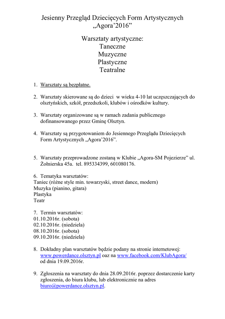 Jesienny Przegląd Dziecięcych Form Artystycznych „Agora’2016” Warsztaty artystyczne: Taneczne Muzyczne Plastyczne Teatralne 1. Warsztaty są bezpłatne. 2. Warsztaty skierowane są do dzieci w wieku 4-10 lat uczęszczających do olsztyńskich, szkół, przedszkoli, klubów i ośrodków kultury. 3. Warsztaty organizowane są w ramach zadania publicznego dofinansowanego przez Gminę Olsztyn. 4. Warsztaty są przygotowaniem do Jesiennego Przeglądu Dziecięcych Form Artystycznych „Agora’2016”. 5. Warsztaty przeprowadzone zostaną w Klubie „Agora-SM Pojezierze” ul. Żołnierska 45a. tel. 895334399, 601080176. 6. Tematyka warsztatów: Taniec (różne style min. towarzyski, street dance, modern) Muzyka (pianino, gitara) Plastyka Teatr 7. Termin warsztatów: 01.10.2016r. (sobota) 02.10.2016r. (niedziela) 08.10.2016r. (sobota) 09.10.2016r. (niedziela) 8. Dokładny plan warsztatów będzie podany na stronie internetowej: www.powerdance.olsztyn.pl oaz na www.facebook.com/KlubAgora/ od dnia 19.09.2016r. 9. Zgłoszenia na warsztaty do dnia 28.09.2016r. poprzez dostarczenie karty zgłoszenia, do biura klubu, lub elektronicznie na adres [email protected].