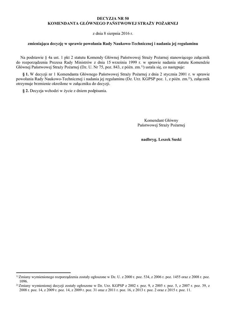 DECYZJA NR 50 KOMENDANTA GŁÓWNEGO PAŃSTWOWEJ STRAŻY POŻARNEJ z dnia 8 sierpnia 2016 r. zmieniająca decyzję w sprawie powołania Rady Naukowo-Technicznej i nadania jej regulaminu Na podstawie § 4a ust. 1 pkt 2 statutu Komendy Głównej Państwowej Straży Pożarnej stanowiącego załącznik do rozporządzenia Prezesa Rady Ministrów z dnia 15 września 1999 r. w sprawie nadania statutu Komendzie Głównej Państwowej Straży Pożarnej (Dz. U. Nr 75, poz. 843, z późn. zm.1)) ustala się, co następuje: § 1. W decyzji nr 1 Komendanta Głównego Państwowej Straży Pożarnej z dnia 2 stycznia 2001 r. w sprawie powołania Rady Naukowo-Technicznej i nadania jej regulaminu (Dz. Urz. KGPSP poz. 1, z późn. zm.2)), załącznik otrzymuje brzmienie określone w załączniku do decyzji. § 2. Decyzja wchodzi w życie z dniem podpisania. Komendant Główny Państwowej Straży Pożarnej nadbryg. Leszek Suski 1) Zmiany wymienionego rozporządzenia zostały ogłoszone w Dz. U. z 2000 r. poz. 534, z 2006 r. poz. 1455 oraz z 2008 r. poz. 1096. 2) Zmiany wymienionej decyzji zostały ogłoszone w Dz. Urz. KGPSP z 2002 r. poz. 9, z 2005 r. poz. 5, z 2007 r. poz. 39, z 2008 r. poz. 14, z 2009 r. poz. 14, z 2009 r. poz. 31 oraz z 2011 r. poz. 16, z 2013 r. poz. 2 oraz z 2015 r. poz. 11. Załącznik do Decyzji Nr 50 Komendanta Głównego Państwowej Straży Pożarnej z dnia 8 sierpnia 2016 r. SKŁAD OSOBOWY I KADENCJA RADY NAUKOWO-TECHNICZNEJ § 1. W skład osobowy Rady Naukowo -Technicznej wchodzą: 1. Przewodniczący Rady st. bryg. mgr inż. Marek Jasiński Zastępca Komendanta Głównego PSP 2. Wiceprzewodniczący Rady nadbryg. mgr inż. Gustaw Mikołajczyk Zastępca Komendanta Głównego PSP nadbryg. mgr inż. Ryszard Dąbrowa Komendant – Rektor Szkoły Głównej Służby Pożarniczej 3. Sekretarz Rady st. bryg. dr inż. Paweł Janik Dyrektor Biura Rozpoznawania Zagrożeń KG PSP 4. Członkowie Rady dr hab. inż. kpt. ż.w. Zbigniew J. Burciu profesor nadzw. Akademii Morskiej w Gdyni Akademia Morska w Gdyni Wydział Nawigacyjny Katedra Eksploatacji Statku st. bryg. mgr inż. Janusz Halak Kujawsko-Pomorski Komendant Wojewódzki PSP bryg. mgr inż. Jarosław Wlazłowski Łódzki Komendant Wojewódzki PSP bryg. mgr inż. Stanisław Nowak Małopolski Komendant Wojewódzki PSP st. bryg. mgr Jarosław Kurek Mazowiecki Komendant Wojewódzki PSP bryg. mgr Adam Czajka Świętokrzyski Komendant Wojewódzki PSP st. bryg. mgr inż. Jarosław Hołubowicz Warmińsko - Mazurski Komendant Wojewódzki PSP bryg. dr inż. Dariusz Wróblewski Dyrektor Centrum Naukowo-Badawczego Ochrony Przeciwpożarowej – Państwowego Instytutu Badawczego im. Józefa Tuliszkowskiego st. bryg. dr inż. Bogusław Kogut Komendant Szkoły Aspirantów w Krakowie st. bryg. dr inż. Grzegorz Stankiewicz Komendant Szkoły Aspirantów w Poznaniu mł. bryg. mgr Piotr Placek Komendant Centralnej Szkoły PSP w Częstochowie st. bryg. mgr inż. Marek Miś Komendant Szkoły Podoficerskiej PSP w Bydgoszczy bryg. mgr inż. Jacek Borowski Dyrektor Biura Szkolenia KG PSP st. bryg. mgr inż. Tadeusz Jopek Dyrektor Krajowego Centrum Koordynacji Ratownictwa i Ochrony Ludności KG PSP st. bryg. mgr inż. Waldemar Maliński Dyrektor Biura ds. Ochrony Ludności i Obrony Cywilnej KG PSP bryg. mgr inż. Tomasz Kołodziejczyk Dyrektor Biura Współpracy Międzynarodowej KG PSP st. bryg. mgr inż. Tomasz Zając Dyrektor Biura Kadr i Organizacji KG PSP st. bryg. mgr inż. Andrzej Oklesiński Dyrektor Biura Logistyki KG PSP st. bryg. mgr inż. Jan Tajduś Dyrektor Biura Kontroli, Skarg i Wniosków KG PSP § 2. Kadencja Rady w składzie wymienionym w § 1 wygasa w dniu 31 grudnia 2017 r.