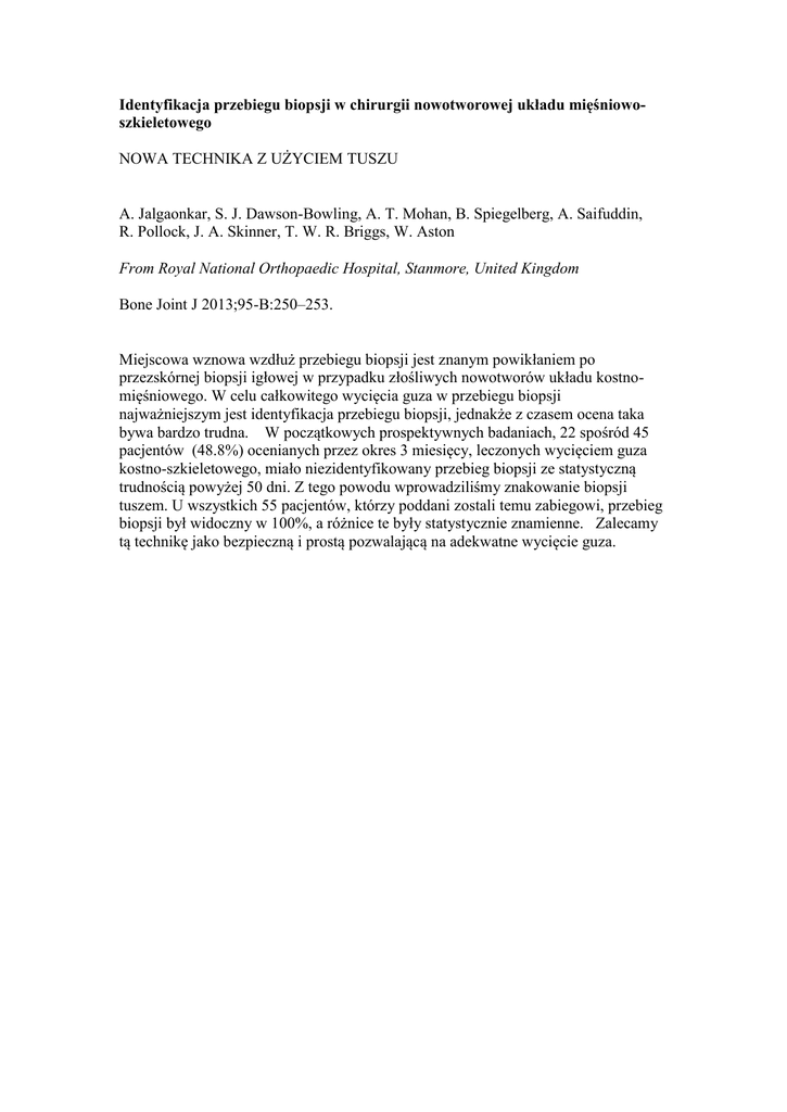 Identyfikacja przebiegu biopsji w chirurgii nowotworowej układu mięśniowoszkieletowego NOWA TECHNIKA Z UŻYCIEM TUSZU A. Jalgaonkar, S. J. Dawson-Bowling, A. T. Mohan, B. Spiegelberg, A. Saifuddin, R. Pollock, J. A. Skinner, T. W. R. Briggs, W. Aston From Royal National Orthopaedic Hospital, Stanmore, United Kingdom Bone Joint J 2013;95-B:250–253. Miejscowa wznowa wzdłuż przebiegu biopsji jest znanym powikłaniem po przezskórnej biopsji igłowej w przypadku złośliwych nowotworów układu kostnomięśniowego. W celu całkowitego wycięcia guza w przebiegu biopsji najważniejszym jest identyfikacja przebiegu biopsji, jednakże z czasem ocena taka bywa bardzo trudna. W początkowych prospektywnych badaniach, 22 spośród 45 pacjentów (48.8%) ocenianych przez okres 3 miesięcy, leczonych wycięciem guza kostno-szkieletowego, miało niezidentyfikowany przebieg biopsji ze statystyczną trudnością powyżej 50 dni. Z tego powodu wprowadziliśmy znakowanie biopsji tuszem. U wszystkich 55 pacjentów, którzy poddani zostali temu zabiegowi, przebieg biopsji był widoczny w 100%, a różnice te były statystycznie znamienne. Zalecamy tą technikę jako bezpieczną i prostą pozwalającą na adekwatne wycięcie guza.