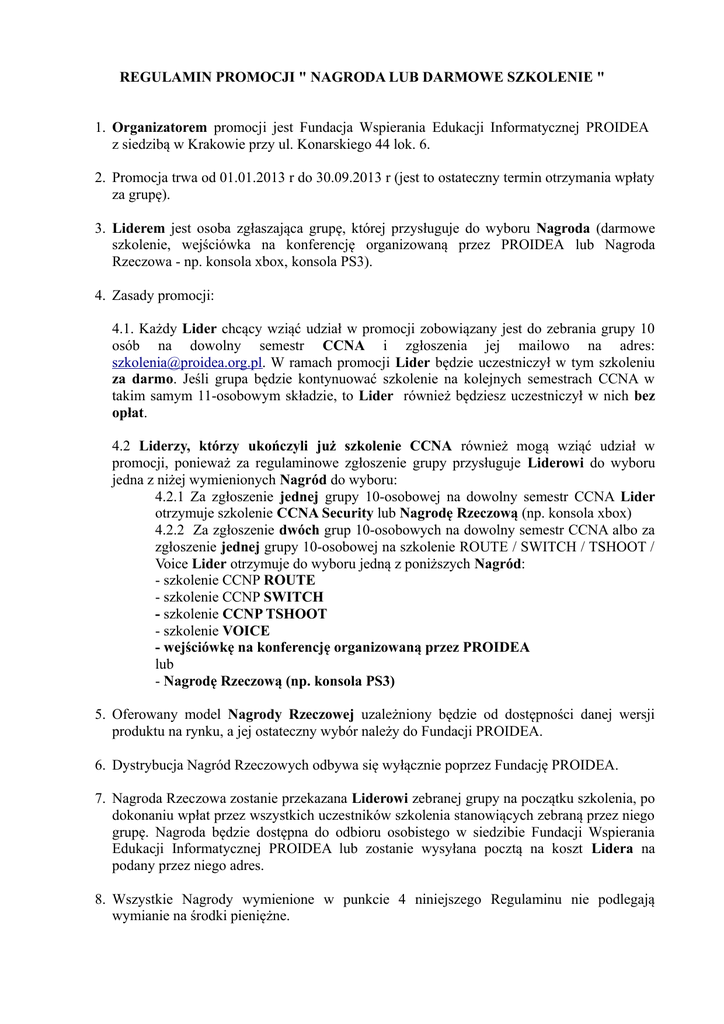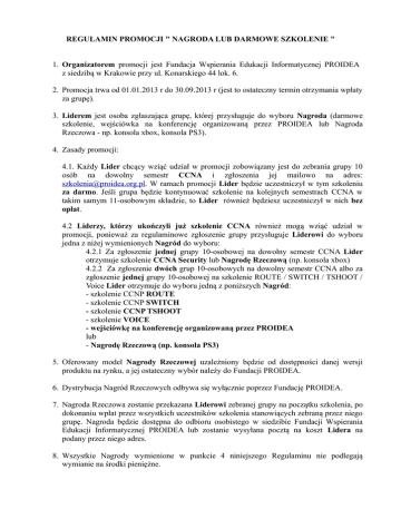 REGULAMIN PROMOCJI " NAGRODA LUB DARMOWE SZKOLENIE " 1. Organizatorem promocji jest Fundacja Wspierania Edukacji Informatycznej PROIDEA z siedzibą w Krakowie przy ul. Konarskiego 44 lok. 6. 2. Promocja trwa od 01.01.2013 r do 30.09.2013 r (jest to ostateczny termin otrzymania wpłaty za grupę). 3. Liderem jest osoba zgłaszająca grupę, której przysługuje do wyboru Nagroda (darmowe szkolenie, wejściówka na konferencję organizowaną przez PROIDEA lub Nagroda Rzeczowa - np. konsola xbox, konsola PS3). 4. Zasady promocji: 4.1. Każdy Lider chcący wziąć udział w promocji zobowiązany jest do zebrania grupy 10 osób na dowolny semestr CCNA i zgłoszenia jej mailowo na adres: [email protected]. W ramach promocji Lider będzie uczestniczył w tym szkoleniu za darmo. Jeśli grupa będzie kontynuować szkolenie na kolejnych semestrach CCNA w takim samym 11-osobowym składzie, to Lider również będziesz uczestniczył w nich bez opłat. 4.2 Liderzy, którzy ukończyli już szkolenie CCNA również mogą wziąć udział w promocji, ponieważ za regulaminowe zgłoszenie grupy przysługuje Liderowi do wyboru jedna z niżej wymienionych Nagród do wyboru: 4.2.1 Za zgłoszenie jednej grupy 10-osobowej na dowolny semestr CCNA Lider otrzymuje szkolenie CCNA Security lub Nagrodę Rzeczową (np. konsola xbox) 4.2.2 Za zgłoszenie dwóch grup 10-osobowych na dowolny semestr CCNA albo za zgłoszenie jednej grupy 10-osobowej na szkolenie ROUTE / SWITCH / TSHOOT / Voice Lider otrzymuje do wyboru jedną z poniższych Nagród: - szkolenie CCNP ROUTE - szkolenie CCNP SWITCH - szkolenie CCNP TSHOOT - szkolenie VOICE - wejściówkę na konferencję organizowaną przez PROIDEA lub - Nagrodę Rzeczową (np. konsola PS3) 5. Oferowany model Nagrody Rzeczowej uzależniony będzie od dostępności danej wersji produktu na rynku, a jej ostateczny wybór należy do Fundacji PROIDEA. 6. Dystrybucja Nagród Rzeczowych odbywa się wyłącznie poprzez Fundację PROIDEA. 7. Nagroda Rzeczowa zostanie przekazana Liderowi zebranej grupy na początku szkolenia, po dokonaniu wpłat przez wszystkich uczestników szkolenia stanowiących zebraną przez niego grupę. Nagroda będzie dostępna do odbioru osobistego w siedzibie Fundacji Wspierania Edukacji Informatycznej PROIDEA lub zostanie wysyłana pocztą na koszt Lidera na podany przez niego adres. 8. Wszystkie Nagrody wymienione w punkcie 4 niniejszego Regulaminu nie podlegają wymianie na środki pieniężne. 9. Fundacja PROIDEA nie ponosi odpowiedzialności za Nagrody Rzeczowe, które zostały utracone lub uszkodzone po ich przekazaniu Liderowi. 10.Liderowi nie przysługują żadne roszczenia w stosunku do Fundacji PROIDEA z tytułu utraty (w tym również kradzieży) lub zniszczenia Nagrody Rzeczowej. 11.Szkolenia realizowane będą zgodnie z obowiązującymi regulaminem realizacji szkoleń w Fundacji Wspierania Edukacji Informatycznej PROIDEA w ustalonych wcześniej godzinach. 12.Fundacja Wspierania Edukacji Informatycznej PROIDEA zastrzega sobie prawo odwołania lub przerwania Promocji, w przypadku zaistnienia okoliczności niezależnych od niej, uniemożliwiających jej realizację lub dalsze kontynuowanie. 13.Oferta może łączyć się z innymi promocjami. 14.Niniejszy Regulamin może zostać zmieniony przez Fundacja Wspierania Edukacji Informatycznej PROIDEA w dowolnej chwili. Aktualna wersja regulaminu jest zawsze publikowana na www.proidea.org.pl.