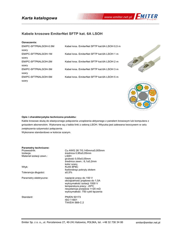 Karta katalogowa ___________________________________________________________________________ Kabele krosowe EmiterNet SFTP kat. 6A LSOH Oznaczenia: EM/PC-SFTP6ALSOH-0.5M Kabel kros. EmiterNet SFTP kat.6A LSOH 0,5 m szary EM/PC-SFTP6ALSOH-1M Kabel kros. EmiterNet SFTP kat.6A LSOH 1 m szary EM/PC-SFTP6ALSOH-2M Kabel kros. EmiterNet SFTP kat.6A LSOH 2 m szary EM/PC-SFTP6ALSOH-3M Kabel kros. EmiterNet SFTP kat.6A LSOH 3 m szary EM/PC-SFTP6ALSOH-5M Kabel kros. EmiterNet SFTP kat.6A LSOH 5 m szary Opis i charakterystyka techniczna produktu: Kable krosowe służą do elastycznego połączenia urządzenia aktywnego z panelem krosowym lub komputera z gniazdem abonenckim. Wykonane są z kabla linki z osłoną LSOH. Wtyczka jest zalewana tworzywem w celu zwiększenia sztywności połączenia. Wykonane standardowo w kolorze szarym. Parametry techniczne: Przewodnik: Izolacja: Materiał izolacji zewn.: Wtyk: Tolerancja długości: Cu AWG 26 7/0,145mm±0,005mm średnica 0,95±0,05mm LS0H grubość 0,55±0,05mm średnica zewn.: 6,1±0,2mm kolor szary RJ45 8P8C fosforobrąz pokryty złotem ±0,5% Parametry elektryczne: napięcie pracy do 150 V obciążalność prądowa do 1,5A wytrzymałość izolacji 1000 V temperatura pracy: -20ºC resystancja przejścia <=20 mΩ wytrzymałość: 750 cykli łączenia Standard: PN/EN 50173 ISO 11801 TIA/EIA 568-C.2 Emiter Sp. z o. o., ul. Porcelanowa 27, 40-241 Katowice, POLSKA, tel. +48 32 730 34 00 [email protected] Karta katalogowa ___________________________________________________________________________ Dołożyliśmy wszelkich starań, aby przedstawione informacje były rzetelne i kompletne. Jednak nie ponosimy odpowiedzialności za dokładność i kompletność danych oraz w szczególności nie możemy zagwarantować, że niniejsza specyfikacja nie zawiera błędów lub pomyłek. Informacje zawarte w niniejszej specyfikacji mogą zostać zmienione w każdej chwili bez powiadomienia. Emiter Sp. z o. o., ul. Porcelanowa 27, 40-241 Katowice, POLSKA, tel. +48 32 730 34 00 [email protected]