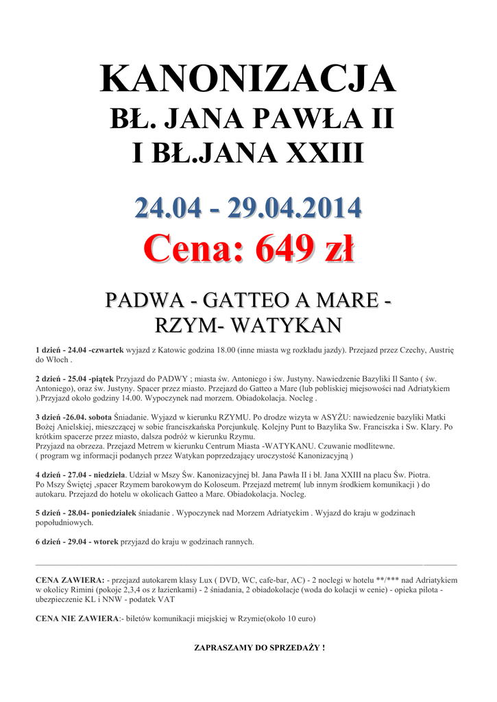 KANONIZACJA BŁ. JANA PAWŁA II I BŁ.JANA XXIII 24.04 - 29.04.2014 Cena: 649 zł PADWA - GATTEO A MARE RZYM- WATYKAN 1 dzień - 24.04 -czwartek wyjazd z Katowic godzina 18.00 (inne miasta wg rozkładu jazdy). Przejazd przez Czechy, Austrię do Włoch . 2 dzień - 25.04 -piątek Przyjazd do PADWY ; miasta św. Antoniego i św. Justyny. Nawiedzenie Bazyliki Il Santo ( św. Antoniego), oraz św. Justyny. Spacer przez miasto. Przejazd do Gatteo a Mare (lub pobliskiej miejsowości nad Adriatykiem ).Przyjazd około godziny 14.00. Wypoczynek nad morzem. Obiadokolacja. Nocleg . 3 dzień -26.04. sobota Śniadanie. Wyjazd w kierunku RZYMU. Po drodze wizyta w ASYŻU: nawiedzenie bazyliki Matki Bożej Anielskiej, mieszczącej w sobie franciszkańska Porcjunkulę. Kolejny Punt to Bazylika Sw. Franciszka i Sw. Klary. Po krótkim spacerze przez miasto, dalsza podróż w kierunku Rzymu. Przyjazd na obrzeza. Przejazd Metrem w kierunku Centrum Miasta -WATYKANU. Czuwanie modlitewne. ( program wg informacji podanych przez Watykan poprzedzający uroczystość Kanonizacyjną ) 4 dzień - 27.04 - niedziela. Udział w Mszy Św. Kanonizacyjnej bł. Jana Pawła II i bł. Jana XXIII na placu Św. Piotra. Po Mszy Świętej ,spacer Rzymem barokowym do Koloseum. Przejazd metrem( lub innym środkiem komunikacji ) do autokaru. Przejazd do hotelu w okolicach Gatteo a Mare. Obiadokolacja. Nocleg. 5 dzień - 28.04- poniedziałek śniadanie . Wypoczynek nad Morzem Adriatyckim . Wyjazd do kraju w godzinach popołudniowych. 6 dzień - 29.04 - wtorek przyjazd do kraju w godzinach rannych. _____________________________________________________________________________________________________ CENA ZAWIERA: - przejazd autokarem klasy Lux ( DVD, WC, cafe-bar, AC) - 2 noclegi w hotelu **/*** nad Adriatykiem w okolicy Rimini (pokoje 2,3,4 os z łazienkami) - 2 śniadania, 2 obiadokolacje (woda do kolacji w cenie) - opieka pilota ubezpieczenie KL i NNW - podatek VAT CENA NIE ZAWIERA:- biletów komunikacji miejskiej w Rzymie(około 10 euro) ZAPRASZAMY DO SPRZEDAŻY !