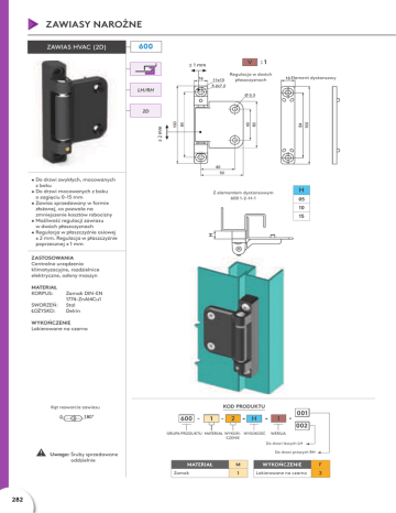 ZAWIASY NAROŻNE ZAWIAS HVAC (2D) 600 :1 V Regulacja w dwóch płaszczyznach Element dystansowy LH/RH 2D • Do drzwi zwykłych, mocowanych z boku • Do drzwi mocowanych z boku o zagięciu 0-15 mm • Zawias sprzedawany w formie złożonej, co pozwala na zmniejszenie kosztów robocizny • Możliwość regulacji zawiasu w dwóch płaszczyznach • Regulacja w płaszczyźnie osiowej ± 2 mm. Regulacja w płaszczyźnie poprzecznej ± 1 mm H Z elementem dystansowym 600 1-2-H-1 05 10 15 ZASTOSOWANIA Centralne urządzenia klimatyzacyjne, rozdzielnice elektryczne, osłony maszyn MATERIAŁ KORPUS: SWORZEŃ: ŁOŻYSKO: Zamak DIN-EN 1774-ZnAl4Cu1 Stal Delrin WYKOŃCZENIE Lakierowane na czarno KOD PRODUKTU Kąt rozwarcia zawiasu 600 1 1 H 2 GRUPA PRODUKTU MATERIAŁ WYKOŃ- WYSOKOŚĆ CZENIE 001 002 WERSJA Do drzwi lewych LH Uwaga: Śruby sprzedawane oddzielnie Do drzwi prawych RH MATERIAŁ Zamak 282 M WYKOŃCZENIE F 1 Lakierowane na czarno 2