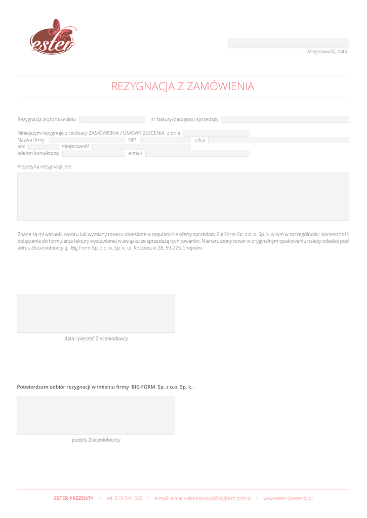 Miejscowość, data REZYGNACJA Z ZAMÓWIENIA Rezygnacja złożona w dniu nr faktury/paragonu sprzedaży Niniejszym rezygnuję z realizacji ZAMÓWIENIA / UMOWY ZLECENIA z dnia Nazwa firmy NIP kod miejscowość telefon kontaktowy e-mail ulica Przyczyną rezygnacji jest Znane są mi warunki zwrotu lub wymiany towaru określone w regulaminie oferty sprzedaży Big Form Sp. z o. o. Sp. k. w tym w szczególności: konieczność dołączenia do formularza faktury wystawionej w związku ze sprzedażą tych towarów. Nienaruszony towar w oryginalnym opakowaniu należy odesłać pod adres Zleceniobiorcy tj. Big Form Sp. z o. o. Sp. k. ul. Kościuszki 28, 59-225 Chojnów. data i pieczęć Zleceniodawcy Potwierdzam odbiór rezygnacji w imieniu firmy BIG FORM Sp. z o.o. Sp. k.. podpis Zleceniobiorcy ESTER PREZENTY / tel. 519 541 532 / e-mail: [email protected] / www.ester-prezenty.pl