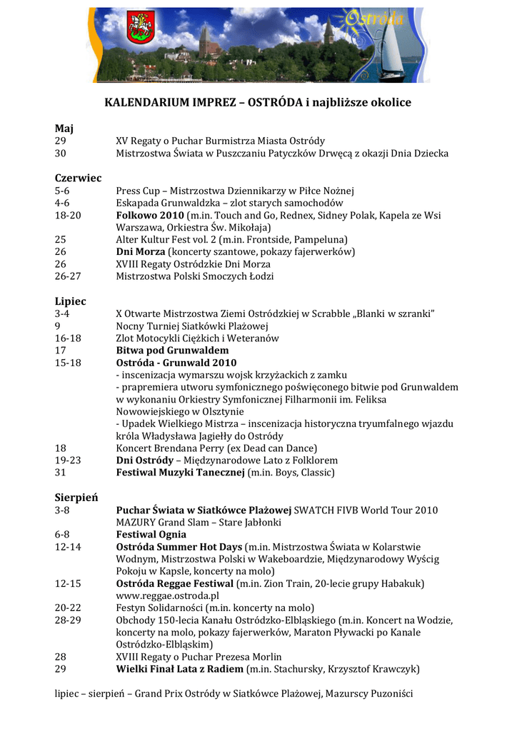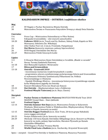 KALENDARIUM IMPREZ – OSTRÓDA i najbliższe okolice Maj 29 30 Czerwiec 5‐6 4‐6 18‐20 25 26 26 26‐27 Lipiec 3‐4 9 16‐18 17 15‐18 18 19‐23 31 Sierpień 3‐8 6‐8 12‐14 12‐15 20‐22 28‐29 XV Regaty o Puchar Burmistrza Miasta Ostródy Mistrzostwa Świata w Puszczaniu Patyczków Drwęcą z okazji Dnia Dziecka Press Cup – Mistrzostwa Dziennikarzy w Piłce Nożnej Eskapada Grunwaldzka – zlot starych samochodów Folkowo 2010 (m.in. Touch and Go, Rednex, Sidney Polak, Kapela ze Wsi Warszawa, Orkiestra Św. Mikołaja) Alter Kultur Fest vol. 2 (m.in. Frontside, Pampeluna) Dni Morza (koncerty szantowe, pokazy fajerwerków) XVIII Regaty Ostródzkie Dni Morza Mistrzostwa Polski Smoczych Łodzi X Otwarte Mistrzostwa Ziemi Ostródzkiej w Scrabble „Blanki w szranki” Nocny Turniej Siatkówki Plażowej Zlot Motocykli Ciężkich i Weteranów Bitwa pod Grunwaldem Ostróda Grunwald 2010 ‐ inscenizacja wymarszu wojsk krzyżackich z zamku ‐ prapremiera utworu symfonicznego poświęconego bitwie pod Grunwaldem w wykonaniu Orkiestry Symfonicznej Filharmonii im. Feliksa Nowowiejskiego w Olsztynie ‐ Upadek Wielkiego Mistrza – inscenizacja historyczna tryumfalnego wjazdu króla Władysława Jagiełły do Ostródy Koncert Brendana Perry (ex Dead can Dance) Dni Ostródy – Międzynarodowe Lato z Folklorem Festiwal Muzyki Tanecznej (m.in. Boys, Classic) Puchar Świata w Siatkówce Plażowej SWATCH FIVB World Tour 2010 MAZURY Grand Slam – Stare Jabłonki Festiwal Ognia Ostróda Summer Hot Days (m.in. Mistrzostwa Świata w Kolarstwie Wodnym, Mistrzostwa Polski w Wakeboardzie, Międzynarodowy Wyścig Pokoju w Kapsle, koncerty na molo) Ostróda Reggae Festiwal (m.in. Zion Train, 20‐lecie grupy Habakuk) www.reggae.ostroda.pl Festyn Solidarności (m.in. koncerty na molo) Obchody 150‐lecia Kanału Ostródzko‐Elbląskiego (m.in. Koncert na Wodzie, koncerty na molo, pokazy fajerwerków, Maraton Pływacki po Kanale Ostródzko‐Elbląskim) XVIII Regaty o Puchar Prezesa Morlin Wielki Finał Lata z Radiem (m.in. Stachursky, Krzysztof Krawczyk) 28 29 lipiec – sierpień – Grand Prix Ostródy w Siatkówce Plażowej, Mazurscy Puzoniści