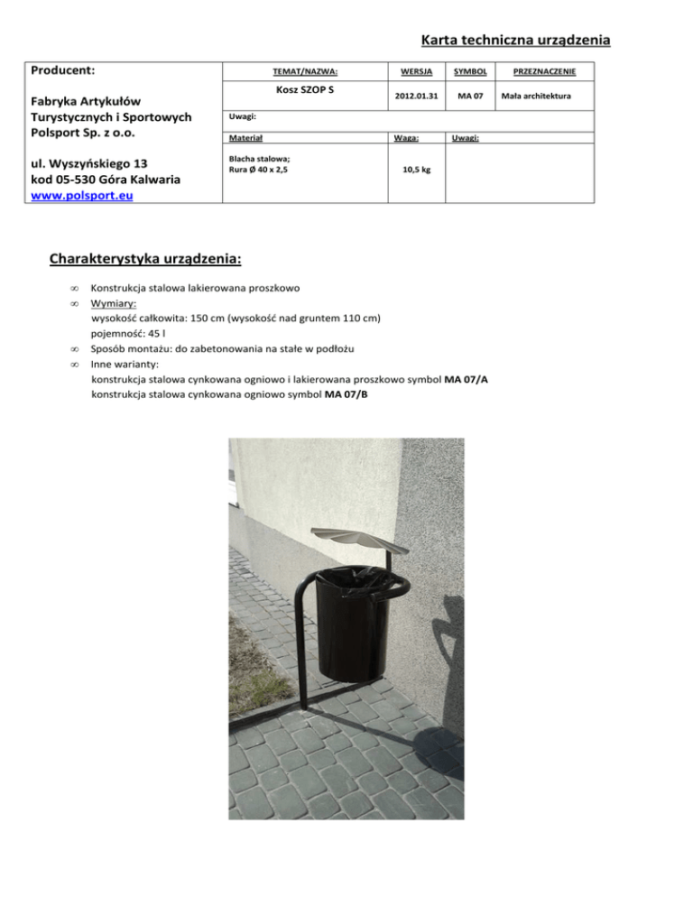 Karta techniczna urządzenia Producent: TEMAT/NAZWA: Kosz SZOP S Fabryka Artykułów Turystycznych i Sportowych Polsport Sp. z o.o. ul. Wyszyńskiego 13 kod 05-530 Góra Kalwaria www.polsport.eu WERSJA SYMBOL 2012.01.31 MA 07 Uwagi: Materiał Blacha stalowa; Rura Ø 40 x 2,5 Waga: Uwagi: 10,5 kg Charakterystyka urządzenia: • • • • Konstrukcja stalowa lakierowana proszkowo Wymiary: wysokość całkowita: 150 cm (wysokość nad gruntem 110 cm) pojemność: 45 l Sposób montażu: do zabetonowania na stałe w podłożu Inne warianty: konstrukcja stalowa cynkowana ogniowo i lakierowana proszkowo symbol MA 07/A konstrukcja stalowa cynkowana ogniowo symbol MA 07/B PRZEZNACZENIE Mała architektura
