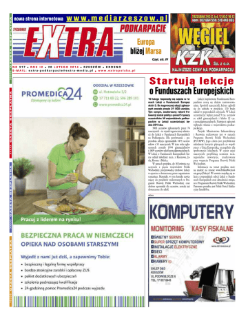 G A Z E TA B E Z P Ł AT N A ááááá G A Z E TA B E Z P Ł AT N A ááááá G A Z E TA B E Z P Ł AT N A ááááá G A Z E TA B E Z P Ł AT N A ááááá nowa strona internetowa www.mediarzeszow.pl Europa bliżej Marsa Czyt. str. IV NR 317 l ROK IX l 20 LUTEGO 2014 l RZESZÓW l KROSNO E-MAIL: [email protected] l www.extrapolska.pl Startują lekcje o Funduszach Europejskich 10 lutego rozpoczęły się zajęcia w ramach Lekcji o Funduszach Europejskich 3. Do tegorocznej edycji zgłoszonych zostało prawie 21 000 uczniów. Tym samym, zeszłoroczny rekord frekwencji został pobity o ponad 5 tysięcy uczestników. W województwie podkarpackim w Lekcji uczestniczyć będzie 251 klas. 5803 uczniów zgłoszonych przez 74 nauczycieli – to wynik tegorocznej rekrutacji do Lekcji o Funduszach Europejskich na Podkarpaciu. Dla porównania – poprzednia edycja zgromadziła 4175 uczestników i 55 nauczycieli. W tym roku zgłoszonych zostało 1994 gimnazjalistów i 3809 uczniów szkół ponadgimnazjalnych. W Lekcji o Funduszach Europejskich bierze udział młodzież m.in. z Rzeszowa, Jasła, Krosna i Mielca. W ramach projektu, do 30 kwietnia nauczyciele z pięciu województw Polski Wschodniej przeprowadzą tytułowe Lekcje w oparciu o dostarczony przez organizatora scenariusz. Materiały, w tym komiks nawiązujący do projektów realizowanych w Programie Rozwój Polski Wschodniej oraz drobne upominki dla uczniów, zostały już dostarczone do szkół. reklama Lekcje inspirowane Funduszami Europejskimi cieszą się dużym zainteresowaniem. Spośród nauczycieli, którzy zgłosili się do udziału w projekcie, 130 brało udział w poprzednich edycjach. W Lekcji uczestniczyć będzie ponad 9 tys. uczniów ze szkół gimnazjalnych i blisko 12 tys. z ponadgimnazjalnych. Najwięcej zgłoszeń wpłynęło właśnie z województwa podkarpackiego. Projekt Ministerstwa Infrastruktury i Rozwoju realizowany jest w ramach Programu Rozwój Polski Wschodniej (PO RPW). Jego celem jest przybliżenie młodzieży korzyści płynących ze współpracy z Unią Europejską, szczególnie dla społeczności lokalnych. W czasie zajęć nauczyciele przybliżają uczniom m.in. re gio nal ne inwe stycje, zre ali zowa ne przy wsparciu Programu Rozwój Polski Wschodniej. Informacje na temat projektu można znaleźć na stronie www.PolskaWschodnia.gov.pl/lekcja3. W serwisie znajdują się relacje z poprzednich edycji Lekcji o Funduszach Europejskich oraz aktualności związane z Programem Rozwój Polski Wschodniej. Patronem projektu jest Polski Portal Edukacyjny Interkl@sa. 2 extra PODKARPACIE Kurczakowe nowości w McDonald’s®! 12 lutego w menu McDonald’s pojawiły się trzy zupełnie nowe pozycje z kurczakiem – McChicken Podwójny, McChicken Curry oraz McChicken Śródziemnomorski. Do oferty wracają Kanapka Szefa Kuchni oraz brokuły. McChicken Podwójny to propozy- cja dla gości głodnych wyjątkowych smaków. Dwa kotlety Chicken Premiere przedzielone serem cheddar dopełnia sałata batawia z pikantnym i kanapkowym sosem. McChicken Curry to soczysty kurczak w towarzystwie sosu curry, który przeniesie wszystkich smakoszy w świat Orientu. Całość uzupełniają świeża sałata i pikle, a to wszystko w otoczeniu dobrze znanej bułki. McChicken Śródziemnomorski charakteryzuje smak wprost z Południa. Rozpływający się w ustach pyszny kurczak z sosem balsamico, serem cheddar, pomidorem i świeżą rukolą zwieńcza niepowtarzalny sos śródziemnomorski. Kanapka Szefa Kuchni to znakomite połączenie wybornego mięsa wołowego i wyśmienitych grillowanych pieczarek. Do tego świeży pomidor w otoczeniu dwóch plasterków sera emmentaler i wspaniałe sosy. Wszystkim smakoszom z pewnością przypadną do gustu brokuły, czyli zdrowa przekąska w złocistej, chrupiącej panierce podawana z sosem śmietanowym. Zapraszamy na fanpage McDonald’s Polska https://www. facebook. com/McDonaldsPolska i www.mcdonalds.pl. Aby otrzymać podwójne zaproszenia na zestaw w McDonald’s prosimy dzwonić do redakcji 20 lutego, o godz. 10. Zaproszenia można zrealizować w dowolnej restauracji McDonald’s. Reklama tel. 17 852 10 06, 603 790 207 [email protected] czwartek, 20 lutego 2014 extra PODKARPACIE 3 4 extra PODKARPACIE POLSAT JimJam patronem zimowej kampanii „Bez kasku nie jadę” Nawyk prawidłowego zakładania kasku pozwala w znaczący sposób ograniczyć zagrożenia związane z urazami głowy. Dlatego też podczas zimowej kampanii „Bez kasku nie jadę” liczne przedszkola i szkoły zapraszane są do organizowania lekcji związanych z tematyką bezpieczeństwa. Ponadto, do włączenia się w kampanię zachęcane są także szkółki narciarskie, takie jak zakopiańska Strama. A w jaki sposób ułatwić dzieciom zapamiętanie zasad zachowania bezpieczeństwa na śniegu czy lodzie? Oczywiście poprzez zabawę! POLSAT JimJam przygotował w ramach kampanii „Bez kasku nie jadę” rymowany dekalog bezpiecznego szusowania oraz odpowiedniego zachowania w czasie uciech na stoku. Taki kodeks z pewnością przyda się wszystkim, którzy planują śnieżne harce podczas tegorocznych ferii. Dzieci łatwiej zapamiętają zasady bezpiecznego postępowania zimą, dzięki wpadającym w ucho rymowankom: „Zamarznięte jeziora, rzeki stawy – to nie miejsce do zabawy!”, „Na mrozie przekonasz się samemu, że ciężko bez czapki, rękawiczek i kremu!”, „Rzucać śnieżką całkiem spoko, lecz nie celuj komuś w oko!”. W ramach kampanii w wybranych mediach i na stronie kanału będą również organizowane kon- Fot. Mateusz Borek POLSAT JimJam przypomina – nie ma zimą bezpiecznej zabawy bez kasku! Tym razem dziecięca telewizja poprzez kampanię „Bez kasku nie jadę” zachęca do ochrony głowy maluchów podczas śnieżnych harców na nartach, snowboardzie czy łyżwach. Pomysłodawcą kampanii jest portal SportowaRodzina. pl, a jej ambasadorami sportowcy i komentarzy sportowi. Wśród nich Bożydar Iwanow i Mateusz 