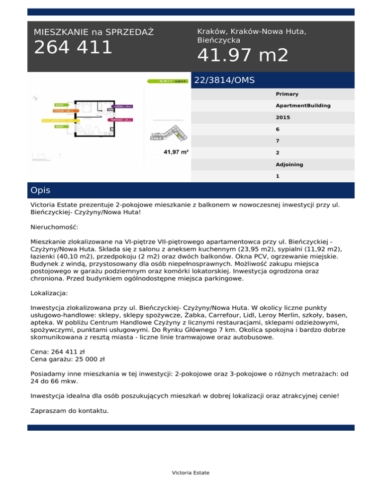 MIESZKANIE na SPRZEDAŻ 264 411 Kraków, Kraków-Nowa Huta, Bieńczycka 41.97 m2 22/3814/OMS Primary ApartmentBuilding 2015 6 7 2 Adjoining 1 Opis Victoria Estate prezentuje 2-pokojowe mieszkanie z balkonem w nowoczesnej inwestycji przy ul. Bieńczyckiej- Czyżyny/Nowa Huta! Nieruchomość: Mieszkanie zlokalizowane na VI-piętrze VII-piętrowego apartamentowca przy ul. Bieńczyckiej Czyżyny/Nowa Huta. Składa się z salonu z aneksem kuchennym (23,95 m2), sypialni (11,92 m2), łazienki (40,10 m2), przedpokoju (2 m2) oraz dwóch balkonów. Okna PCV, ogrzewanie miejskie. Budynek z windą, przystosowany dla osób niepełnosprawnych. Możliwość zakupu miejsca postojowego w garażu podziemnym oraz komórki lokatorskiej. Inwestycja ogrodzona oraz chroniona. Przed budynkiem ogólnodostępne miejsca parkingowe. Lokalizacja: Inwestycja zlokalizowana przy ul. Bieńczyckiej- Czyżyny/Nowa Huta. W okolicy liczne punkty usługowo-handlowe: sklepy, sklepy spożywcze, Żabka, Carrefour, Lidl, Leroy Merlin, szkoły, basen, apteka. W pobliżu Centrum Handlowe Czyżyny z licznymi restauracjami, sklepami odzieżowymi, spożywczymi, punktami usługowymi. Do Rynku Głównego 7 km. Okolica spokojna i bardzo dobrze skomunikowana z resztą miasta - liczne linie tramwajowe oraz autobusowe. Cena: 264 411 zł Cena garażu: 25 000 zł Posiadamy inne mieszkania w tej inwestycji: 2-pokojowe oraz 3-pokojowe o różnych metrażach: od 24 do 66 mkw. Inwestycja idealna dla osób poszukujących mieszkań w dobrej lokalizacji oraz atrakcyjnej cenie! Zapraszam do kontaktu. Victoria Estate Natalia Sujdak tel. +48 516 547 102 email: [email protected] Victoria Estate Powered by TCPDF (www.tcpdf.org)