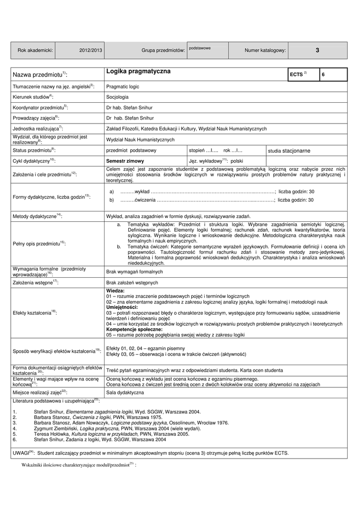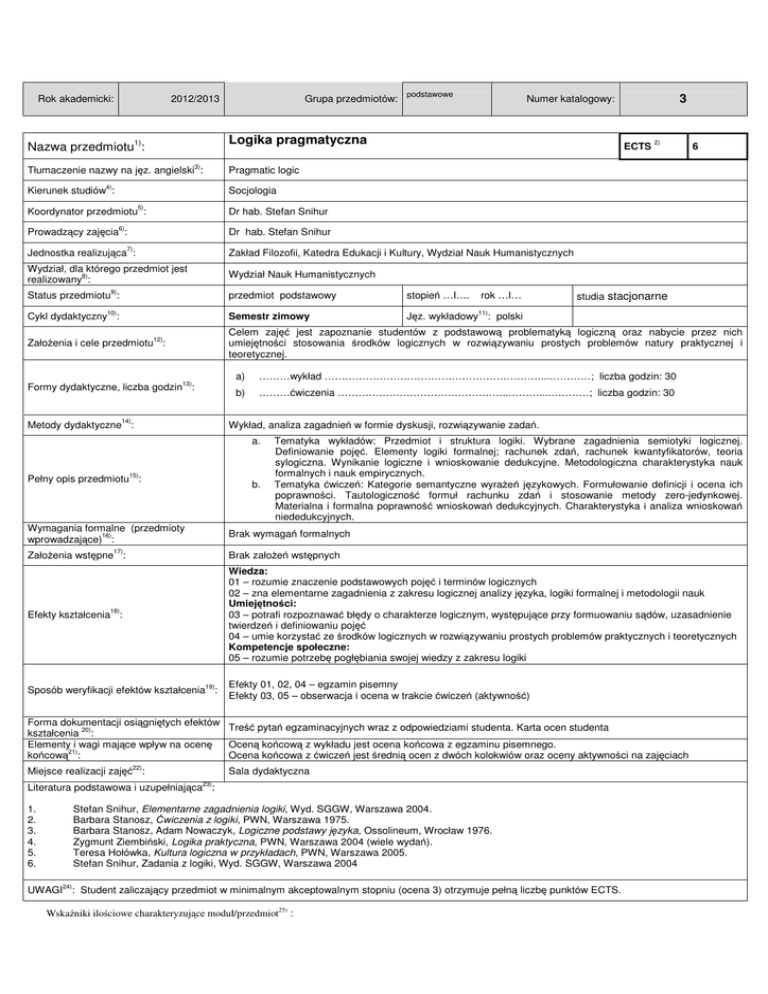 Rok akademicki: 2012/2013 Nazwa przedmiotu1): Grupa przedmiotów: Pragmatic logic Kierunek studiów4): Socjologia Koordynator przedmiotu : 6) ECTS 2) 6 Dr hab. Stefan Snihur Prowadzący zajęcia : Dr hab. Stefan Snihur Jednostka realizująca7): Zakład Filozofii, Katedra Edukacji i Kultury, Wydział Nauk Humanistycznych Wydział, dla którego przedmiot jest realizowany8): Wydział Nauk Humanistycznych Status przedmiotu9): przedmiot podstawowy 10) 3 Numer katalogowy: Logika pragmatyczna Tłumaczenie nazwy na jęz. angielski3): 5) podstawowe stopień …I…. rok …I… studia stacjonarne 11) Cykl dydaktyczny : Semestr zimowy ZałoŜenia i cele przedmiotu12): Celem zajęć jest zapoznanie studentów z podstawową problematyką logiczną oraz nabycie przez nich umiejętności stosowania środków logicznych w rozwiązywaniu prostych problemów natury praktycznej i teoretycznej. Formy dydaktyczne, liczba godzin13): Metody dydaktyczne14): a) ………wykład ………………………………………………………...…………; liczba godzin: 30 b) ………ćwiczenia …………………………………………..………...…………; liczba godzin: 30 Wykład, analiza zagadnień w formie dyskusji, rozwiązywanie zadań. a. Pełny opis przedmiotu15): Wymagania formalne (przedmioty wprowadzające)16): Jęz. wykładowy : polski b. Tematyka wykładów: Przedmiot i struktura logiki. Wybrane zagadnienia semiotyki logicznej. Definiowanie pojęć. Elementy logiki formalnej; rachunek zdań, rachunek kwantyfikatorów, teoria sylogiczna. Wynikanie logiczne i wnioskowanie dedukcyjne. Metodologiczna charakterystyka nauk formalnych i nauk empirycznych. Tematyka ćwiczeń: Kategorie semantyczne wyraŜeń językowych. Formułowanie definicji i ocena ich poprawności. Tautologiczność formuł rachunku zdań i stosowanie metody zero-jedynkowej. Materialna i formalna poprawność wnioskowań dedukcyjnych. Charakterystyka i analiza wnioskowań niededukcyjnych. Brak wymagań formalnych ZałoŜenia wstępne17): Brak załoŜeń wstępnych Efekty kształcenia18): Wiedza: 01 – rozumie znaczenie podstawowych pojęć i terminów logicznych 02 – zna elementarne zagadnienia z zakresu logicznej analizy języka, logiki formalnej i metodologii nauk Umiejętności: 03 – potrafi rozpoznawać błędy o charakterze logicznym, występujące przy formuowaniu sądów, uzasadnienie twierdzeń i definiowaniu pojęć 04 – umie korzystać ze środków logicznych w rozwiązywaniu prostych problemów praktycznych i teoretycznych Kompetencje społeczne: 05 – rozumie potrzebę pogłębiania swojej wiedzy z zakresu logiki Sposób weryfikacji efektów kształcenia19): Efekty 01, 02, 04 – egzamin pisemny Efekty 03, 05 – obserwacja i ocena w trakcie ćwiczeń (aktywność) Forma dokumentacji osiągniętych efektów Treść pytań egzaminacyjnych wraz z odpowiedziami studenta. Karta ocen studenta kształcenia 20): Elementy i wagi mające wpływ na ocenę Oceną końcową z wykładu jest ocena końcowa z egzaminu pisemnego. końcową21): Ocena końcowa z ćwiczeń jest średnią ocen z dwóch kolokwiów oraz oceny aktywności na zajęciach Miejsce realizacji zajęć22): Sala dydaktyczna Literatura podstawowa i uzupełniająca23): 1. 2. 3. 4. 5. 6. Stefan Snihur, Elementarne zagadnienia logiki, Wyd. SGGW, Warszawa 2004. Barbara Stanosz, Ćwiczenia z logiki, PWN, Warszawa 1975. Barbara Stanosz, Adam Nowaczyk, Logiczne podstawy języka, Ossolineum, Wrocław 1976. Zygmunt Ziembiński, Logika praktyczna, PWN, Warszawa 2004 (wiele wydań). Teresa Hołówka, Kultura logiczna w przykładach, PWN, Warszawa 2005. Stefan Snihur, Zadania z logiki, Wyd. SGGW, Warszawa 2004 UWAGI24): Student zaliczający przedmiot w minimalnym akceptowalnym stopniu (ocena 3) otrzymuje pełną liczbę punktów ECTS. Wskaźniki ilościowe charakteryzujące moduł/przedmiot25) : Szacunkowa sumaryczna liczba godzin pracy studenta (kontaktowych i pracy własnej) niezbędna dla osiągnięcia zakładanych efektów kształcenia18) - na tej podstawie naleŜy wypełnić pole ECTS2: 150 h Łączna liczba punktów ECTS, którą student uzyskuje na zajęciach wymagających bezpośredniego udziału nauczycieli akademickich: 2,8 ECTS Łączna liczba punktów ECTS, którą uzyska student w ramach aktywności nie wymagających udziału nauczyciela akademickiego 3,2 ECTS Tabela zgodności kierunkowych efektów kształcenia efektami przedmiotu 26) Nr /symbol efektu 01 Wymienione w wierszu efekty kształcenia: Rozumie znaczenie podstawowych pojęć i terminów logicznych Odniesienie do efektów dla programu kształcenia na kierunku K1_W01 02 Zna elementarne zagadnienia z zakresu logicznej analizy języka, logiki formalnej i K1_W02 metodologii nauk 03 04 Potrafi rozpoznawać błędy o charakterze logicznym, występujące przy formułowaniu sądów, uzasadnienie twierdzeń i definiowaniu pojęć Umie korzystać ze środków logicznych w rozwiązywaniu prostych problemów praktycznych 05 Rozumie potrzebę pogłębiania swojej wiedzy z zakresu logiki K1_U01 K1_U02 i teoretycznych K1_K01