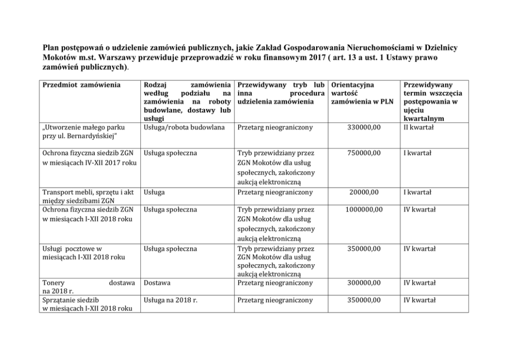 Plan postępowań o udzielenie zamówień publicznych, jakie Zakład Gospodarowania Nieruchomościami w Dzielnicy Mokotów m.st. Warszawy przewiduje przeprowadzić w roku finansowym 2017 ( art. 13 a ust. 1 Ustawy prawo zamówień publicznych). Przedmiot zamówienia „Utworzenie małego parku przy ul. Bernardyńskiej” Rodzaj zamówienia według podziału na zamówienia na roboty budowlane, dostawy lub usługi Usługa/robota budowlana Ochrona fizyczna siedzib ZGN Usługa społeczna w miesiącach IV-XII 2017 roku Przewidywany tryb lub Orientacyjna inna procedura wartość udzielenia zamówienia zamówienia w PLN Przetarg nieograniczony 330000,00 Przewidywany termin wszczęcia postępowania w ujęciu kwartalnym II kwartał Tryb przewidziany przez ZGN Mokotów dla usług społecznych, zakończony aukcją elektroniczną Przetarg nieograniczony 750000,00 I kwartał 20000,00 I kwartał 1000000,00 IV kwartał 350000,00 IV kwartał 300000,00 IV kwartał 350000,00 IV kwartał Transport mebli, sprzętu i akt między siedzibami ZGN Ochrona fizyczna siedzib ZGN w miesiącach I-XII 2018 roku Usługa Usługi pocztowe w miesiącach I-XII 2018 roku Usługa społeczna Tonery dostawa na 2018 r. Sprzątanie siedzib w miesiącach I-XII 2018 roku Dostawa Tryb przewidziany przez ZGN Mokotów dla usług społecznych, zakończony aukcją elektroniczną Tryb przewidziany przez ZGN Mokotów dla usług społecznych, zakończony aukcją elektroniczną Przetarg nieograniczony Usługa na 2018 r. Przetarg nieograniczony Usługa społeczna Ochrona fizyczna mienia – w formie podjazdów w miesiącach I-XII 2018 roku Usługa społeczna 200000,00 IV kwartał Usługa społeczna Tryb przewidziany przez ZGN Mokotów dla usług społecznych, zakończony aukcją elektroniczną Tryb przewidziany przez ZGN Mokotów dla usług społecznych, zakończony aukcją elektroniczną Ochrona fizyczna budynków 450000,00 IV kwartał usługa Przetarg nieograniczony 30000,00 I kwartał Wykonywanie usług usługa kominiarskich polegających na okresowych kontrolach stanu technicznego i czyszczenia Przetarg nieograniczony 135000,00 I kwartał m. innymi: Abramowskiego 9, Gagarina19, Podchorążych 31 oraz inne w okresie od 1 stycznia do 31 grudnia 2018 roku Świadczenie usług przeprowadzenia okresowych kontroli polegających na wykonaniu przeglądów 5-cio letnich w budynkach administrowanych przez Zakład Gospodarowania Nieruchomościami w Dzielnicy Mokotów przewodów kominowych w budynkach i lokalach administrowanych przez Zakład Gospodarowania Nieruchomościami W Dzielnicy Mokotów Świadczenie usług w zakresie kontroli okresowych i uproszczonych prób szczelności instalacji gazowych w budynkach i lokalach administrowanych przez Zakład Gospodarowania Nieruchomościami w Dzielnicy Mokotów usługa Przetarg nieograniczony 30000,00 I kwartał Utrzymaniowe roboty drogowe w zakresie remontów i przebudowy uszkodzonych nawierzchni wewnętrznych ciągów komunikacyjnych oraz ich oznakowania na terenach zarządzanych przez ZGN w Dzielnicy Mokotów m.st. Warszawy roboty budowlane Przetarg nieograniczony 1300000,00 I kwartał Wymiana stolarki okiennej na roboty budowlane Przetarg nieograniczony 520000,00 I kwartał okna PCV w budynkach i lokalach znajdujących się w administracji Zakładu Gospodarowania Nieruchomościami w Dzielnicy Mokotów m. st. Warszawy Wymiana stolarki okiennej na okna drewniane skrzynkowe, półskrzynkowe, krosnowe w budynkach i lokalach znajdujących się w administracji Zakładu Gospodarowania Nieruchomościami w Dzielnicy Mokotów roboty budowlane Przetarg nieograniczony 200000,00 I kwartał Wymiana stolarki okiennej na okna drewniane zespolone jednoramowe w budynkach i lokalach znajdujących się w administracji Zakładu Gospodarowania Nieruchomościami w Dzielnicy Mokotów m. st. Warszawy roboty budowlane Przetarg nieograniczony 300000,00 I kwartał Wykonanie ekspertyzy usługa Przetarg nieograniczony 25000,00 I kwartał technicznej z projektem na remont muru oporowego od strony skarpy przy ul. Dolnej 37 Wykonanie dokumentacji projektowo-kosztorysowej na remont murów oporowych przy ul. Gagarina 32A usługa Przetarg nieograniczony 20000,00 I kwartał Wykonanie dokumentacji projektowo-kosztorysowej na remont muru oporowego przy ul. Grottgera 25A usługa Przetarg nieograniczony 30000,00 I kwartał Wykonanie dokumentacji projektowo-kosztorysowej na wymianę instalacji elektrycznej w budynku przy ul. Narbutta 14 usługa Przetarg nieograniczony 6000,00 I kwartał Wykonanie dokumentacji projektowo-kosztorysowej na remont lokalu nr 33 (po pożarze) zawierającego wzmocnienie elementów konstrukcji stropu i wymianę nadproża okna przy ul. usługa Przetarg nieograniczony 8000,00 I kwartał Kwiatowej 24 Wykonanie dokumentacji projektowo-kosztorysowej na wymianę instalacji kanalizacyjnej w budynku przy ul. Odolańskiej 5 usługa Przetarg nieograniczony 6000,00 I kwartał Wykonanie dokumentacji projektowo-kosztorysowej na przystosowanie pomieszczenia na węzeł c.o. w budynku przy ul. Dolnej 37 of. usługa Przetarg nieograniczony 15000,00 I kwartał Wykonanie dokumentacji usługa projektowo-kosztorysowej na remont dachu w budynku przy ul. Kaszubskiej 4 Przetarg nieograniczony 4000,00 I kwartał Wykonanie dokumentacji projektowo-kosztorysowej na dostosowanie pomieszczeń składnicy akt do przepisów p.poż. w budynku przy ul. Smoluchowskiego 2 usługa Przetarg nieograniczony 25000,00 I kwartał Wykonanie dokumentacji projektowo-kosztorysowej na docieplenie budynku oraz usługa Przetarg nieograniczony 30000,00 I kwartał wymianę pokrycia dachowego w budynku przy ul. Konduktorskiej 12 Wykonanie dokumentacji projektowo-kosztorysowej na rozebranie i zasypanie pomieszczeń poza obrysem budynku przy ul. Asfaltowej 14 usługa Przetarg nieograniczony 6000,00 I kwartał Wykonanie dokumentacji projektowo-kosztorysowej na rozbiórkę obiektu przy ul. Bluszczańskiej 96 usługa Przetarg nieograniczony 3000,00 I kwartał Wykonanie dokume
