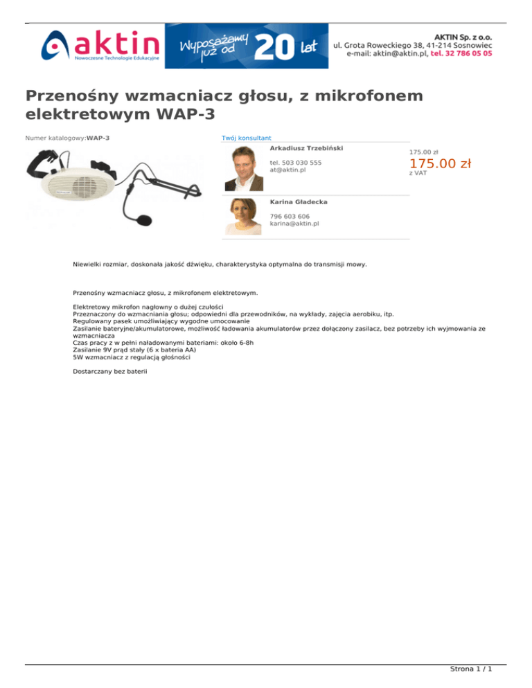 Przenośny wzmacniacz głosu, z mikrofonem elektretowym WAP-3 Numer katalogowy:WAP-3 Twój konsultant Arkadiusz Trzebiński tel. 503 030 555 [email protected] NOWOŚĆ W OFERCIE 175.00 zł 175.00 zł z VAT Karina Gładecka 796 603 606 [email protected] Niewielki rozmiar, doskonała jakość dźwięku, charakterystyka optymalna do transmisji mowy. Przenośny wzmacniacz głosu, z mikrofonem elektretowym. Elektretowy mikrofon nagłowny o dużej czułości Przeznaczony do wzmacniania głosu; odpowiedni dla przewodników, na wykłady, zajęcia aerobiku, itp. Regulowany pasek umożliwiający wygodne umocowanie Zasilanie bateryjne/akumulatorowe, możliwość ładowania akumulatorów przez dołączony zasilacz, bez potrzeby ich wyjmowania ze wzmacniacza Czas pracy z w pełni naładowanymi bateriami: około 6-8h Zasilanie 9V prąd stały (6 x bateria AA) 5W wzmacniacz z regulacją głośności Dostarczany bez baterii Strona 1 / 1 Powered by TCPDF (www.tcpdf.org)