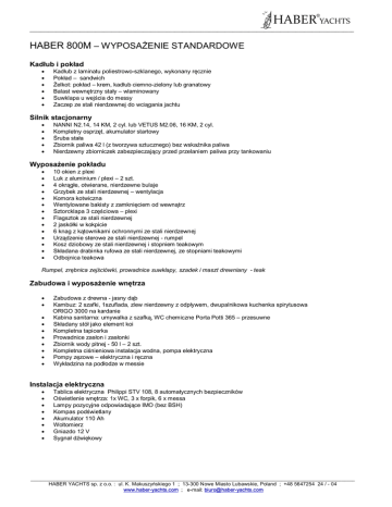 ___________________________________________________________________________________________________________________________ HABER 800M – WYPOSAŻENIE STANDARDOWE Kadłub i pokład Kadłub z laminatu poliestrowo-szklanego, wykonany ręcznie Pokład – sandwich Żelkot: pokład – krem, kadłub ciemno-zielony lub granatowy Balast wewnętrzny stały – wlaminowany Suwklapa u wejścia do messy Zaczep ze stali nierdzewnej do wciągania jachtu Silnik stacjonarny NANNI N2.14, 14 KM, 2 cyl. lub VETUS M2.06, 16 KM, 2 cyl. Kompletny osprzęt, akumulator startowy Śruba stała Zbiornik paliwa 42 l (z tworzywa sztucznego) bez wskaźnika paliwa Nierdzewny zbiorniczek zabezpieczający przed przelaniem paliwa przy tankowaniu Wyposażenie pokładu 10 okien z plexi Luk z aluminium / plexi – 2 szt. 4 okrągłe, otwierane, nierdzewne bulaje Grzybek ze stali nierdzewnej – wentylacja Komora kotwiczna Wentylowane bakisty z zamknięciem od wewnątrz Sztorcklapa 3 częściowa – plexi Flagsztok ze stali nierdzewnej 2 jaskółki w kokpicie 6 knag z kątownikami ochronnymi ze stali nierdzewnej Urządzenie sterowe ze stali nierdzewnej - rumpel Kosz dziobowy ze stali nierdzewnej i stopniem teakowym Składana drabinka rufowa ze stali nierdzewnej, ze stopniami teakowymi Odbojnica teakowa Rumpel, zrębnica zejściówki, prowadnice suwklapy, szadek i maszt drewniany - teak Zabudowa i wyposażenie wnętrza Zabudowa z drewna - jasny dąb Kambuz: 2 szafki, 1szuflada, zlew nierdzewny z odpływem, dwupalnikowa kuchenka spirytusowa ORIGO 3000 na kardanie Kabina sanitarna: umywalka z szafką, WC chemiczne Porta Potti 365 – przesuwne Składany stół jako element koi Kompletna tapicerka Prowadnice zasłon i zasłonki Zbiornik wody pitnej - 50 l – 2 szt. Kompletna ciśnieniowa instalacja wodna, pompa elektryczna Pompy zęzowe – elektryczna i ręczna Wykładzina na podłodze w messie Instalacja elektryczna Tablica elektryczna Philippi STV 108, 8 automatycznych bezpieczników Oświetlenie wnętrza: 1x WC, 3 x forpik, 6 x messa Lampy pozycyjne odpowiadające IMO (bez BSH) Kompas podświetlany Akumulator 110 Ah Woltomierz Gniazdo 12 V Sygnał dźwiękowy ___________________________________________________________________________________________________________________________ HABER YACHTS sp. z o.o. : ul. K. Makuszyńskiego 1 ; 13-300 Nowe Miasto Lubawskie, Poland ; +48 5647254 24 / - 04 www.haber-yachts.com ; e-mail: [email protected]