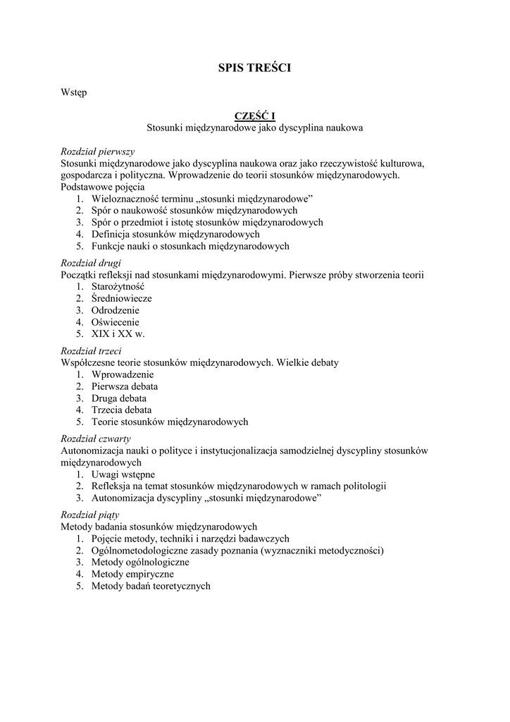 SPIS TREŚCI Wstęp CZĘŚĆ I Stosunki międzynarodowe jako dyscyplina naukowa Rozdział pierwszy Stosunki międzynarodowe jako dyscyplina naukowa oraz jako rzeczywistość kulturowa, gospodarcza i polityczna. Wprowadzenie do teorii stosunków międzynarodowych. Podstawowe pojęcia 1. Wieloznaczność terminu „stosunki międzynarodowe” 2. Spór o naukowość stosunków międzynarodowych 3. Spór o przedmiot i istotę stosunków międzynarodowych 4. Definicja stosunków międzynarodowych 5. Funkcje nauki o stosunkach międzynarodowych Rozdział drugi Początki refleksji nad stosunkami międzynarodowymi. Pierwsze próby stworzenia teorii 1. StaroŜytność 2. Średniowiecze 3. Odrodzenie 4. Oświecenie 5. XIX i XX w. Rozdział trzeci Współczesne teorie stosunków międzynarodowych. Wielkie debaty 1. Wprowadzenie 2. Pierwsza debata 3. Druga debata 4. Trzecia debata 5. Teorie stosunków międzynarodowych Rozdział czwarty Autonomizacja nauki o polityce i instytucjonalizacja samodzielnej dyscypliny stosunków międzynarodowych 1. Uwagi wstępne 2. Refleksja na temat stosunków międzynarodowych w ramach politologii 3. Autonomizacja dyscypliny „stosunki międzynarodowe” Rozdział piąty Metody badania stosunków międzynarodowych 1. Pojęcie metody, techniki i narzędzi badawczych 2. Ogólnometodologiczne zasady poznania (wyznaczniki metodyczności) 3. Metody ogólnologiczne 4. Metody empiryczne 5. Metody badań teoretycznych CZĘŚĆ II Aspekt podmiotowy stosunków międzynarodowych Rozdział szósty Uczestnictwo i podmiotowość prawna w stosunkach międzynarodowych 1. Pojęcie uczestnictwa ( podmiotowości ) 2. Rodzaje uczestnictwa w stosunkach międzynarodowych 3. Problematyka instytucji uznania w stosunkach międzynarodowych 4. Państwa jako podmioty prawa międzynarodowego 5. Jednostki terytorialne sui generis jako podmioty prawa międzynarodowego 6. Jednostki nieterytorialne sui generis jako podmioty prawa międzynarodowego 7. Narody jako podmioty prawa międzynarodowego 8. Organizacje międzynarodowe jako podmioty prawa międzynarodowego 9. Osoby fizyczne i prawne jako podmioty prawa międzynarodowego Rozdział siódmy Państwa jako uczestnicy stosunków międzynarodowych 1. Instytucja państwa narodowego 2. Powstawanie państw 3. Upadek państw 4. Kryteria typologii państw we współczesnym świecie 5. Podstawowe cechy państw w porządku międzynarodowym 6. Poglądy na pozycję państwa w stosunkach międzynarodowych 7. Organy państwa w stosunkach międzynarodowych 8. Odpowiedzialność międzynarodowa państwa 9. Sukcesja państw Rozdział ósmy Narody i religie jako uczestnicy stosunków międzynarodowych 1. Uwagi wstępne 2. Problemy z definicją narodu 3. Nacjonalizm 4. Kwestia narodowa 5. Prawo narodów do samostanowienia 6. Religie jako uczestnicy stosunków międzynarodowych Rozdział dziewiąty 1. Geneza organizacji międzynarodowych 2. Typologia organizacji międzynarodowych 3. Międzynarodowe organizacje rządowe (International Government Organizations – IGOs) 4. Międzynarodowe organizacje pozarządowe (International Non-Government Organizations – INGOs) 5. Funkcje i znaczenie organizacji międzynarodowych CZĘŚĆ III Aspekt przedmiotowy stosunków międzynarodowych Rozdział dziesiąty Konwencjonalne i niekonwencjonalne sposoby regulacji stosunków międzynarodowych 1. Podział regulacji stosunków miedzy podmiotami międzynarodowymi 2. Pojęcie i ogólna charakterystyka regulacji konwencjonalnych 3. Prawo międzynarodowe 4. Obyczaj międzynarodowy 5. Regulacje niekonwencjonalne Rozdział jedenasty Struktura i ewolucja systemu międzynarodowego 1. System jako metoda naukowa badająca stosunki międzynarodowe 2. System jako rzeczywistość społeczna 3. Typy systemów międzynarodowych 4. Państwo w systemie międzynarodowym Rozdział dwunasty Prawa rozwoju i zmienności stosunków międzynarodowych 1. Prawo oddziaływań międzynarodowych 2. Prawo internacjonalizacji 3. Prawo współzaleŜności międzynarodowych 4. Prawo instytucjonalizacji Rozdział trzynasty Polityka zagraniczna 1. Pojęcie polityki zagranicznej 2. Podmioty polityki zagranicznej 3. Cele polityki zagranicznej 4. Strategia i taktyka oraz metody i środki polityki zagranicznej 5. Determinanty polityki zagranicznej 6. Funkcje polityki zagranicznej Rozdział czternasty Spory i konflikty międzynarodowe 1. Pojecie i podział sporów oraz konfliktów międzynarodowych 2. Główne przyczyny sporów i konfliktów międzynarodowych 3. Sposoby pokojowego rozwiązywania sporów międzynarodowych 4. Prawo międzynarodowe wobec wojny Rozdział piętnasty Bezpieczeństwo międzynarodowe 1. Pojecie bezpieczeństwa międzynarodowego 2. Główne tendencje ewolucji bezpieczeństwa międzynarodowego do lat 90.XX w. 3. Perspektywy bezpieczeństwa narodowego w XXI w. Wybrana literatura z zakresu stosunków międzynarodowych Podręczniki Encyklopedie i leksykony Zbiory dokumentów Inne Literatura obcojęzyczna Aneks