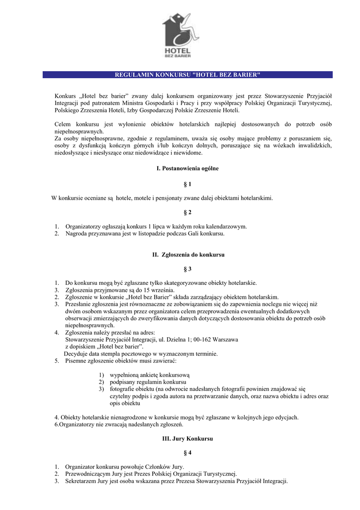 REGULAMIN KONKURSU "HOTEL BEZ BARIER" .RQNXUV Ä+RWHO EH] EDULHU´ ]ZDQ\ GDOHM NRQNXUVHP RUJDQL]RZDQ\ MHVW SU]H] 6WRZDU]\V]HQLH 3U]\MDFLyá ,QWHJUDFML SRG SDWURQDWHP 0LQLVWUD *RVSRGDUNL L 3UDF\ L SU]\ ZVSyáSUDF\ 3ROVNLHM 2UJDQL]DFML 7XU\VW\F]QHM Polskiego Zrzeszenia Hoteli, Izby Gospodarczej Polskie Zrzeszenie Hoteli. &HOHP NRQNXUVX MHVW Z\áRQLHQLH RELHNWyZ KRWHODUVNLFK QDMOHSLHM GRVWRVRZDQ\FK GR SRWU]HE RVyE QLHSHáQRVSUDZQ\FK =D RVRE\ QLHSHáQRVSUDZQH ]JRGQLH ] UHJXODPLQHP XZD*D VL RVRE\ PDMFH SUREOHP\ ] SRUXV]DQLHP VL RVRE\ ] G\VIXQNFM NRF]\Q JyUQ\FK LOXE NRF]\Q GROQ\FK SRUXV]DMFH VL QD Zy]NDFK LQZDOLG]NLFK QLHGRVá\V]FHLQLHVá\V]FHRUD]QLHGRZLG]FHLQLHZLGRPH I. Postanowienia ogólne §1 :NRQNXUVLHRFHQLDQHVKRWHOHPRWHOH i pensjonaty zwane dalej obiektami hotelarskimi. §2 1. 2. 2UJDQL]DWRU]\RJáDV]DMNRQNXUVOLSFDZND*G\PURNXNDOHQGDU]RZ\P Nagroda przyznawana jest w listopadzie podczas Gali konkursu. ,,=JáRV]HQLDGRNRQNXUVX §3 1. 'RNRQNXUVXPRJE\ü]JáDV]DQHtylko skategoryzowane obiekty hotelarskie. 3. =JáRV]HQLDSU]\MPRZDQHVGRZU]HQLD 2. =JáRV]HQLHZNRQNXUVLHÄ+RWHOEH]%DULHU´VNáDGD]DU]G]DMF\RELHNWHPKRWHODUVNLP 3. 3U]HVáDQLH]JáRV]HQLDMHVWUyZQR]QDF]QH]H]RERZL]DQLHPVL GR]DSHZQLHQLDQRFOHJXQLHZL FHMQL* dwóm osobom wskazanym przez organizatora celem przeprowadzenia ewentualnych dodatkowych REVHUZDFML]PLHU]DMF\FKGR]ZHU\ILNRZDQLDGDQ\FKGRW\F]F\FKGRVWRVRZDQLDRELHNWXGRSRWU]HERVyE QLHSHáQRVSUDZQ\FK 4. =JáRV]HQLDQDOH*\SU]HVáDüQDDGUHV 6WRZDU]\V]HQLH3U]\MDFLyá,QWHJUDFMLXO']LHOQD-162 Warszawa z dopiskiem „Hotel bez barier”. Decyduje data stempla pocztowego w wyznaczonym terminie. 5. 3LVHPQH]JáRV]HQLHRELHNWyZPXVL]DZLHUDü 1) Z\SHáQLRQDQNLHW NRQNXUVRZ 2) podpisany regulamin konkursu 3) IRWRJUDILHRELHNWXQDRGZURFLHQDGHVáDQ\FKIRWRJUDILLSRZLQLHQ]QDMGRZDüVL czytelny podpis i zgoda autora na przetwarzanie danych, oraz nazwa obiektu i adres oraz opis obiektu 4. Obiekty hotelarskie nienagrodzone w konkursLHPRJE\ü]JáDV]DQHZNROHMQ\FK jego edycjach. 2UJDQL]DWRU]\QLH]ZUDFDMQDGHVáDQ\FK]JáRV]H III. Jury Konkursu §4 1. 2UJDQL]DWRUNRQNXUVXSRZRáXMH&]áRQNyZ-XU\ 2. 3U]HZRGQLF]F\P-XU\MHVW3UH]HV3ROVNLHM2UJDQL]DFML7XU\VW\F]QHM 3. Sekretarzem Jur\MHVWRVREDZVND]DQDSU]H]3UH]HVD6WRZDU]\V]HQLD3U]\MDFLyá,QWHJUDFML §5 1. 3U]HZRGQLF]F\L&]áRQNRZLH-XU\SHáQLVZRMHIXQNFMHEH]WHUPLQRZRLQLHRGSáDWQLH 2. &]áRQHN-XU\PR*H]áR*\üUH]\JQDFM ]IXQNFMLQDU FH3U]HZRGQLF]FHJR-XU\ 3. &]áRQHN-XU\PR*H]RVWDüRGZRáDQ\SU]H]FRQDMPQLHMGZyFKF]áRQNyZ-XU\]SRZRGXQLHQDOH*\WHJR Z\NRQDQLDVZRLFKRERZL]NyZ IV. Tryb przyznawania nagrody §6 1. 2. 3. 4. 5. 3RXSá\ZLHWHUPLQXQDGV\áDQLD]JáRV]H3UH]HV6WRZDU]\V]HQLD3U]\MDFLyá,QWHJUDFML]ZRáXMHSRVLHG]HQLH dlaUR]SDWU]HQLD]JáRV]H -XU\SRGHMPXMHRVWDWHF]QXFKZDá RSU]\]QDQLXQDJUyGSRXSU]HGQLP Z\ERU]HRELHNWyZQRPLQRZDQ\FKGRNRQNXUVXVSRUyGZV]\VWNLFK]JáRV]H 2) wizji lokalnej obiektów hotelarskich nominowanych do nagrody. -XU\SRGHMPXMHXFKZDá ZREHFQRFLFRQDMPQLHMSRáRZ\VNáDGX-XU\]Z\NáZL NV]RFLJáRVyZ :SU]\SDGNXUyZQHMOLF]E\JáRVyZJáRVUR]VWU]\JDMF\PD3U]HZRGQLF]F\-XU\ 2GXFKZDá\-XU\QLHSU]\VáXJXMHRGZRáDQLH §7 1. 2. 3. 4. -XU\ZGURG]HXFKZDá\SU]\]QDMHQDJURG JáyZQ Poza nagrRGJáyZQ-XU\PR*HSU]\]QDüZ\Uy*QLHQLD -XU\PR*HSU]\]QDüQDJURG VSHFMDOQ -XU\PR*HQLHSU]\]QDü*DGQHMQDJURG\ §8 1. 1DJURG JáyZQZNRQNXUVLHVWDQRZLKRQRURZ\W\WXá „Hotel bez barier” 2. =GRE\ZF\QDJURG\JáyZQHMLZ\Uy*QLHRWU]\PXMWDEOLFHSDPLWNRZH §9 1. 2. /DXUHDFLSRZLDGRPLHQLVRZ\QLNDFKNRQNXUVXLWHUPLQLHZU F]HQLDQDJUyGSU]H]6WRZDU]\V]HQLH 3U]\MDFLyá,QWHJUDFML :\QLNLNRQNXUVX]RVWDQSRGDQHGRSXEOLF]QHMZLDGRPRFLQDVWURQDFKLQWHUQHWRZ\FKRUJDQL]DWRUyZL partnerów konkursu. V. Informacje dodatkowe § 10 1. 5HJXODPLQNRQNXUVXXGRVW SQLRQ\MHVWZVLHG]LELH6WRZDU]\V]HQLD3U]\MDFLyá,QWHJUDFMLLQDMHJRVWURQLH internetowej www.integracja.org oraz www.niepelnosprawni.info $QNLHWDVWDQRZL]DáF]QLNQUGRUHJXODPLQX :V]HONLHGRGDWNRZHLQIRUPDFMHQDWHPDWNRQNXUVXPR*QDX]\VNDüSRGDGUHVHP 6WRZDU]\V]HQLH3U]\MDFLyá,QWHJUDFMLXO']LHOQD-162 Warszawa, tel. (0*22) 635 13 30 wew. 15. =DSR]QDáHPáDPVL ]SRZ\*V]\PUHJXODPLQHPLDNFHSWXM MHJRZDUXQNL .......................................................................................... 'DWDLSRGSLV=DU]G]DMFHJRRELHNWHPKRWHODUVNLP