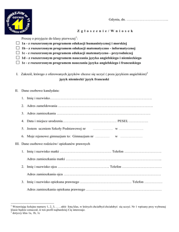 Gdynia, dn. …………………………….. Z g ł o s z e n i e / W n i o s ek □ □ □ □ □ Proszę o przyjęcie do klasy pierwszej1: 1a - z rozszerzonym programem edukacji humanistycznej i morskiej 1b - z rozszerzonym programem edukacji matematyczno - informatycznej 1c - z rozszerzonym programem edukacji matematyczno - przyrodniczej 1d - z rozszerzonym programem nauczania języka angielskiego i niemieckiego 1e - z rozszerzonym programem nauczania języka angielskiego i francuskiego I. Zakreśl, którego z oferowanych języków chcesz się uczyć ( poza językiem angielskim)2 język niemiecki/ język francuski II. Dane osobowe kandydata: 1. Imię i nazwisko…………………………………………………………………………. 2. Adres zameldowania ……………………………………………………………………. 3. Adres zamieszkania …………………………………………………………………… 4. Data i miejsce urodzenia……………………………………… PESEL ……………. 5. Jestem uczniem Szkoły Podstawowej nr ……………………. 6. Moje rejonowe gimnazjum to: Gimnazjum nr ……………… w …………………………. w ………………………. III. Dane osobowe rodziców/ opiekunów prawnych 1. Imię i nazwisko matki ……………………………………. Telefon …………………………. Adres zamieszkania matki …………………………………………………………………….. 2. Imię i nazwisko ojca ……………………………………. Telefon …………………………… Adres zamieszkania ojca ……………………………………………………………………… 3. Imię i nazwisko opiekuna prawnego ……………………………………. Telefon …………… Adres zamieszkania opiekuna prawnego ……………………………………………………… 1 Wstawiając kolejne numery 1, 2, 3, … , ułóż listę klas, w których chciałbyś/chciałabyś się uczyć. Nr 1 wpisany przy wybranej klasie będzie oznaczał, iż ten profil najbardziej Cię interesuje. 2 dotyczy klas 1a, 1b, 1c IV. Czy dziecko: □ posiada orzeczenie poradni psychologiczno- pedagogicznej, □ posiada orzeczenie o niepełnosprawności, □ pochodzi z rodziny wielodzietnej, □ jest wychowywane przez jednego z rodziców, □ jest objęty pieczą zastępczą, □ posiada rodzeństwo uczące się w Gimnazjum nr 11? V. Czy dziecko będzie uczęszczało na lekcje: □ □ religii, etyki? Wyrażam zgodę na przetwarzanie danych osobowych zawartych we wniosku dla celów rekrutacji do Gimnazjum nr 11, zgodnie z Ustawą z dn. 29.08.1997r. o ochronie danych osobowych (Dz.U. z 2014 r. poz.1182, poz.1662). Oświadczam , że podane we wniosku informacje są zgodne z aktualnym stanem faktycznym. ………………………………………………….. / podpis kandydata/ ………………………………………………….. /czytelny podpis rodzica lub opiekuna prawnego/