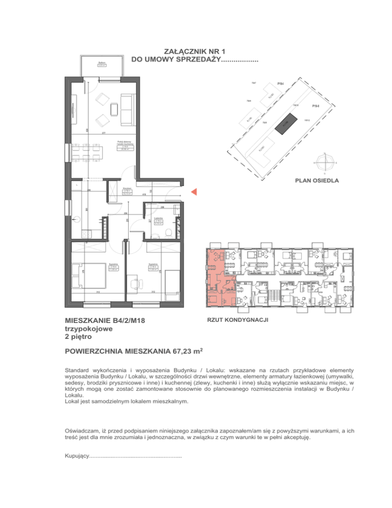 ZAŁĄCZNIK NR 1 DO UMOWY SPRZEDAŻY.................. Balkon 3,03 m2 758/7 PL 2 /I /B 2 P19-I 758/8 758/10 /B 1 P19-II PL 1 /I 1951/2 604 PL 1 /I I/ B 4 758/9 377 PL 3 /I I/ B 3 Pokój dzienny +aneks kuchenny 2.18.6 28,96 m2 N W E S PLAN OSIEDLA Korytarz 2.18.1 10,73 m2 206 130 L 418 P 369 206 227 235 204 Łazienka 2.18.2 4,16 m2 k 16 k k L P k k L k P P L k k P Sypialnia 2.18.3 11,69 m2 379 379 Sypialnia 2.18.4 11,69 m2 P L k k L P k P k P k k L k 312 L 312 MIESZKANIE B4/2/M18 trzypokojowe 2 piętro RZUT KONDYGNACJI POWIERZCHNIA MIESZKANIA 67,23 m2 Standard wykończenia i wyposażenia Budynku / Lokalu: wskazane na rzutach przykładowe elementy wyposażenia Budynku / Lokalu, w szczególności drzwi wewnętrzne, elementy armatury łazienkowej (umywalki, sedesy, brodziki prysznicowe i inne) i kuchennej (zlewy, kuchenki i inne) służą wyłącznie wskazaniu miejsc, w których mogą one zostać zamontowane stosownie do planowanego rozmieszczenia instalacji w Budynku / Lokalu. Lokal jest samodzielnym lokalem mieszkalnym. Oświadczam, iż przed podpisaniem niniejszego załącznika zapoznałem/am się z powyższymi warunkami, a ich treść jest dla mnie zrozumiała i jednoznaczna, w związku z czym warunki te w pełni akceptuję. Kupujący........................................................