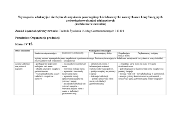 Wymagania edukacyjne niezbędne do uzyskania poszczególnych śródrocznych i rocznych ocen klasyfikacyjnych z obowiązkowych zajęć edukacyjnych (kształcenie w zawodzie) Zawód i symbol cyfrowy zawodu: Technik Żywienia i Usług Gastronomicznych 343404 Przedmiot: Organizacja produkcji Klasa: IV TŻ Dział nauczania Konieczny dopuszczający zasady kalkulacji cen potraw i napojów podstawowy dostateczny Wymagania edukacyjne Rozszerzający dobry Dopełniający Wykraczający celujący bardzo dobry wyższy poziom wymagań obejmuje zagadnienia z poziomu niższego. Poziom wykraczający to dodatkowo umiejętność korzystania z różnych źródeł, poszerzania swoich wiadomości i umiejętności – projektuje karty menu na różne przyjęcia – posługuje się pojęciem i – zna zasady tworzenia kart – układa karty menu z rodzajami kart menu. menu. informacjami na temat okolicznościowe. wartości odżywczej potraw. – potrafi opracować i zastosować nowe receptury na – określa czym jest receptura – rozróżnia rodzaje menu. – podaje receptury na potrawy potrawy i napoje gastronomiczna – wymienia i zna zasady – stosuje Food cost – nową kalkulację w gastronomii. – wymienia elementy zasady zestawiania menu i napoje – dokonuje kalkulacji. – stosuje systemy komputerowe w gastronomii. – kalkulacji cen potraw i – wymienia zasady opracowuje ceny gastronomiczne potraw i napojów napojów opracowania receptur na – potrafi opracować rabat i potrawy i napoje marżę w kalkulacji – zna zasady kalkulacji cen gastronomicznej potraw i napojów – rozróżnia pojęcia: rabat i marża w kalkulacji gastronomicznej