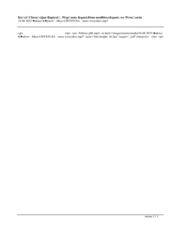 Ko�ci�Chrze�cijan Baptyst�, Wsp�nota "Dom modlitwy" we Wroc�awiu 16 08 2015 �ukasz K�ykow - Masz CHYSTUSA - masz wszystko!.mp3 <p> </p> <p> Pobierz plik mp3: <a href="images/stories/audio/16 08 2015 �ukasz K�ykow - Masz CHYSTUSA - masz wszystko!.mp3" style="line-height: 16.2px" target="_self">tutaj</a> </p> <p> strona 1 / 1