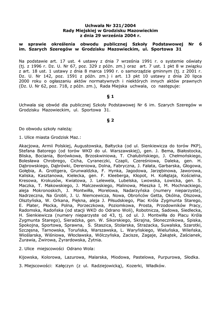 Uchwała Nr 321/2004 Rady Miejskiej w Grodzisku Mazowieckim z dnia 29 września 2004 r. w sprawie określenia obwodu publicznej Szkoły Podstawowej im. Szarych Szeregów w Grodzisku Mazowieckim, ul. Sportowa 31 Nr 6 Na podstawie art. 17 ust. 4 ustawy z dnia 7 września 1991 r. o systemie oświaty (tj. z 1996 r. Dz. U. Nr 67, poz. 329 z późn. zm.) oraz art. 7 ust. 1 pkt 8 w związku z art. 18 ust. 1 ustawy z dnia 8 marca 1990 r. o samorządzie gminnym (tj. z 2001 r. Dz. U. Nr 142, poz. 1591 z późn. zm.) i art. 13 pkt 10 ustawy z dnia 20 lipca 2000 roku o ogłaszaniu aktów normatywnych i niektórych innych aktów prawnych (Dz. U. Nr 62, poz. 718, z późn. zm.), Rada Miejska uchwala, co następuje: §1 Uchwala się obwód dla publicznej Szkoły Podstawowej Nr 6 im. Szarych Szeregów w Grodzisku Mazowieckim, ul. Sportowa 31. §2 Do obwodu szkoły należą: 1. Ulice miasta Grodzisk Maz.: Akacjowa, Armii Polskiej, Augustowska, Bałtycka (od ul. Sienkiewicza do torów PKP), Stefana Batorego (od torów WKD do ul. Warszawskiej), gen. J. Bema, Białostocka, Bliska, Bociania, Borówkowa, Brzoskwiniowa, T. Chałubińskiego, J. Chełmońskiego, Bolesława Chrobrego, Cicha, Cyraneczki, Czapli, Czereśniowa, Daleka, gen. H. Dąbrowskiego, Dąbrówki, Dereniowa, Dolna, Fabryczna, J. Fałata, Garbarska, Głogowa, Gołębia, A. Grottgera, Grunwaldzka, F. Hynka, Jagodowa, Jarzębinowa, Jaworowa, Kaliska, Kasztanowa, Kielecka, gen. F. Kleeberga, Kłopot, H. Kołłątaja, Kościelna, Kresowa, Krokusów, Kwiatowa, J. Lelewela, Lubelska, Lwowska, Łowicka, gen. S. Maczka, T. Makowskiego, J. Malczewskiego, Malinowa, Mieszka I, M. Mochnackiego, aleja Mokronoskich, J. Montwiłła, Morelowa, Nadarzyńska (numery nieparzyste), Nadrzeczna, Na Grobli, J. U. Niemcewicza, Nowa, Obrońców Getta, Okólna, Olszowa, Olsztyńska, W. Orkana, Piękna, aleja J. Piłsudskiego, Plac Króla Zygmunta Starego, E. Plater, Płocka, Polna, Porzeczkowa, Poziomkowa, Prosta, Przodowników Pracy, Radomska, Radońska (od stacji WKD do Odrano Woli), Robotnicza, Sadowa, Siedlecka, H. Sienkiewicza (numery nieparzyste od 43, tj. od ul. J. Montwiłła do Placu Króla Zygmunta Starego), Sieradzka, gen. W. Sikorskiego, Skrajna, Słonecznikowa, Spiska, Spokojna, Sportowa, Sprawna, S. Staszica, Stolarska, Strażacka, Suwalska, Szarotki, Szczęsna, Tarnowska, Toruńska, Warszawska, L. Waryńskiego, Wieluńska, Wileńska, Wioślarska, Wiśniowa, Włocławska, Wólczyńska, Zacisze, Zagaje, Zakątek, Zaścianek, Żurawia, Żwirowa, Żyrardowska, Żytnia. 2. Ulice miejscowości Odrano Wola: Kijowska, Kolorowa, Lazurowa, Malarska, Miodowa, Pastelowa, Purpurowa, Słodka. 3. Miejscowości: Kałęczyn (z ul. Radziejowicką), Kozerki, Władków. §3 Traci moc Uchwała nr 87/99 Rady Miejskiej w Grodzisku Mazowieckim z dnia 10 marca 1999 roku w sprawie określenia obwodu publicznej Szkoły Podstawowej Nr 6 w Grodzisku Mazowieckim ul. Sportowa 31. §4 Wykonanie uchwały powierza się Burmistrzowi Gminy Grodzisk Mazowiecki. §5 Uchwała podlega ogłoszeniu w Dzienniku Urzędowym Województwa Mazowieckiego. §6 Uchwała wchodzi w życie z dniem ogłoszenia. Przewodnicząca Rady Miejskiej Alicja Pytlińska