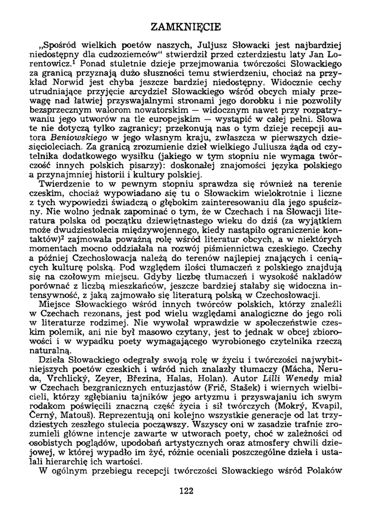 ZAMKNIĘCIE „Spośród wielkich poetów naszych, Juljusz Słowacki jest najbardziej niedostępny dla cudzoziemców" stwierdził przed czterdziestu laty Jan Lorentowicz. Ponad stuletnie dzieje przejmowania twórczości Słowackiego za granicą przyznają dużo słuszności temu stwierdzeniu, chociaż na przy kład Norwid jest chyba jeszcze bardziej niedostępny. Widocznie cechy utrudniające przyjęcie arcydzieł Słowackiego wśród obcych miały prze wagę nad łatwiej przyswajalnymi stronami jego dorobku i nie pozwoliły bezsprzecznym walorom nowatorskim — widocznym nawet przy rozpatry waniu jego utworów na tle europejskim — wystąpić w całej pełni. Słowa te nie dotyczą tylko zagranicy; przekonują nas o tym dzieje recepcji au tora Beniowskiego w jego własnym kraju, zwłaszcza w pierwszych dzie sięcioleciach. Za granicą zrozumienie dzieł wielkiego Juliusza żąda od czy telnika dodatkowego wysiłku (jakiego w tym stopniu nie wymaga twór czość innych polskich pisarzy): doskonałej znajomości języka polskiego a przynajmniej historii i kultury polskiej. Twierdzenie to w pewnym stopniu sprawdza się również na terenie czeskim, chociaż wypowiadano się tu o Słowackim wielokrotnie i liczne z tych wypowiedzi świadczą o głębokim zainteresowaniu dla jego spuściz ny. Nie wolno jednak zapominać o tym, że w Czechach i na Słowacji lite ratura polska od początku dziewiętnastego wieku do dziś (za wyjątkiem może dwudziestolecia międzywojennego, kiedy nastąpiło ograniczenie kon taktów) zajmowała poważną rolę wśród literatur obcych, a w niektórych momentach mocno oddziałała na rozwój piśmiennictwa czeskiego. Czechy a później Czechosłowacja należą do terenów najlepiej znających i cenią cych kulturę polską. Pod względem ilości tłumaczeń z polskiego znajdują się na czołowym miejscu. Gdyby liczbę tłumaczeń i wysokość nakładów porównać z liczbą mieszkańców, jeszcze bardziej stałaby się widoczna in tensywność, z jaką zajmowało się literaturą polską w Czechosłowacji. Miejsce Słowackiego wśród innych twórców polskich, którzy znaleźli w Czechach rezonans, jest pod wielu względami analogiczne do jego roli w literaturze rodzimej. Nie wywołał wprawdzie w społeczeństwie czes kim polemik, ani nie był masowo czytany, jest to jednak w obcej zbioro wości i w wypadku poety wymagającego wyrobionego czytelnika rzeczą naturalną. Dzieła Słowackiego odegrały swoją rolę w życiu i twórczości najwybit niejszych poetów czeskich i wśród nich znalazły tłumaczy (Macha, Neru da, Vrchlicky, Zeyer, Bfezina, Hałas, Holan). Autor Lilii Wenedy miał w Czechach bezgranicznych entuzjastów (Frić, Staśek) i wiernych wielbi cieli, którzy zgłębianiu tajników jego artyzmu i przyswajaniu ich swym rodakom poświęcili znaczną część życia i sił twórczych (Mokry, Kvapil, Cerny, Matouś). Reprezentują oni kolejno wszystkie generacje od lat trzy dziestych zeszłego stulecia począwszy. Wszyscy oni w zasadzie trafnie zro zumieli główne intencje zawarte w utworach poety, choć w zależności od osobistych poglądów, upodobań artystycznych oraz atmosfery chwili dzie jowej, w której wypadło im żyć, różnie oceniali poszczególne dzieła i usta lali hierarchię ich wartości. W ogólnym przebiegu recepcji twórczości Słowackiego wśród Polaków 1 2 122 i Czechów można wykryć daleko posunięte analogie. Przebieg ten da się w Czechach podzielić na kilka etapów, różniących się tak pod względem znajomości jego utworów, jak pod względem oceny poety, podejmowania czy eksponowania pewnych stron jego dorobku artystycznego. Do lat sześćdziesiątych zeszłego stulecia Słowackiego w Czechach pra wie nie znano. Jedynym znaczącym wyjątkiem był K. H. Mścha. Wiele przyczyn złożyło się na ten szczególny przypadek wzajemnych kontaktów literackich polsko-czeskich. Chodzi o zjawisko ważne, istotne, kiedy głę bokie oddziaływanie jednego piśmiennictwa na drugie uwarunkowane było tak historyczno-typologicznie, jak też kontaktowo-genetycznie, przy czym w wypadku wzajemnego stosunku obu pisarzy wchodzi w grę jesz cze analogia postaw życiowych, indywidualności twórczych oraz skala ta lentów. Wszystkie te czynniki spowodowały, że jeszcze przed oceną Kra sińskiego i przed innymi wypowiedziami Polaków usiłujących oddać sprawiedliwość talentowi Słowackiego — geniusz poetycki innego narodu wyciągnął z jego twórczości niekłamaną korzyść. Po powstaniu listopadowym i jego odgłosie w Czechach — w okresie powstania styczniowego mamy do czynienia z drugą falą zainteresowania dla literatury polskiej, otwierającą Słowackiemu drogę i warunkującą zro zumienie jego utworów przynajmniej w ogólnym zarysie. Jest rzeczą cha rakterystyczną, że głównymi propagatorami poety stają się przedstawiciele radykalnych demokratów (Frić, Staśek), podkreślający w jego dziełach rewolucyjność, patriotyzm, krytyczne nastawienie wobec wad przeszłości i zaangażowanie się w aktualne procesy społeczne. Przed wydaniem Pism pośmiertnych w przekładach pojawiały się najczęściej poematy młodzień cze. Słowackiego najpełniej zdaje się zrozumiał wtedy Jan Neruda; jego bezpośrednio zafiksowana wypowiedź o ramantyku polskim pochodzi jed nak dopiero z roku 1879. Z wyjątkowym wyczuciem artyzmu, formalnego piękna, sięgał do utwo rów Słowackiego (jak również i innych twórców polskich) J. Goli. Stanowi on przejście do drugiego okresu trwającego mniej więcej od lat siedem dziesiątych do końca stulecia. W okresie tym Słowackim zajmują się naj więcej „lumirowcy", szkoła Vrchlickiego (Mokry, Kvapil, Nećas, Vrchlicky, Zeyer). Cechuje ich zwrócenie głównie uwagi na formalne walory dzieła. Tłumaczy się wówczas w dalszym ciągu poematy, ale wśród doko nań translatorskich prym zaczyna wieść liryka i dramaty. Jako pierwsza sztuka Słowackiego pojawił się 