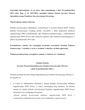 Uprzejmie informujemy, że na mocy aktu notarialnego z dnia 26 października 2012 roku, Rep. A Nr 4351/2012, nastąpiła zmiana Statutu Investor Parasol Specjalistycznego Funduszu Inwestycyjnego Otwartego. Wprowadzone zmiany dotyczą: Polityki inwestycyjnej subfunduszy wydzielonych w Investor Parasol SFIO. Zmiany polityki inwestycyjnej wynikają przede wszystkim z faktu połączenia funduszu zagranicznego DWS Lateinamerika, jako funduszu przejmowanego, z subfunduszem zagranicznym DWS Invest Latin American Equities, jako funduszem przejmującym, z dniem 26 października 2012 roku. Przedmiotowe zmiany nie wymagają uzyskania zezwolenia Komisji Nadzoru Finansowego i wchodzą w życie w terminie 3 miesięcy od dnia ogłoszenia. Poniżej przedstawiamy szczegółowe zmiany w Statucie ww. funduszu: Zmiana Statutu Investor Parasol Specjalistyczny Fundusz Inwestycyjny Otwarty z dnia 26 października 2012 r. Zmienia się Statut Investor Parasol Specjalistyczny Fundusz Inwestycyjny Otwarty w ten sposób, że: 1. w Części II. Subfundusze, Rozdział I. Zasady polityki inwestycyjnej funduszu zagranicznego DWS Invest, w części zawierającej listę funduszy, do których stosuje się zasady polityki inwestycyjnej funduszu zagranicznego DWS Invest, otrzymuje nowe następujące brzmienie: „Zasady polityki inwestycyjnej funduszu zagranicznego DWS wydzielonymi subfunduszami stosuje się do subfunduszy zagranicznych: Invest z - DWS Invest Asian Small/Mid Cap; - DWS Invest BRIC Plus; - DWS Invest Chinese Equities; - DWS Invest Clean Tech; - DWS Invest Emerging Markets Top Dividend Plus; - DWS Invest Euro Bonds (Premium); - DWS Invest Euro Bonds (Shorts); - DWS Invest Euro Bonds (X-tra Long); - DWS Invest Euro-Gov Bonds; - DWS Invest Euro Corporate Bonds; - DWS Invest Top Dividend Europe; - DWS Invest European Equities; - DWS Invest European Small/Mid Cap; - DWS Invest European Select Plus; - DWS Invest European Select; - DWS Invest Global Agribusiness; - DWS Invest Gold and Precious Metals Equities; - DWS Invest Japanese Equities; - DWS Invest Top 50 Asia; - DWS Invest Top Euroland; - DWS Invest Latin American Equities; będących przedmiotem lokat odpowiednio: - Subfunduszu Investor BRIC; - Subfunduszu Investor Zmian Klimatycznych; - Subfunduszu Investor Gold Otwarty; - Subfunduszu Investor Agrobiznes; - Subfunduszu Investor Indie i Chiny; - Subfunduszu Investor Ameryka Łacińska; - Subfunduszu Investor Zrównoważony Rynków Wschodzących.”; 2. w Części II. Subfundusze, Rozdział II. Wspólne zasady polityki inwestycyjnej dla funduszu zagranicznego DWS India, DWS Lateinamerika, DWS Emerging Asia, DWS Russia, DWS China, DWS Turkei, w tytule rozdziału oraz w części zawierającej listę funduszy, do których stosuje się zasady polityki inwestycyjnej funduszu zagranicznego DWS Invest, otrzymuje nowe następujące brzmienie: „Rozdział II. Wspólne zasady polityki inwestycyjnej dla funduszu zagranicznego DWS India, DWS Emerging Asia, DWS Russia, DWS China, DWS Turkei Wspólne zasady polityki inwestycyjnej dla funduszu zagranicznego DWS India, DWS Emerging Asia, DWS Russia, DWS China, DWS Turkei, będących przedmiotem lokat odpowiednio: - Subfunduszu Investor Rosja; - Subfunduszu Investor Turcja; - Subfunduszu Investor Indie i Chiny; - Subfunduszu Investor Zrównoważony Rynków Wschodzących;”; 3. w Części II. Subfundusze, w Rozdziale IX. SUBFUNDUSZ INVESTOR AGROBIZNES, w Artykule. 3 Zasady polityki inwestycyjnej DWS Invest Global Agribusiness: 1) dotychczasowy ust. 3 zostaje oznaczony jako ust. 4 i otrzymuje brzmienie: „Do 30% aktywów subfunduszu może być inwestowane w akcje, certyfikaty udziałowe, obligacje zamienne, obligacje warrantowe, certyfikaty z prawem do dywidendy, warranty subskrypcyjne krajowych i zagranicznych emitentów, które nie spełniają warunków wskazanych w ust. 2., a także depozyty krótkoterminowe i instrumenty rynku pieniężnego.”, 2) dotychczasowy ust. 4 zostaje oznaczony jako ust. 5 i otrzymuje następujące brzmienie: „Niezależnie od limitów inwestycyjnych wskazanych w ust. 25 Rozdziału I. Części II Statutu, dotyczącego stosowania derywatów, następujące ograniczenia inwestycyjne mają zastosowanie z uwzględnieniem bieżących ograniczeń inwestycyjnych stosowanych w poszczególnych krajach dystrybucji: Derywaty, które tworzą krótkie pozycje, muszą mieć stosowne pokrycie w każdym momencie i mogą być stosowane wyłącznie w celach zabezpieczania. Zabezpieczanie ograniczone jest do 100% wartości instrumentu podstawowego pokrywającego derywat. Odwrotnie nie więcej niż 35% wartości aktywów netto funduszu może być inwestowane w derywaty, które tworzą długie pozycje i które nie posiadają stosownego pokrycia.”, 3) dotychczasowy ust. 5 zostaje oznaczony jako ust. 6, 4) dotychczasowy ust. 6 zostaje oznaczony jako ust. 7, 5) po ust. 2 wprowadza się ust. 3 w następującym brzmieniu: „Inwestowanie w aktywa, o których mowa w ust. 2, może być również dokonywane poprzez zakup globalnych kwitów depozytowych notowanych na zagranicznych rynkach oraz amerykańskich kwitów depozytowych wystawianych przez uznane międzynarodowe instytucje finansowe.”; 4. w Części II. Subfundusze, w Rozdziale X. SUBFUNDUSZ INVESTOR ROSJA, w Artykule. 2 Podstawowe informacje o funduszu DWS Russia oraz zasady polityki inwestycyjnej, ust. 2 otrzymuje brzmienie: „Pełna polityka inwestycyjna funduszu zagranicznego DWS Russia opisana jest łącznie w Rozdziale II. Części II Statutu (Wspólne zasady polityki inwestycyjnej dla funduszu zagranicznego DWS India, DWS Emerging Asia, DWS Russia, DWS China, DWS Turkei) oraz w ust. 3-8 poniżej”; 5. w Części II. Subfundusze, w Rozdziale XI. SUBFUNDUSZ INVESTOR TURCJA, w Artykule. 2 Podstawowe informacje o funduszu DWS Turkei oraz zasady polityki inwestycyjnej, ust. 2 otrzymuje brzmienie: „Pełna polityka inwestycyjna funduszu zagranicznego DWS Turkei opisana jest łącznie w Rozdziale II. Części