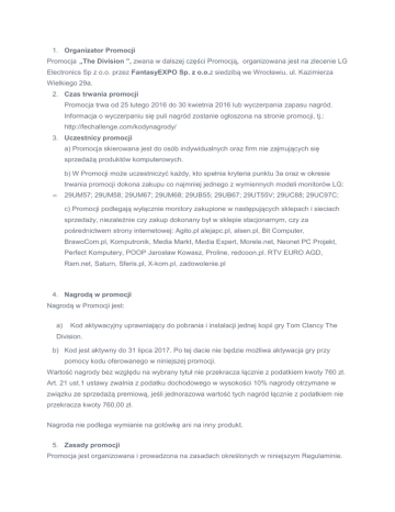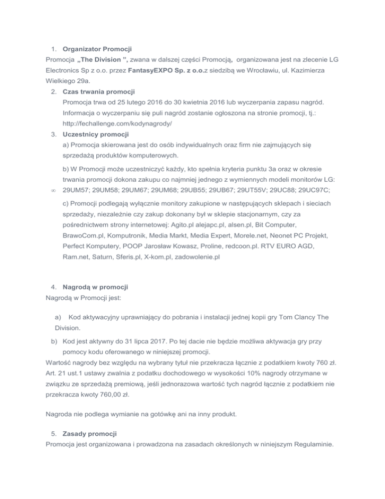 1. Organizator Promocji Promocja „The Division ”, zwana w dalszej części Promocją, organizowana jest na zlecenie LG Electronics Sp z o.o. przez FantasyEXPO Sp. z o.o.z siedzibą we Wrocławiu, ul. Kazimierza Wielkiego 29a. 2. Czas trwania promocji Promocja trwa od 25 lutego 2016 do 30 kwietnia 2016 lub wyczerpania zapasu nagród. Informacja o wyczerpaniu się puli nagród zostanie ogłoszona na stronie promocji, tj.: http://fechallenge.com/kodynagrody/ 3. Uczestnicy promocji a) Promocja skierowana jest do osób indywidualnych oraz firm nie zajmujących się sprzedażą produktów komputerowych. b) W Promocji może uczestniczyć każdy, kto spełnia kryteria punktu 3a oraz w okresie trwania promocji dokona zakupu co najmniej jednego z wymiennych modeli monitorów LG: • 29UM57; 29UM58; 29UM67; 29UM68; 29UB55; 29UB67; 29UT55V; 29UC88; 29UC97C; c) Promocji podlegają wyłącznie monitory zakupione w następujących sklepach i sieciach sprzedaży, niezależnie czy zakup dokonany był w sklepie stacjonarnym, czy za pośrednictwem strony internetowej: Agito.pl alejapc.pl, alsen.pl, Bit Computer, BrawoCom.pl, Komputronik, Media Markt, Media Expert, Morele.net, Neonet PC Projekt, Perfect Komputery, POOP Jarosław Kowasz, Proline, redcoon.pl. RTV EURO AGD, Ram.net, Saturn, Sferis.pl, X-kom.pl, zadowolenie.pl 4. Nagrodą w promocji Nagrodą w Promocji jest: a) Kod aktywacyjny uprawniający do pobrania i instalacji jednej kopii gry Tom Clancy The Division. b) Kod jest aktywny do 31 lipca 2017. Po tej dacie nie będzie możliwa aktywacja gry przy pomocy kodu oferowanego w niniejszej promocji. Wartość nagrody bez względu na wybrany tytuł nie przekracza łącznie z podatkiem kwoty 760 zł. Art. 21 ust.1 ustawy zwalnia z podatku dochodowego w wysokości 10% nagrody otrzymane w związku ze sprzedażą premiową, jeśli jednorazowa wartość tych nagród łącznie z podatkiem nie przekracza kwoty 760,00 zł. Nagroda nie podlega wymianie na gotówkę ani na inny produkt. 5. Zasady promocji Promocja jest organizowana i prowadzona na zasadach określonych w niniejszym Regulaminie. Aby wziąć udział w Promocji, uczestnik zobowiązany jest, w okresie promocji, dokonać zakupu zgodnie z zasadami opisanymi w punkcie 3, a następnie wypełnić formularz rejestracji zakupu na stronie http://fechallenge.com/kodynagrody/. Prawidłowo wypełniony formularz zawiera następujące dane uczestnika promocji: • e-mail • model urządzenia • nr seryjny zakupionego sprzętu • data zakupu • nazwa sklepu w którym dokonano zakupu • dołączony skan/zdjęcie dowodu zakupu Rejestracja musi nastąpić do 15 maja 2016. Rejestracje dokonane po tym terminie nie będą uwzględnione w promocji. 6. Sposób dostarczenia nagrody. Osoby, które spełniły warunki Promocji otrzymają na podany w formularzu adres e-mail korespondencję, w której zostanie ustalony adres dostawy nagrody. Wysyłka nagrody nastąpi po upływie 14 dni, czyli terminu uprawniającego do zwrotu zakupionego towaru na podstawie szczególnych zasad sprzedaży konsumenckiej. Organizator promocji zastrzega sobie prawo do sprawdzenia, czy objęty promocją monitor nie został zwrócony. W przypadku zwrotu zakupionego monitora, nagroda nie przysługuje. 7. Przetwarzanie danych osobowych Uczestnik promocji wyraża zgodę na przetwarzanie danych osobowych w zakresie niezbędnym do realizacji promocji Podane dane osobowe (adres e-mail): • będą przetwarzane wyłącznie w celu realizacji promocji, w celu realizacji promocji. • mogą zostać udostępnione innym podmiotom na podstawie przepisów prawa, Przedmiotowe dane uczestnik podaje dobrowolnie ze świadomością że, na podstawie art. 32 ustawy o ochronie danych osobowych mam prawo do dostępu do treści swoich danych osobowych, ich poprawiania, zachowując prawo uzyskania informacji o celu, zakresie i sposobie ich przetwarzania, jak również prawo wniesienia żądania zaprzestania dalszego ich przetwarzania. 8. Tryb składania i rozpatrywania reklamacji Złożenie reklamacji dotyczących Promocji przysługuje każdemu uczestnikowi Promocji w nieprzekraczalnym terminie 14 dni od zakończenia Promocji. Reklamacje zgłoszone po upływie wyżej określonego terminu nie będą rozpatrywane. Reklamacja musi zostać wysłana na adres e-mail: [email protected] w tytule podając „Reklamacja”. Reklamacja powinna zawierać nr seryjny monitora, numer paragonu/faktury oraz dokładny opis i powód reklamacji. Organizator będzie rozpatrywać reklamacje niezwłocznie, jednakże nie później niż w terminie 5 dni roboczych od dnia otrzymania maila z reklamacją. 9. Postanowienia końcowe Regulamin Promocji jest dostępny w siedzibie LG Electronics Polska sp. z o.o., Warszawa, ul. Wołoska 22. Udział uczestnika oznacza jego zgodę na warunki zawarte w niniejszym Regulaminie. Niniejszy regulamin jest jedynym dokumentem mającym wiążącą moc prawną w zakresie realizacji Promocji. Materiały reklamowe mają jedynie charakter promocyjno-informacyjny. Spory związane z Promocją będą rozstrzygane przez sąd powszechny właściwy dla siedziby LG Electronics Polska sp. z o.o.. W kwestiach nieuregulowanych niniejszym regulaminem stosuje się przepisy Kodeksu Cywilnego.