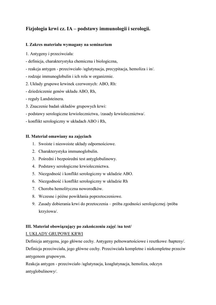 Fizjologia krwi cz. IA – podstawy immunologii i serologii. I. Zakres materiału wymagany na seminarium 1. Antygeny i przeciwciała: - definicja, charakterystyka chemiczna i biologiczna, - reakcja antygen - przeciwciało /aglutynacja, precypitacja, hemoliza i in/. - rodzaje immunoglobulin i ich rola w organizmie. 2. Układy grupowe krwinek czerwonych: ABO, Rh: - dziedziczenie genów układu ABO, Rh, - reguły Landsteinera. 3. Znaczenie badań układów grupowych krwi: - podstawy serologiczne krwiolecznictwa, /zasady krwiolecznictwa/. - konflikt serologiczny w układach ABO i Rh, II. Materiał omawiany na zajęciach 1. Swoiste i nieswoiste układy odpornościowe. 2. Charakterystyka immunoglobulin. 3. Pośredni i bezpośredni test antyglobulinowy. 4. Podstawy serologiczne krwiolecznictwa. 5. Niezgodność i konflikt serologiczny w układzie ABO. 6. Niezgodność i konflikt serologiczny w układzie Rh 7. Choroba hemolityczna noworodków. 8. Wczesne i późne powikłania poprzetoczeniowe. 9. Zasady dobierania krwi do przetoczenia – próba zgodności serologicznej /próba krzyżowa/. III. Materiał obowiązujący po zakończeniu zajęć /na test/ I. UKŁADY GRUPOWE KRWI Definicja antygenu, jego główne cechy. Antygeny pełnowartościowe i resztkowe /hapteny/. Definicja przeciwciała, jego główne cechy. Przeciwciała kompletne i niekompletne przeciw antygenom grupowym. Reakcja antygen - przeciwciało /aglutynacja, koaglutynacja, hemoliza, odczyn antyglobulinowy/. Rodzaje antygenów układu ABO i ich rozmieszczenie w ustroju człowieka. Grupy krwi w układzie ABO i ich częstość występowania w populacji . Przeciwciała układu ABO: naturalne /nieregularne, regularne/, odpornościowe. Reguły Landsteinera. Rodzaje antygenów układu Rh. Rozmieszczenie i częstość występowania antygenów układu Rh u człowieka. Krwinki Rh+, krwinki Rh-. Przeciwciała układu Rh: odpornościowe. Metodyka oznaczania grupy krwi w układach ABO i Rh. Podstawy serologiczne krwiolecznictwa. Niezgodność i konflikt serologiczny w układzie ABO. Niezgodność i konflikt serologiczny w układzie Rh Choroba hemolityczna noworodków. Wczesne i późne powikłania poprzetoczeniowe. Zasady dobierania krwi do przetoczenia – próba zgodności serologicznej /próba krzyżowa/. Literatura: 1. Podstawowa: „Podstawy fizjologii człowieka” – H. Krauss, P. Sosnowski, Wyd. Naukowe Uniwersytetu Medycznego, Poznań 2009 2. Zalecana: „Fizjologia człowieka” - W. Traczyk, PZWL, Warszawa 1980 3. Dodatkowa: „Podstawowe laboratoryjne badania hematologiczne” H. Bomski, Wydawnictwo Lekarskie PZWL, Warszawa 1995 Ć w i c z e n i e – wykonanie Każdy student otrzyma probówkę z krwią pobraną na separator. Należy odpipetować surowicę do czystej probówki, a z krwinek wykonać 10% zawiesinę (1 gęsta kropla krwinek + 9 kropli 0,9% NaCl). I. Oznaczanie grupy krwi w układzie ABO: 1. Kontrola surowic wzorcowych, 2. Określenie antygenów układu ABO na krwinkach badanych: Surowice wzorcowe anty-A Krwinki badane anty-B anty-A i anty-B 3. Określenie izoaglutynin w surowicy badanej: Krwinki wzorcowe Grupy 0 Grupy A Grupy B Surowica badana II. Oznaczanie antygenu D z układu Rh: - kontrola surowic wzorcowych anty – D, - oznaczanie antygenu D w krwinkach czerwonych za pomocą surowicy monoklonalnej antyD. Krwinki badane Krwinki badane + + Surowica wzorcowa anty-D Surowica badana Oznaczanie Rh III. Sporządzenie protokołu z wykonanego ćwiczenia. Autokontrola