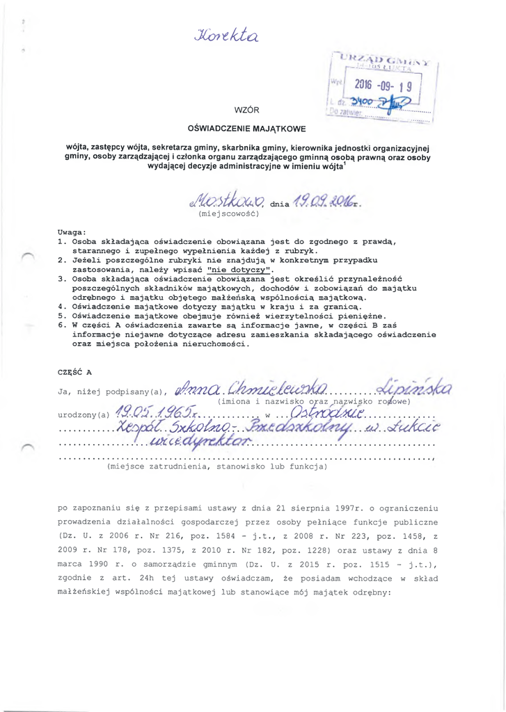 JCwtkŁa. f j\ i —Lź-Unsn u- r»« ,* LIkta 2016 -09-~ | 9 1 WZÓR OŚW IADCZENIE M AJĄTKOW E w ó jta, zastęp cy w ójta, sek re ta rza gm iny, s k a rb n ik a gm iny, k ie ro w n ik a je d n o s tk i o rg a n iza c y jn e j gm iny, o sob y zarzą d za ją c e j i czło n ka o rg anu z a rz ą d z a ją c e g o g m in n ą o s o b ą p ra w n ą o ra z o sob y w yd ającej d ecyzje a d m in is tra c y jn e w im ien iu w ó jta 1 A(miej eiłlouo, scowość) dnia Uwaga: 1. Osoba składająca oświadczenie obowiązana jest do zgodnego z prawdą, starannego i zupełnego wypełnienia każdej z rubryk. 2. Jeżeli poszczególne rubryki nie znajdują w konkretnym przypadku zastosowania, należy wpisać "nie dotyczy". 3. Osoba składająca oświadczenie obowiązana jest określić przynależność poszczególnych składników majątkowych, dochodów i zobowiązań do majątku odrębnego i majątku objętego małżeńską wspólnością majątkową. 4. Oświadczenie majątkowe dotyczy majątku w kraju i za granicą. 5. Oświadczenie majątkowe obejmuje również wierzytelności pieniężne. 6. W części A oświadczenia zawarte są informacje jawne, w części B zaś informacje niejawne dotyczące adresu zamieszkania składającego oświadczenie oraz miejsca położenia nieruchomości. CZĘŚĆ A Ja, niżej podpisany(a), o flm iC l.i ^ (imiona urodzony(a) ......... i nazwisko oraz^na^wisko rodćwe) ......... .. w . Ó XŁohzO . r.. .............. ..o k u . p z fa c te c ie , ; < z8 lćA c ć C .......... ............... ................... (miejsce zatrudnienia, stanowisko lub funkcja) po zapoznaniu się z przepisami ustawy z dnia 21 sierpnia 1997r. o ograniczeniu prowadzenia działalności gospodarczej przez osoby pełniące funkcje publiczne (Dz. U. z 2006 r. Nr 216, poz. 1584 - j.t., z 2008 r. Nr 223, poz. 1458, z 2009 r. Nr 178, poz. 1375, z 2010 r. Nr 182, poz. 1228) oraz ustawy z dnia 8 marca 1990 r. o samorządzie gminnym zgodnie z art. 24h tej (Dz. U. z 2015 r. poz. ustawy oświadczam, 1515 - j.t.), że posiadam wchodzące małżeńskiej wspólności majątkowej lub stanowiące mój majątek odrębny: w skład Ł 2 i . Zasoby pieniężne: - środki pieniężne zgromadzone w walucie polskiej: .IaX£1&v. .?icz. .Zc2GW?zQ. .hM 3ę... .3:1.9.3^. 9ó.?cT........ . R O M . s . k t f ó j T ....... .................................... - środki pieniężne zgromadzone w walucie obcej:............................ '?u ć ... t & > Ć y & % y .............................. - papiery wartościowe: .. 'TUĆ na kwotę: ii. 1. Dom o powierzchni: ....... tytuł prawny: 2. Mieszkanie o m2, o wartości: y?t4£. . powierzchni: m u ......................... m2, o wartości: .A ę Q ..o a Q * r. -tytuł prawny^ . 3. Gospodarstwo rolne: rodzaj gospodarstwa: .................. powierzchnia: o wartości: ........................................ ftCĆ. . rodzaj zabudowy: tytuł prawny: .......................... Z tego tytułu osiągnąłem(ęłam) w roku ubiegłym przychód i dochód w wysokości: ......................................................... 4. Inne nieruchomości: .okća& ł - 9 9 .9 ^ .kufy/d , M u m i i # . ......- 4/* 9.$#?. 3. ........ wartości: ..f/.CGOuL y .. / ?.ćsOĆ'-i£-.3G.Q.<A^ . .GC&flĆi£~. powierzchnia: o tytuł prawny: .f/ó. .p?T24C/Cl • / (M « Z ocĆKL'o K & U Ć j ' ™ c u k ć *łó *Q III. Posiadam udziały w spółkach handlowych - należy podać liczbę udziałów: udziały te stanowią pakiet większy niż 10% udziałów w spółce: .............................. . C&?/k/C4U/............. i emitenta 3 Z tego tytułu osiągnąłem(ęłam) w roku ubiegłym dochód w wysokości: * y :6 X y . ..................... 3ZCĆ.. .OĆ&ĆySCi IV. Posiadam akcje w spółkach handlowych - należy podać liczbę i emitenta akcji: .'TtĆ.C.. r akcje te stanowią pakiet większy niż 10% akcji w spółce: ......................... Z tego tytułu "Zćr£. osiągnąłem(ęłam) ........................... w roku Ubiegłym dochód w wysokości: UC...&ĆC&/C& V. Nabyłem(am) (nabył mój małżonek, z wyłączeniem mienia przynależnego do jego majątku odrębnego) od Skarbu Państwa,innej państwowej osoby prawnej, jednostek samorządu terytorialnego, ich związków lub od komunalnej osoby prawnej następujące mienie, które podlegało zbyciu w drodze przetargu - należy podać opis mienia i datę nabycia, od kogo: ............. ,........................ ^ą > K k a .r< ć c .. .p&uL. . & .???. f. v..o a r z ł# . . .K a b in ie . .<u?..o k u u . . f&CPĆr;... ac/. VI. 1. Prowadzę działalność gospodarczą2 (należy podać formę prawną i przedmiot działalności): ................ .......................'rtc ć . .. - osobiście ................... - wspólnie z innymi osobami .................................. ........................?zcc:...c ć a ć yC tfp ............... Z tego tytułu osiągnąłem(ęłam) w roku ubiegłym przychód i dochód w wysokości: .... .......... <rzt£. .d o ź / ć ic y . ............ 2. Zarządzam działalnością gospodarczą lub jestem przedstawicielem pełnomocnikiem takiej działalności działalności): ... ........ <Kće... 4 - osobiście ........................ .......................... ..................... n c c ................. .................. - wspólnie z innymi osobami ................................... ........................ 9HĆC. .(X Q tyć4< y.................. Z tego tytułu osiągnąłem(ęłam) w roku ubiegłym dochód w wysokości: ............. 'tu t.. a fó ć y tfic y ............ VII. 1. W spółkach handlowych (nazwa, siedziba spółki): ................ ........... 'n ić .. c fe fy ć J ć y ............ estem członkiem zarządu (od kiedy£: ...................m f ć . A estem członkiem rady nadzorczej"(od kiedy): 'n ic .. cćo Z yćićy. - jestem członkiem komisji ,i rewizyjnej rewizyjnej ( (od oc kiedy): 3UĆ '. . Z tego tytułu osiągnąłem(ęłam) w rÓku ubiegłym dochód w wysokości: ............