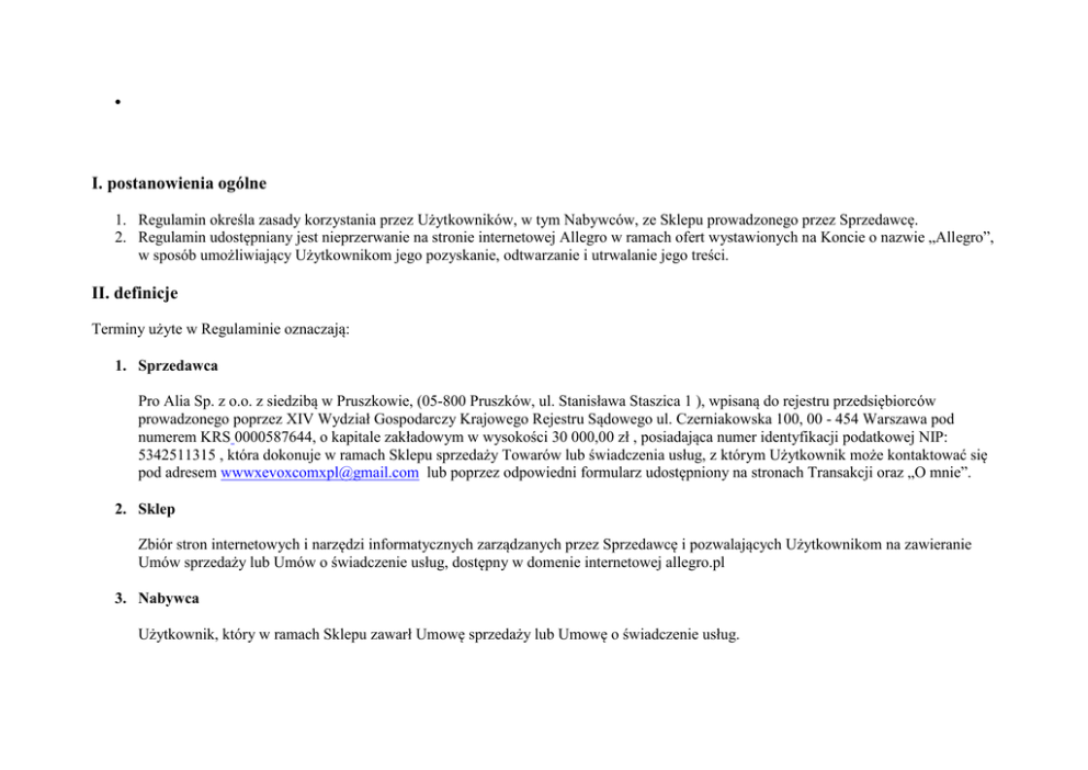 I. postanowienia ogólne 1. Regulamin określa zasady korzystania przez Użytkowników, w tym Nabywców, ze Sklepu prowadzonego przez Sprzedawcę. 2. Regulamin udostępniany jest nieprzerwanie na stronie internetowej Allegro w ramach ofert wystawionych na Koncie o nazwie „Allegro”, w sposób umożliwiający Użytkownikom jego pozyskanie, odtwarzanie i utrwalanie jego treści. II. definicje Terminy użyte w Regulaminie oznaczają: 1. Sprzedawca Pro Alia Sp. z o.o. z siedzibą w Pruszkowie, (05-800 Pruszków, ul. Stanisława Staszica 1 ), wpisaną do rejestru przedsiębiorców prowadzonego poprzez XIV Wydział Gospodarczy Krajowego Rejestru Sądowego ul. Czerniakowska 100, 00 - 454 Warszawa pod numerem KRS 0000587644, o kapitale zakładowym w wysokości 30 000,00 zł , posiadająca numer identyfikacji podatkowej NIP: 5342511315 , która dokonuje w ramach Sklepu sprzedaży Towarów lub świadczenia usług, z którym Użytkownik może kontaktować się pod adresem [email protected] lub poprzez odpowiedni formularz udostępniony na stronach Transakcji oraz „O mnie”. 2. Sklep Zbiór stron internetowych i narzędzi informatycznych zarządzanych przez Sprzedawcę i pozwalających Użytkownikom na zawieranie Umów sprzedaży lub Umów o świadczenie usług, dostępny w domenie internetowej allegro.pl 3. Nabywca Użytkownik, który w ramach Sklepu zawarł Umowę sprzedaży lub Umowę o świadczenie usług. 4. Umowa sprzedaży umowa zawarta w Sklepie na zasadach wynikających z Regulaminu pomiędzy Sprzedawcą a Nabywcą, której przedmiotem jest sprzedaż Towarów na rzecz Nabywcy. 5. Umowa o świadczenie usług umowa zawarta w Sklepie na zasadach wynikających z Regulaminu pomiędzy Sprzedawcą a Nabywcą, której przedmiotem jest świadczenie przez Sprzedawcę na rzecz Nabywcy usługi lub usług. 6. Umowa obejmuje Umowę sprzedaży oraz Umowę o świadczenie usług. 7. Regulamin niniejszy Regulamin Sklepu. 8. Allegro platforma handlowa on-line o charakterze otwartym, w ramach której dokonywane są transakcje oraz świadczone są inne usługi związane z transakcjami, prowadzona w domenie internetowej allegro.pl 9. Materiały informacje zawarte na stronach internetowych Sklepu, m.in. nazwy i opisy oraz zdjęcia i ilustracje graficzne Towarów, oznaczenia producentów Towarów. 10. Użytkownik użytkownik Allegro korzystający ze Sklepu, nabywający lub zamierzający nabyć Towary lub usługi prezentowane przez Sprzedawcę za pośrednictwem Sklepu. III. ogólne warunki korzystania ze sklepu 1. Użytkownik może korzystać ze Sklepu za pośrednictwem urządzeń komunikujących się z Internetem (na przykład komputer lub telefon), z wykorzystaniem przeglądarki internetowej. 2. Sprzedawca nie ponosi odpowiedzialności za ewentualne szkody spowodowane podaniem przez Użytkownika nieprawdziwych, nieaktualnych lub niepełnych danych w formularzach, o których mowa w Art. IV, w punkcie 2 i 3 oraz nieprzestrzeganiem przez Użytkownika warunków Regulaminu. Dane podawane przez Użytkownika nie mogą naruszać przepisów aktualnie obowiązującego prawa oraz dóbr osobistych i praw osób trzecich. 3. Wykorzystywanie przez Użytkownika nazwy Sprzedawcy, logo Sklepu, Materiałów oraz innych niż Materiały składników Sklepu (w tym elementów graficznych Sklepu oraz układu i kompozycji Sklepu – tzw. layout) jest zabronione za wyjątkiem sytuacji wyraźnie wskazanych w Regulaminie lub gdy korzystanie ze wskazanych w niniejszym punkcie przedmiotów praw autorskich oraz przedmiotów własności przemysłowej jest możliwe na podstawie wyraźnej pisemnej zgody Sprzedawcy lub uprawnionych podmiotów trzecich (w tym producentów lub dystrybutorów Towarów lub usług). Zabronione jest podejmowanie przez Użytkownika jakichkolwiek działań zmierzających do odtworzenia Sklepu, w tym w szczególności na stronach internetowych i w domenach internetowych powiązanych z Użytkownikiem. 4. Użytkownik zobowiązany jest do nieujawniania osobom trzecim swojego loginu i hasła dostępu, wykorzystywanego do logowania w Sklepie. IV. korzystanie ze sklepu - zawarcie umowy 1. Użytkownicy mają możliwość: 1. korzystania ze Sklepu, w tym zawierania Umów, bez konieczności dokonywania rejestracji w Allegro, lub 2. korzystania ze Sklepu, w tym zawierania Umów, z wykorzystaniem danych dostępowych Użytkownika pochodzących z Allegro. 2. Zawieranie Umów bez uprzedniej rejestracji w Allegro jest możliwe, z zastrzeżeniem pozostałych postanowień Regulaminu, po spełnieniu łącznie następujących warunków: 1. prawidłowym wypełnieniu elektronicznego formularza internetowego dostępnego na stronie internetowej Allegro poprzez podani e wymaganych danych, 2. akceptacji niniejszego Regulaminu. 3. Zawieranie Umów w przypadku Użytkownika posiadającego Konto w Allegro (będącego Użytkownikiem Allegro) wymaga spełnienia łącznie następujących warunków: 1. zalogowania się do Allegro za pomocą loginu i hasła dostępu przypisanego do konta w Allegro, 2. akceptacji niniejszego Regulaminu. 4. W przypadku osoby prawnej oraz jednostki organizacyjnej nieposiadającej osobowości prawnej wszelkie czynności tego podmiotu w Sklepie może dokonać wyłącznie osoba, która jest umocowana do dokonywania w imieniu tego podmiotu wszelkich czynności związanych z korzystaniem ze Sklepu oraz do wykonywania wszelkich praw i obowiązków tego podmiotu jako Użytkownika (w tym Nabywcy). 5. W przypadku jakiejkolwiek zmiany danych Użytkownika powinien on je zaktualizować, korzystając z odpowiedniego formularza dostępnego w Allegro, przed zawarciem kolejnej Umowy. 6. Użytkownik ma możliwość dokonywania zakupów w Sklepie w trybie 24 godzin/ 7 dni w tygodniu przez cały rok, z zastrzeżeniem pozostałych postanowień Regulaminu, w szczególności postanowień dotyczących przerw technicznych. 7. Po otrzymaniu zamówienia Sprzedawca może zweryfikować, czy zamówienie zostało złożone prawidłowo (zgodnie z pos