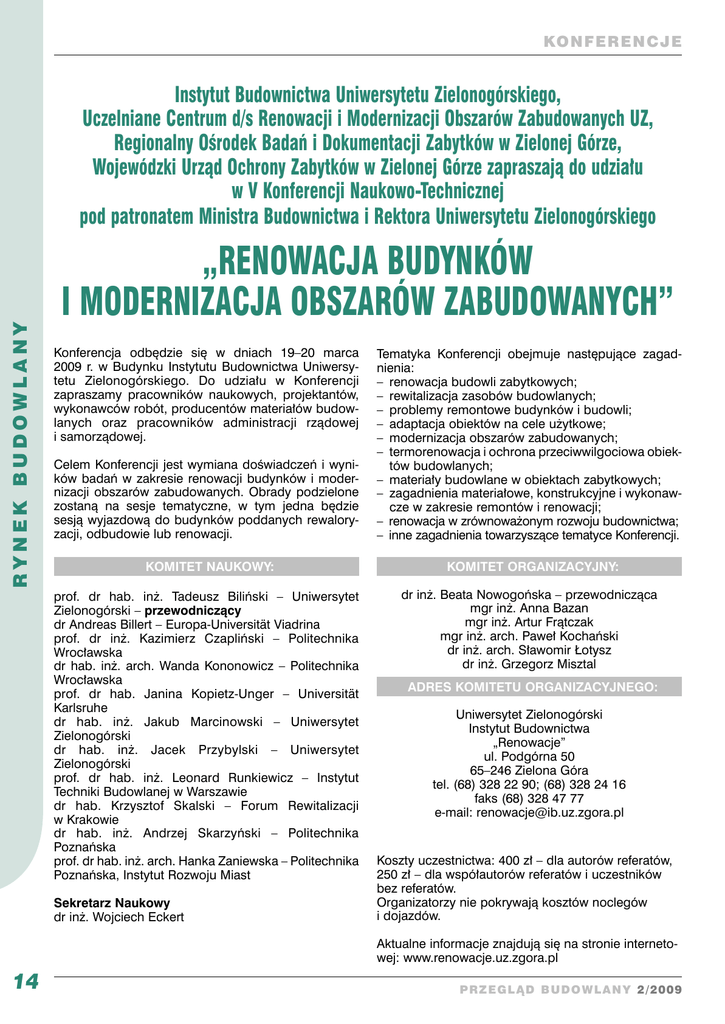 KON FEREN C J E R YNE K BUDOWLANY Instytut Budownictwa Uniwersytetu Zielonogórskiego, Uczelniane Centrum d/s Renowacji i Modernizacji Obszarów Zabudowanych UZ, Regionalny Ośrodek Badań i Dokumentacji Zabytków w Zielonej Górze, Wojewódzki Urząd Ochrony Zabytków w Zielonej Górze zapraszają do udziału w V Konferencji Naukowo-Technicznej pod patronatem Ministra Budownictwa i Rektora Uniwersytetu Zielonogórskiego „RENOWACJA BUDYNKÓW I MODERNIZACJA OBSZARÓW ZABUDOWANYCH” Konferencja odbędzie się w dniach 19–20 marca 2009 r. w Budynku Instytutu Budownictwa Uniwersy tetu Zielonogórskiego. Do udziału w Konferencji zapraszamy pracowników naukowych, projektantów, wykonawców robót, producentów materiałów budowlanych oraz pracowników administracji rządowej i samorządowej. Celem Konferencji jest wymiana doświadczeń i wyników badań w zakresie renowacji budynków i modernizacji obszarów zabudowanych. Obrady podzielone zostaną na sesje tematyczne, w tym jedna będzie sesją wyjazdową do budynków poddanych rewaloryzacji, odbudowie lub renowacji. Tematyka Konferencji obejmuje następujące zagadnienia: – renowacja budowli zabytkowych; – rewitalizacja zasobów budowlanych; – problemy remontowe budynków i budowli; – adaptacja obiektów na cele użytkowe; – modernizacja obszarów zabudowanych; – termorenowacja i ochrona przeciwwilgociowa obiektów budowlanych; – materiały budowlane w obiektach zabytkowych; – zagadnienia materiałowe, konstrukcyjne i wykonawcze w zakresie remontów i renowacji; – renowacja w zrównoważonym rozwoju budownictwa; – inne zagadnienia towarzyszące tematyce Konferencji. KOMITET NAUKOWY: KOMITET ORGANIZACYJNY: prof. dr hab. inż. Tadeusz Biliński – Uniwersytet Zielonogórski – przewodniczący dr Andreas Billert – Europa-Universität Viadrina prof. dr inż. Kazimierz Czapliński – Politechnika Wrocławska dr hab. inż. arch. Wanda Kononowicz – Politechnika Wrocławska prof. dr hab. Janina Kopietz-Unger – Universität Karlsruhe dr hab. inż. Jakub Marcinowski – Uniwersytet Zielonogórski dr hab. inż. Jacek Przybylski – Uniwersytet Zielonogórski prof. dr hab. inż. Leonard Runkiewicz – Instytut Techniki Budowlanej w Warszawie dr hab. Krzysztof Skalski – Forum Rewitalizacji w Krakowie dr hab. inż. Andrzej Skarzyński – Politechnika Poznańska prof. dr hab. inż. arch. Hanka Zaniewska – Politechnika Poznańska, Instytut Rozwoju Miast dr inż. Beata Nowogońska – przewodnicząca mgr inż. Anna Bazan mgr inż. Artur Frątczak mgr inż. arch. Paweł Kochański dr inż. arch. Sławomir Łotysz dr inż. Grzegorz Misztal Sekretarz Naukowy dr inż. Wojciech Eckert ADRES KOMITETU ORGANIZACYJNEGO: Uniwersytet Zielonogórski Instytut Budownictwa „Renowacje” ul. Podgórna 50 65–246 Zielona Góra tel. (68) 328 22 90; (68) 328 24 16 faks (68) 328 47 77 e-mail: [email protected] Koszty uczestnictwa: 400 zł – dla autorów referatów, 250 zł – dla współautorów referatów i uczestników bez referatów. Organizatorzy nie pokrywają kosztów noclegów i dojazdów. Aktualne informacje znajdują się na stronie internetowej: www.renowacje.uz.zgora.pl 14 PRz eg l Ąd bu d owl any 2/2009