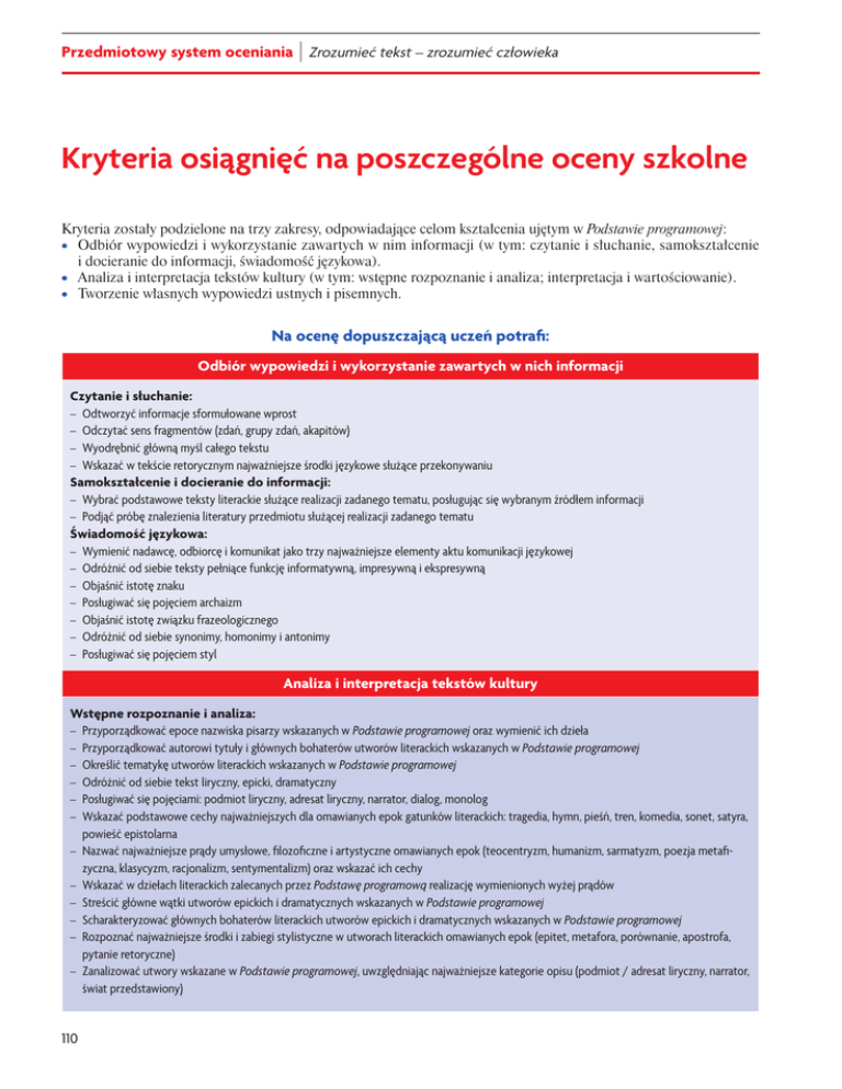 Przedmiotowy system oceniania | Zrozumieć tekst – zrozumieć człowieka Kryteria osiągnięć na poszczególne oceny szkolne Kryteria zostały podzielone na trzy zakresy, odpowiadające celom kształcenia ujętym w Podstawie programowej: • Odbiór wypowiedzi i wykorzystanie zawartych w nim informacji (w tym: czytanie i słuchanie, samokształcenie i docieranie do informacji, świadomość językowa). • Analiza i interpretacja tekstów kultury (w tym: wstępne rozpoznanie i analiza; interpretacja i wartościowanie). • Tworzenie własnych wypowiedzi ustnych i pisemnych. na ocenę dopuszczającą uczeń potrafi: Odbiór wypowiedzi i wykorzystanie zawartych w nich informacji Czytanie i słuchanie: – Odtworzyć informacje sformułowane wprost – Odczytać sens fragmentów (zdań, grupy zdań, akapitów) – Wyodrębnić główną myśl całego tekstu – Wskazać w tekście retorycznym najważniejsze środki językowe służące przekonywaniu Samokształcenie i docieranie do informacji: – Wybrać podstawowe teksty literackie służące realizacji zadanego tematu, posługując się wybranym źródłem informacji – Podjąć próbę znalezienia literatury przedmiotu służącej realizacji zadanego tematu Świadomość językowa: – Wymienić nadawcę, odbiorcę i komunikat jako trzy najważniejsze elementy aktu komunikacji językowej – Odróżnić od siebie teksty pełniące funkcję informatywną, impresywną i ekspresywną – Objaśnić istotę znaku – Posługiwać się pojęciem archaizm – Objaśnić istotę związku frazeologicznego – Odróżnić od siebie synonimy, homonimy i antonimy – Posługiwać się pojęciem styl Analiza i interpretacja tekstów kultury Wstępne rozpoznanie i analiza: – Przyporządkować epoce nazwiska pisarzy wskazanych w Podstawie programowej oraz wymienić ich dzieła – Przyporządkować autorowi tytuły i głównych bohaterów utworów literackich wskazanych w Podstawie programowej – Określić tematykę utworów literackich wskazanych w Podstawie programowej – Odróżnić od siebie tekst liryczny, epicki, dramatyczny – Posługiwać się pojęciami: podmiot liryczny, adresat liryczny, narrator, dialog, monolog – Wskazać podstawowe cechy najważniejszych dla omawianych epok gatunków literackich: tragedia, hymn, pieśń, tren, komedia, sonet, satyra, powieść epistolarna – Nazwać najważniejsze prądy umysłowe, filozoficzne i artystyczne omawianych epok (teocentryzm, humanizm, sarmatyzm, poezja metafizyczna, klasycyzm, racjonalizm, sentymentalizm) oraz wskazać ich cechy – Wskazać w dziełach literackich zalecanych przez Podstawę programową realizację wymienionych wyżej prądów – Streścić główne wątki utworów epickich i dramatycznych wskazanych w Podstawie programowej – Scharakteryzować głównych bohaterów literackich utworów epickich i dramatycznych wskazanych w Podstawie programowej – Rozpoznać najważniejsze środki i zabiegi stylistyczne w utworach literackich omawianych epok (epitet, metafora, porównanie, apostrofa, pytanie retoryczne) – Zanalizować utwory wskazane w Podstawie programowej, uwzględniając najważniejsze kategorie opisu (podmiot / adresat liryczny, narrator, świat przedstawiony) 110 Ocenianie Interpretacja i wartościowanie: – Określić przybliżone ramy chronologiczne antyku, średniowiecza, renesansu, baroku, oświecenia i preromantyzmu – Objaśnić znaczenie nazw epok literackich: antyk, średniowiecze, renesans, barok, oświecenie, preromantyzm – Odczytać znaczenie podstawowych symboli w dziełach literackich wskazanych w Podstawie programowej Tworzenie własnych wypowiedzi ustnych i pisemnych – Posługiwać się komunikatywnym językiem w mowie i w piśmie – Wypowiadać się w mowie i w piśmie na zadany temat, w sposób świadczący o co najmniej częściowym zrozumieniu tematu – Odnieść się w wypowiedzi do tekstów literackich – Podjąć próbę skomponowania wypowiedzi składającej się ze wstępu, rozwinięcia i zakończenia – Samodzielnie prowadzić zeszyt przedmiotowy – Zrealizować przynajmniej połowę obowiązkowych zadań przewidzianych przez nauczyciela Dopuszczalne: konieczność pomocy ze strony nauczyciela podczas realizacji zadań, ubogi komentarz, stereotypowość sądów, streszczanie utworu zamiast analizy i interpretacji, drobne błędy rzeczowe, błędy kompozycyjne (np. brak proporcji między poszczególnymi elementami pracy, brak logicznej spójności tekstu, brak wstępu lub zakończenia), błędy stylistyczne, składniowe, frazeologiczne, fleksyjne, interpunkcyjne i ortograficzne. na ocenę dostateczną uczeń potrafi to, co na ocenę dopuszczającą, a ponadto: Odbiór wypowiedzi i wykorzystanie zawartych w nich informacji Czytanie i słuchanie: – Określić funkcję środków językowych w tekście retorycznym – Rozpoznać ironię w tekście – Sformułować tezę tekstu bądź fragmentu tekstu – Podać argumenty na rzecz tezy – Odróżnić argumenty od przykładów oraz tezę od hipotezy – Rozpoznać relacje kompozycyjne między poszczególnymi fragmentami (akapitami) tekstu – Oddzielić informacje od opinii – Wskazać przyczyny i skutki Samokształcenie i docieranie do informacji: – Wyszukać podstawowe pozycje z literatury przedmiotu służącej realizacji zadanego tematu – Samodzielnie korzystać ze słowników i leksykonów Świadomość językowa: – Rozpoznać w tekście sześć elementów aktu komunikacji językowej – Określić dominującą w tekście funkcję wypowiedzi – Objaśnić, na czym polega specyfika budowy języka jako systemu znaków – Podać genezę i objaśnić znaczenie najczęściej pojawiających się w tekstach związków frazeologicznych o pochodzeniu biblijnym i mitologicznym – Wskazać w tekście staropolskim archaizmy fonetyczne, leksykalne i składniowe – Rozpoznać w tekście synonimię, homonimię, antonimię i polisemię – Objaśnić pojęcie stylizac