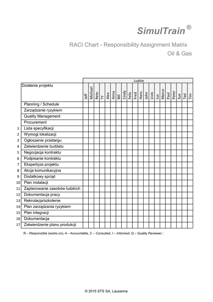 SimulTrain ® RACI Chart - Responsibility Assignment Matrix Oil & Gas Jeff Michael Reto TY Alex Anna Bill Cindy Felix Fred Hans John Livio Luc Marco Paul Peter Sue Ted Tim Ludzie Działania projektu Planning / Schedule Zarządzanie ryzykiem Quality Management Procurement 1 Lista specyfikacji 2 Wymogi lokalizacji 3 Ogłoszenie przetargu 4 Zatwierdzenie budżetu 5 Negocjacja kontraktu 6 Podpisanie kontraktu 7 Ekspertyza projektu 8 Akcja komunikacyjna 9 Dodatkowy sprzęt 10 Plan instalacji 11 Zaplanowanie zasobów ludzkich 12 Dokumentacja pracy 13 Rekrutacja/szkolenie Plan zarządzania ryzykiem 14 pracowników 15 Plan integracji 16 Dokumentacja 17 Zatwierdzenie planu produkcji R – Responsible (works on), A – Accountable, C – Consulted, I – Informed, Q – Quality Reviewer © 2015 STS SA, Lausanne