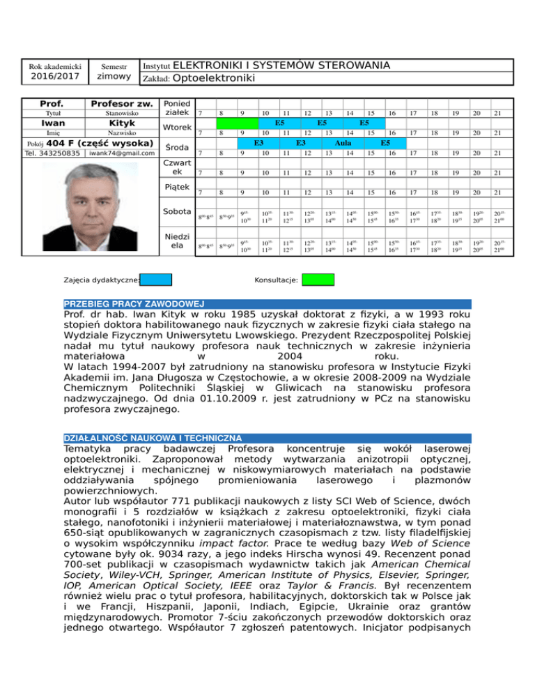 Rok akademicki Semestr 2016/2017 zimowy Instytut ELEKTRONIKI I SYSTEMÓW STEROWANIA Zakład: Optoelektroniki Prof. Profesor zw. Tytuł Stanowisko Iwan Kityk Imię Nazwisko Pokój 404 F (część wysoka) Tel. 343250835 [email protected] Ponied ziałek 7 Wtorek Środa 8 9 10 11 12 E5 7 8 9 10 11 E3 13 14 E5 12 13 E3 15 16 17 18 19 20 21 16 17 18 19 20 21 E5 14 15 Aula E5 7 8 9 10 11 12 13 14 15 16 17 18 19 20 21 Czwart ek 7 8 9 10 11 12 13 14 15 16 17 18 19 20 21 7 8 9 10 11 12 13 14 15 16 17 18 19 20 21 800-845 850-935 9451030 10351120 11301215 12201305 13151400 14051450 15001545 15501635 16451730 17351820 18301915 19202005 20152100 800-845 850-935 9451030 10351120 11301215 12201305 13151400 14051450 15001545 15501635 16451730 17351820 18301915 19202005 20152100 Piątek Sobota Niedzi ela Zajęcia dydaktyczne: Konsultacje: PRZEBIEG PRACY ZAWODOWEJ Prof. dr hab. Iwan Kityk w roku 1985 uzyskał doktorat z fizyki, a w 1993 roku stopień doktora habilitowanego nauk fizycznych w zakresie fizyki ciała stałego na Wydziale Fizycznym Uniwersytetu Lwowskiego. Prezydent Rzeczpospolitej Polskiej nadał mu tytuł naukowy profesora nauk technicznych w zakresie inżynieria materiałowa w 2004 roku. W latach 1994-2007 był zatrudniony na stanowisku profesora w Instytucie Fizyki Akademii im. Jana Długosza w Częstochowie, a w okresie 2008-2009 na Wydziale Chemicznym Politechniki Śląskiej w Gliwicach na stanowisku profesora nadzwyczajnego. Od dnia 01.10.2009 r. jest zatrudniony w PCz na stanowisku profesora zwyczajnego. DZIAŁALNOŚĆ NAUKOWA I TECHNICZNA Tematyka pracy badawczej Profesora koncentruje się wokół laserowej optoelektroniki. Zaproponował metody wytwarzania anizotropii optycznej, elektrycznej i mechanicznej w niskowymiarowych materiałach na podstawie oddziaływania spójnego promieniowania laserowego i plazmonów powierzchniowych. Autor lub współautor 771 publikacji naukowych z listy SCI Web of Science, dwóch monografii i 5 rozdziałów w książkach z zakresu optoelektroniki, fizyki ciała stałego, nanofotoniki i inżynierii materiałowej i materiałoznawstwa, w tym ponad 650-siąt opublikowanych w zagranicznych czasopismach z tzw. listy filadelfijskiej o wysokim współczynniku impact factor. Prace te według bazy Web of Science cytowane były ok. 9034 razy, a jego indeks Hirscha wynosi 49. Recenzent ponad 700-set publikacji w czasopismach wydawnictw takich jak American Chemical Society, Wiley-VCH, Springer, American Institute of Physics, Elsevier, Springer, IOP, American Optical Society, IEEE oraz Taylor & Francis. Był recenzentem również wielu prac o tytuł profesora, habilitacyjnych, doktorskich tak w Polsce jak i we Francji, Hiszpanii, Japonii, Indiach, Egipcie, Ukrainie oraz grantów międzynarodowych. Promotor 7-ściu zakończonych przewodów doktorskich oraz jednego otwartego. Współautor 7 zgłoszeń patentowych. Inicjator podpisanych wielu umów Erasmusa pomiędzy Politechniką Częstochowską a krajami Unii Europejskiej. Profesor Iwan Kityk jest edytorem zagranicznych czasopism Materials Letters, Optical Materials, Results in Physics, American Journal of Materials Science and Technology, Crystals oraz ekspertem Narodowego Centrum Nauki. Był stałym członkiem Komitetów Naukowych i Organizacyjnych kilkudziesięciu konferencji międzynarodowych przeprowadzanych zarówno za granicą jak i w kraju. Wielokrotnie zapraszany do wygłaszania seminariów i wykładów w zagranicznych ośrodkach naukowo-badawczych, czy referatów na konferencjach naukowych. W latach 1998-2014 wielokrotnie przebywał w ośrodkach zagranicznych jako visiting professor. Kierował 4 grantami (2 - KBNkimi, 2 –NCN) oraz był kierownikiem wielu bilateralnych grantów międzynarodowych, m.in. polsko-francuskich i polsko-niemieckich. DZIAŁALNOŚĆ DYDAKTYCZNA W zakresie działalności dydaktycznej na Wydziale Elektrycznym prowadzi wykłady i ćwiczenia audytoryjne z fizyki, optoelektroniki, technik laserowych oraz seminaria dyplomowe. DZIAŁALNOŚĆ ORGANIZACYJNA Od roku 2009 pełni funkcję kierownika Zakładu Optoelektroniki.