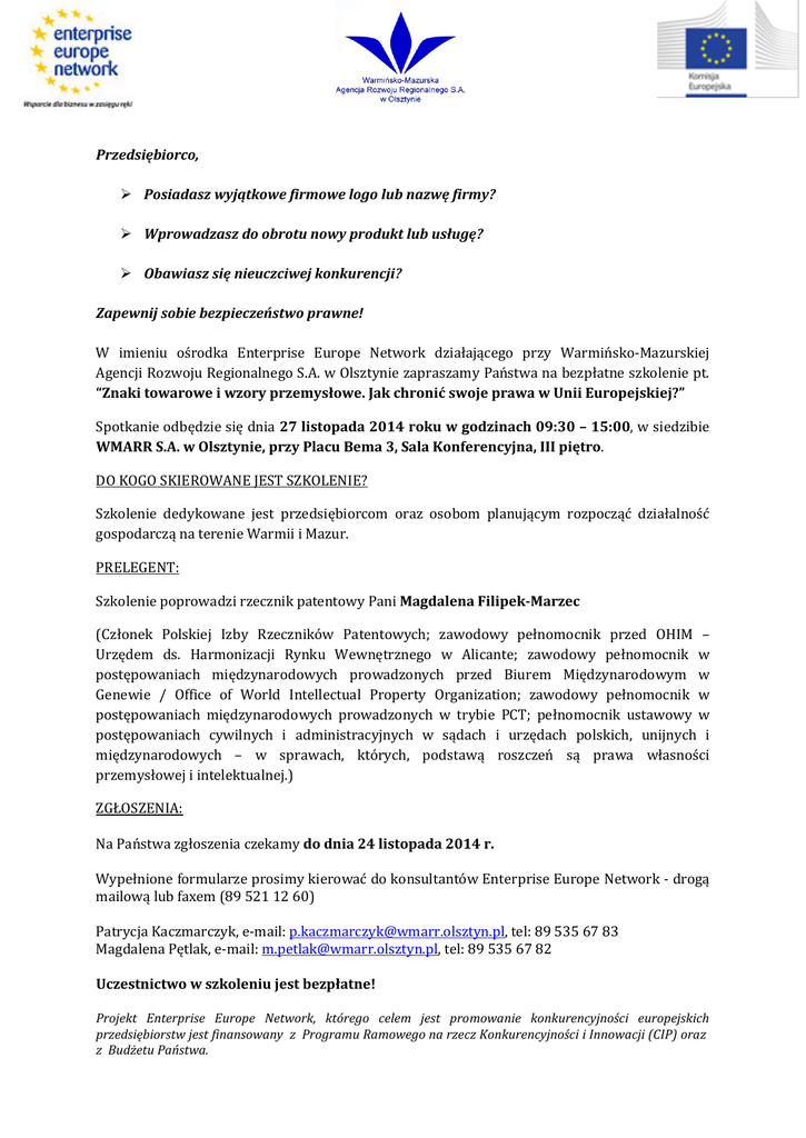 Przedsiębiorco, Posiadasz wyjątkowe firmowe logo lub nazwę firmy? Wprowadzasz do obrotu nowy produkt lub usługę? Obawiasz się nieuczciwej konkurencji? Zapewnij sobie bezpieczeństwo prawne! W imieniu ośrodka Enterprise Europe Network działającego przy Warmińsko-Mazurskiej Agencji Rozwoju Regionalnego S.A. w Olsztynie zapraszamy Państwa na bezpłatne szkolenie pt. “Znaki towarowe i wzory przemysłowe. Jak chronić swoje prawa w Unii Europejskiej?” Spotkanie odbędzie się dnia 27 listopada 2014 roku w godzinach 09:30 – 15:00, w siedzibie WMARR S.A. w Olsztynie, przy Placu Bema 3, Sala Konferencyjna, III piętro. DO KOGO SKIEROWANE JEST SZKOLENIE? Szkolenie dedykowane jest przedsiębiorcom oraz osobom planującym rozpocząć działalność gospodarczą na terenie Warmii i Mazur. PRELEGENT: Szkolenie poprowadzi rzecznik patentowy Pani Magdalena Filipek-Marzec (Członek Polskiej Izby Rzeczników Patentowych; zawodowy pełnomocnik przed OHIM – Urzędem ds. Harmonizacji Rynku Wewnętrznego w Alicante; zawodowy pełnomocnik w postępowaniach międzynarodowych prowadzonych przed Biurem Międzynarodowym w Genewie / Office of World Intellectual Property Organization; zawodowy pełnomocnik w postępowaniach międzynarodowych prowadzonych w trybie PCT; pełnomocnik ustawowy w postępowaniach cywilnych i administracyjnych w sądach i urzędach polskich, unijnych i międzynarodowych – w sprawach, których, podstawą roszczeń są prawa własności przemysłowej i intelektualnej.) ZGŁOSZENIA: Na Państwa zgłoszenia czekamy do dnia 24 listopada 2014 r. Wypełnione formularze prosimy kierować do konsultantów Enterprise Europe Network - drogą mailową lub faxem (89 521 12 60) Patrycja Kaczmarczyk, e-mail: [email protected], tel: 89 535 67 83 Magdalena Pętlak, e-mail: [email protected], tel: 89 535 67 82 Uczestnictwo w szkoleniu jest bezpłatne! Projekt Enterprise Europe Network, którego celem jest promowanie konkurencyjności europejskich przedsiębiorstw jest finansowany z Programu Ramowego na rzecz Konkurencyjności i Innowacji (CIP) oraz z Budżetu Państwa.