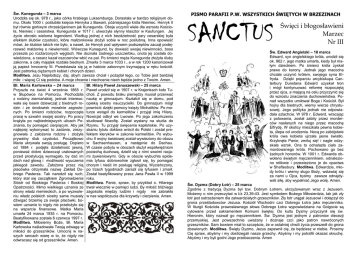 Św. Kunegunda – 3 marca Urodziła się ok. 978 r., jako córka hrabiego Luksemburga. Dorastała w bardzo religijnym domu. Około 1000 r. poślubiła księcia Henryka z Bawarii, późniejszego króla Niemiec. Henryk II był równie gorliwym chrześcijaninem jak Kunegunda. Oboje uczynili wiele dla wzrostu Kościoła, Niemiec i cesarstwa. Kunegunda w 1017 r. utworzyła słynny klasztor w Kaufungen. Jej życie obrosło wieloma legendami. Według jednej z nich bezdzietność pary cesarskiej była efektem ślubów czystości, które małżonkowie złożyli sobie w noc poślubną. Inna opowieść mówi, że ślubów takich nie było, a nawet, że Henryk pod wpływem podszeptów zaczął podejrzewać małżonkę o niewierność. Wówczas Kunegund, by dowieść swojej niewinności, boso przeszła po rozżarzonych węglach. Nie doznała żadnego uszczerbku, cnota jej została dowiedziona, a cesarz kazał oszczerców wbić na pal. Po śmierci męża Kunegunda złożyła śluby zakonne, a cały majątek rozdała biednym. Zmarła 3 marca 1033 r., a w rok 1200 kanonizował ją papież Innocenty III. Przedstawia się ją w habicie zakonnym trzymającą w ręku kościół. Jest patronką ciężarnych kobiet i chorych dzieci. Modlitwa. Jezu Najsłodszy, daj, abym zawsze chciał i pożądał tego, co Tobie jest bardziej miłe i więcej Ci się podoba. A moje chcenie i niechcenie niech będzie jedno z Twoim. Amen. Bł. Maria Karłowska – 24 marca Bł. Hilary Paweł Januszewski – 25 marca Przyszła na świat 4 września 1865 r. Paweł urodził się w 1907 r. w Krajenkach koło Tuw Słupówce na Pomorzu. Pochodziła choli. Z powodu braku pieniędzy musiał przerwać z rodziny ziemiańskiej, jednak intereso- naukę w gimnazjum. Kształcił się w domu, pod wała się losem dziewcząt z biednych ro- opieką siostry nauczycielki. Do gimnazjum mógł dzin i ze środowisk moralnie zagrożo- powrócić dzięki pomocy księży Michalitów. Po manych. Po śmierci rodziców, rozpoczęła turze wstąpił do karmelitów i przyjął imię Hilary. pracę w szwalni swojej siostry. Po pracy Nowicjat odbył we Lwowie. Po jego zakończeniu krążyła po najbiedniejszych ulicach Po- studiował filozofię. Został wysłany na studia do znania, by pomagać cierpiącym. Aby jak Rzymu. Tu przyjął święcenia kapłańskie. Po uzynajlepiej wykonywać to zadanie, zrezy- skaniu tytułu doktora wrócił do Polski i został pregnowała z założenia rodziny i złożyła fektem kleryków w zakonie karmelitów. Po wybuprywatny ślub czystości. Początkowo chu II wojny światowej został wywieziony do obozu Maria ukrywała swoją posługę. Dopiero w Sachsenhausen, a następnie do Dachau. od 1884 r. podjęła działalność jawną, W czasie pobytu w obozach służył współwięźniom ponieważ dobro dziewcząt uratowanych pociechą duchową, dzielił się z nimi swoimi racjaprzed prostytucją wymagało, by dać im mi żywieniowymi. Gdy w obozie wybuchła epidedach nad głową i możliwość wyuczenia mia tyfusu dobrowolnie zgłosił się, by pomagać jakiegoś zawodu. Założona przez nią chorym i nieść im posługę religijną. Wycieńczony, placówka otrzymała nazwę Zakład Do- po trzech tygodniach zaraził się tyfusem i zmarł. brego Pasterza. Tak narodził się ruch, Został beatyfikowany przez Jana Pawła II w 1999 który stał się zaczątkiem Zgromadzenia roku. Sióstr od Boskiego Pasterza i Boskiej Modlitwa. Panie, spraw, by przykład o. Hilarego Opatrzności. Mimo wielkiego uznania ze trwał wiecznie w pamięci ludzi. By miłość bliźniego strony władz niemieckich, a po wyzwole- zagościła między ludźmi i nigdy nie zabrakło niu władz polskich siostry same musiały w nas współczucia dla krzywdy i cierpienia. Amen. dźwigać brzemię za swoje placówki, bowiem uznanie to nigdy nie przełożyło się na wsparcie finansowe. Matka Maria umarła 24 marca 1935 r. na Pomorzu. Beatyfikowana została 6 czerwca 1997 r. Modlitwa. Miłosierny Boże, Bł. Maria Karłowska naśladowała Twoją odwagę w miłości do grzeszników. Umocnij w naszych sercach wiarę w to, że nigdy nie odwracasz się od grzeszników. Amen. PISMO PARAFII P.W. WSZYSTKICH ŚWIĘTYCH W BRZEZINACH SANC SANCTUS Święci i błogosławieni Marzec Nr III Św. Edward Angielski – 18 marca Edward, syn angielskiego króla, urodził się ok. 962 r. jego matka umarła, kiedy był małym dzieckiem. Po śmierci króla zyskał prawo do korony. Jednak jego macocha chciała uczynić królem, swojego syna Elfryda. Dzięki poparciu arcybiskupa Canterbury Dunstana Edward uzyskał tron i mógł kontynuować reformę rozpoczętą przez ojca, a mającą na celu przyczynić się do wzrostu znaczenia duchowieństwa. Ponad wszystko umiłował Boga i Kościół. Był hojny dla biednych, wierny wierze chrystusowej. Jego polityka jednak nie odpowiadała szlachcie. W 978 r. Edward, wracając z polowania, został zabity przez morderców nasłanych na niego przez macochę Elfrydę. W okolicy mieszkała pewna kobieta, ślepa od urodzenia. Nocą po zabójstwie króla owa kobieta ujrzała jasne światło. Krzyknęła Panie, zmiłuj się! i nagle odzyskała wzrok. Ona to odnalazła ciało zamordowanego króla. Pochowano go bez żadnych honorów. W 1001 r. Edwarda obwołano świętym męczennikiem, odnaleziono relikwie i przewieziono je do opactwa w Shaftesbury. Modlitwa. Edwardzie, młody królu i wierny sługo Boży, wstawiaj się za nami u Ojca, byśmy zawsze odnajdywali siłę, aby wypełniać Jego wolę. Amen. Św. Dyzma (Dobry Łotr) – 25 marca Zgodnie z tradycją Dyzma był tzw. Dobrym Łotrem, ukrzyżowanym wraz z Jezusem. Możemy o nim przeczytać w Łk 23,39-43. Jest symbolem Bożego Miłosierdzia, tak jak zły łotr jest ostrzeżeniem dla zatwardziałych grzeszników. Zły łotr urągał Jezusowi i dołączył do grona prześladowców Jezusa. Kościół Wschodni czci Dobrego Łotra jako męczennika. W liturgii Kościoła prawosławnego słowa Dobrego Łotra wypowi