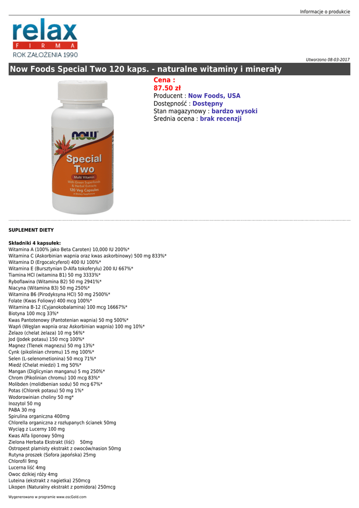 Informacje o produkcie Utworzono 08-03-2017 Now Foods Special Two 120 kaps. - naturalne witaminy i minerały Cena : 87.50 zł Producent : Now Foods, USA Dostępność : Dostępny Stan magazynowy : bardzo wysoki Średnia ocena : brak recenzji SUPLEMENT DIETY Składniki 4 kapsułek: Witamina A (100% jako Beta Caroten) 10,000 IU 200%* Witamina C (Askorbinian wapnia oraz kwas askorbinowy) 500 mg 833%* Witamina D (Ergocalcyferol) 400 IU 100%* Witamina E (Bursztynian D-Alfa tokoferylu) 200 IU 667%* Tiamina HCl (witamina B1) 50 mg 3333%* Ryboflawina (Witamina B2) 50 mg 2941%* Niacyna (Witamina B3) 50 mg 250%* Witamina B6 (Pirodyksyna HCl) 50 mg 2500%* Folate (Kwas Foliowy) 400 mcg 100%* Witamina B-12 (Cyjanokobalamina) 100 mcg 16667%* Biotyna 100 mcg 33%* Kwas Pantotenowy (Pantotenian wapnia) 50 mg 500%* Wapń (Węglan wapnia oraz Askorbinian wapnia) 100 mg 10%* Żelazo (chelat żelaza) 10 mg 56%* Jod (Jodek potasu) 150 mcg 100%* Magnez (Tlenek magnezu) 50 mg 13%* Cynk (pikolinian chromu) 15 mg 100%* Selen (L-selenometionina) 50 mcg 71%* Miedź (Chelat miedzi) 1 mg 50%* Mangan (Diglicynian manganu) 5 mg 250%* Chrom (Pikolinian chromu) 100 mcg 83%* Molibden (molidbenian sodu) 50 mcg 67%* Potas (Chlorek potasu) 50 mg 1%* Wodorowinian choliny 50 mg* Inozytol 50 mg PABA 30 mg Spirulina organiczna 400mg Chlorella organiczna z rozłupanych ścianek 50mg Wyciąg z Lucerny 100 mg Kwas Alfa liponowy 50mg Zielona Herbata Ekstrakt (liść) 50mg Ostropest plamisty ekstrakt z owoców/nasion 50mg Rutyna proszek (Sofora japońska) 25mg Chlorofil 9mg Lucerna liść 4mg Owoc dzikiej róży 4mg Luteina (ekstrakt z nagietka) 250mcg Likopen (Naturalny ekstrakt z pomidora) 250mcg Wygenerowano w programie www.oscGold.com Octacosanol 100mcg Amylaza 50SKB Lipaza 800 LU Bromelaina z ananasa 48 GDU Papaina 50,000 USP *RWS Referencyjne Wartości Spożycia Pozostałe składniki: Celuloza kapsułka, Stearynian magnezu pochodzenia roślinnego, Celuloza proszek, Kwas stearynowy pochodzenia roślinnego, krzemionka. Sposób użycia: 4 kapsułki dziennie w jednej lub dwóch porcjach. Ostrzeżenie: Nie stosować dla kobiet w ciąży. Nie przekraczać zalecanej porcji do spożycia w ciągu dnia. Produkt nie może być stosowany jako substytut prawidłowo zróżnicowanej diety. Przechowywanie: Przechowywać w temperaturze pokojowej w sposób niedostępny dla małych dzieci. Producent: NOW FOODS, 395 S. GLEN ELLYN Rd. BLOOMINGDALE, IL 60108, USA Opakowanie: 120 kapsułek Kilka słów o producencie: Firma Now Foods w prowadzonej od 1968 roku działalności każdym dniem zapracowała sobie na miano najbardziej renomowanego producenta w branży w USA. Potwierdzają to liczne tytuły i nagrody: Producent Roku 2003 w USA, Najlepsza Marka w sklepach ze zdrową żywnością w USA w 2004 roku.Now Foods mając na celu najwyższą satysfakcję swoich klientów produkuje tylko najwyższej dostępnej farmaceutycznej klasy. Dla zapewnienia bezwzględnej jakości podstawowych składników każdy z naszych dostawców jest przez nas kontrolowany w nieregularnych audytach. Now Foods robi wszystko co możliwe, aby najwyższa jakość produktów mogła być zaoferowana klientom w cenie, na którą mogą sobie pozwolić.