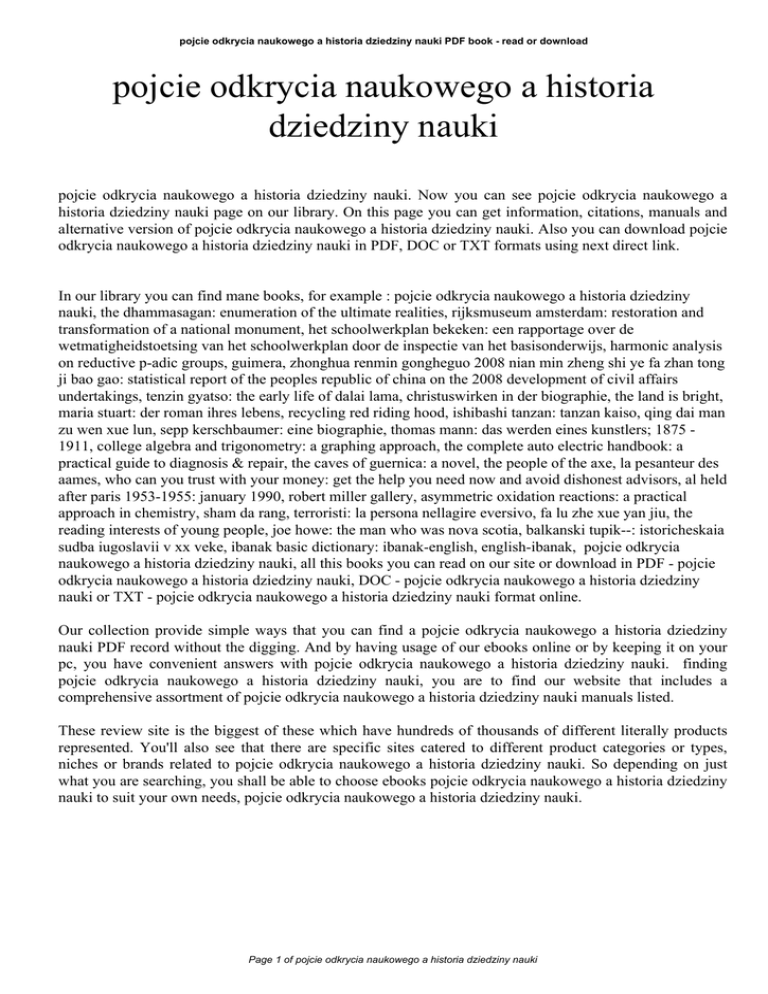 pojcie odkrycia naukowego a historia dziedziny nauki PDF book - read or download pojcie odkrycia naukowego a historia dziedziny nauki pojcie odkrycia naukowego a historia dziedziny nauki. Now you can see pojcie odkrycia naukowego a historia dziedziny nauki page on our library. On this page you can get information, citations, manuals and alternative version of pojcie odkrycia naukowego a historia dziedziny nauki. Also you can download pojcie odkrycia naukowego a historia dziedziny nauki in PDF, DOC or TXT formats using next direct link. In our library you can find mane books, for example : pojcie odkrycia naukowego a historia dziedziny nauki, the dhammasagan: enumeration of the ultimate realities, rijksmuseum amsterdam: restoration and transformation of a national monument, het schoolwerkplan bekeken: een rapportage over de wetmatigheidstoetsing van het schoolwerkplan door de inspectie van het basisonderwijs, harmonic analysis on reductive p-adic groups, guimera, zhonghua renmin gongheguo 2008 nian min zheng shi ye fa zhan tong ji bao gao: statistical report of the peoples republic of china on the 2008 development of civil affairs undertakings, tenzin gyatso: the early life of dalai lama, christuswirken in der biographie, the land is bright, maria stuart: der roman ihres lebens, recycling red riding hood, ishibashi tanzan: tanzan kaiso, qing dai man zu wen xue lun, sepp kerschbaumer: eine biographie, thomas mann: das werden eines kunstlers; 1875 1911, college algebra and trigonometry: a graphing approach, the complete auto electric handbook: a practical guide to diagnosis & repair, the caves of guernica: a novel, the people of the axe, la pesanteur des aames, who can you trust with your money: get the help you need now and avoid dishonest advisors, al held after paris 1953-1955: january 1990, robert miller gallery, asymmetric oxidation reactions: a practical approach in chemistry, sham da rang, terroristi: la persona nellagire eversivo, fa lu zhe xue yan jiu, the reading interests of young people, joe howe: the man who was nova scotia, balkanski tupik--: istoricheskaia sudba iugoslavii v xx veke, ibanak basic dictionary: ibanak-english, english-ibanak, pojcie odkrycia naukowego a historia dziedziny nauki, all this books you can read on our site or download in PDF - pojcie odkrycia naukowego a historia dziedziny nauki, DOC - pojcie odkrycia naukowego a historia dziedziny nauki or TXT - pojcie odkrycia naukowego a historia dziedziny nauki format online. Our collection provide simple ways that you can find a pojcie odkrycia naukowego a historia dziedziny nauki PDF record without the digging. And by having usage of our ebooks online or by keeping it on your pc, you have convenient answers with pojcie odkrycia naukowego a historia dziedziny nauki. finding pojcie odkrycia naukowego a historia dziedziny nauki, you are to find our website that includes a comprehensive assortment of pojcie odkrycia naukowego a historia dziedziny nauki manuals listed. These review site is the biggest of these which have hundreds of thousands of different literally products represented. You'll also see that there are specific sites catered to different product categories or types, niches or brands related to pojcie odkrycia naukowego a historia dziedziny nauki. So depending on just what you are searching, you shall be able to choose ebooks pojcie odkrycia naukowego a historia dziedziny nauki to suit your own needs, pojcie odkrycia naukowego a historia dziedziny nauki. Page 1 of pojcie odkrycia naukowego a historia dziedziny nauki