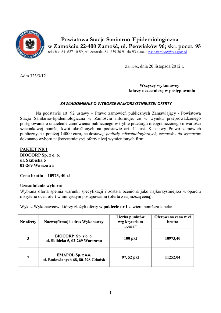 Powiatowa Stacja Sanitarno-Epidemiologiczna w Zamościu 22-400 Zamość, ul. Peowiaków 96; skr. poczt. 95 tel./fax: 84 627 10 59, tel. centrala: 84 639 36 91 do 93 e-mail: [email protected] Zamość, dnia 20 listopada 2012 r. Adm.323/3/12 Wszyscy wykonawcy którzy uczestniczą w postępowaniu ZAWIADOMIENIE O WYBORZE NAJKORZYSTNIEJSZEJ OFERTY Na podstawie art. 92 ustawy – Prawo zamówień publicznych Zamawiający - Powiatowa Stacja Sanitarno-Epidemiologiczna w Zamościu informuje, że w wyniku przeprowadzonego postępowania o udzielenie zamówienia publicznego w trybie przetargu nieograniczonego o wartości szacunkowej poniżej kwot określonych na podstawie art. 11 ust. 8 ustawy Prawo zamówień publicznych i poniżej 14000 euro, na dostawę: podłoży mikrobiologicznych, zestawów do wymazów dokonano wyboru najkorzystniejszej oferty niżej wymienionych firm: PAKIET NR I BIOCORP Sp. z o. o. ul. Skibicka 5 02-269 Warszawa Cena brutto – 10973, 40 zł Uzasadnienie wyboru: Wybrana oferta spełnia warunki specyfikacji i została oceniona jako najkorzystniejsza w oparciu o kryteria ocen ofert w niniejszym postępowaniu (oferta z najniższą ceną). Wykaz Wykonawców, którzy złożyli oferty w pakiecie nr I zawiera poniższa tabela: Nr oferty Nazwa(firma) i adres Wykonawcy Liczba punktów w/g kryterium „cena” 3 BIOCORP Sp. z o. o. ul. Skibicka 5, 02-269 Warszawa 100 pkt 10973,40 7 EMAPOL Sp. z o.o. ul. Budowlanych 68, 80-298 Gdańsk 97, 52 pkt 11252,04 1 Oferowana cena w zł brutto 6 ARGENTA Mikrobiologia Sp. z o.o., Sp.k. ul. Polska 114, 60-401 Poznań 91, 81 pkt 11952,88 4 „GRASO” Zenon Sobiecki 83-200 Starogard Gdański-Krąg 4A 96, 00 pkt 11430,12 5 BTL Sp. z o. o. Zakład Enzymów i Peptonów ul. Bolesława 13, 93-492 Łódź 68, 88 pkt 15930,32 PAKIET NR II EMAPOL Sp. z o. o. ul. Polska 114 60-401 Poznań Cena brutto –2900,00 zł Uzasadnienie wyboru: Wybrana oferta spełnia warunki specyfikacji i została oceniona jako najkorzystniejsza w oparciu o kryteria ocen ofert w niniejszym postępowaniu (oferta z najniższą ceną). Wykaz Wykonawców, którzy złożyli oferty w pakiecie nr II zawiera poniższa tabela: Liczba pkt. Oferowana cena w zł brutto w/g kryterium „cena” Nr oferty Nazwa(firma) i adres Wykonawcy 7 EMAPOL Sp. z o. o. ul. Budowlanych 68, 80-298 Gdańsk 100 pkt 2900,00 1 P.P.H.U. BOR-POL Mariusz Borkowski Plac Jaśminu 2, 44-152 Gliwice 96, 35 pkt 3010,00 6 ARGENTA Mikrobiologia Sp. z o. o., Sp. k. ul. Polska 114, 60-401 Poznań 95, 87 pkt 3025,00 2 MAR-FOUR Marian Siekierski ul. Kilińskiego 185, 90-348 Łódź 89, 37 pkt 3245,00 2 Na podstawie art. 94 ust. 1 pkt. 2 ustawy - Prawo zamówień publicznych, Zamawiający zawrze umowę w sprawie zamówienia publicznego w terminie nie krótszym niż 5 dni od dnia przesłania zawiadomienia o wyborze najkorzystniejszej oferty, jeżeli zawiadomienie to zostało przesłane w sposób określony w art. 27 ust. 2, albo 10 dni - jeżeli zostało przesłane w inny sposób – w przypadku zamówień, których wartość jest mniejsza niż kwoty określone w przepisach wydanych na podstawie art. 11 ust. 8, nie później jednak niż przed upływem terminu związania ofertą. Wobec powyższego wybrany Wykonawca zostanie poinformowany o miejscu i terminie podpisania umowy. Prosimy o niezwłoczne potwierdzenie faktu otrzymania niniejszego pisma na nasz faks nr faksu: (84) 627 10 59 Dziękujemy za udział w postępowaniu. Z poważaniem Dyrektor Powiatowej Stacji SanitarnoEpidemiologicznej w Zamościu mgr inż. Stanisław Jaślikowski 3