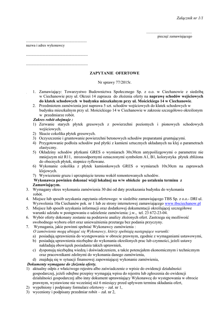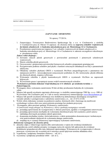 Załącznik nr 1/1 ............................................. pieczęć zamawiającego ............................................................ nazwa i adres wykonawcy ............................................................. ............................................................. ZAPYTANIE OFERTOWE Nr sprawy 77/2015r. 1. Zamawiający: Towarzystwo Budownictwa Społecznego Sp. z o.o. w Ciechanowie z siedzibą w Ciechanowie przy ul. Okrzei 14 zaprasza do złożenia oferty na naprawę schodów wejściowych do klatek schodowych w budynku mieszkalnym przy ul. Mościckiego 14 w Ciechanowie. 2. Przedmiotem zamówienia jest naprawa 5 szt. schodów wejściowych do klatek schodowych w budynku mieszkalnym przy ul. Mościckiego 14 w Ciechanowie w zakresie szczegółowo określonym w przedmiarze robót. Zakres robót obejmuje : 1) Zerwanie starych płytek gresowych z powierzchni poziomych i pionowych schodowych wejściowych. 2) Skucie cokolika płytek gresowych. 3) Oczyszczenie i gruntowanie powierzchni betonowych schodów preparatami gruntującymi. 4) Przygotowanie podłoża schodów pod płytki z kamieni sztucznych układanych na klej o parametrach elastyczny. 5) Okładziny schodów płytkami GRES o wymiarach 30x30cm antypoślizgowymi o parametrze nie mniejszym niż R11, mrozoodpornymi oznaczonymi symbolem A1, B1, kolorystyka płytek zbliżona do obecnych płytek, stopnice ryflowane. 6) Wykonanie cokolika z płytek kamionkowych GRES o wymiarach 10x30cm na zaprawach klejowych. 7) Wywiezienie gruzu i uprzątnięcie terenu wokół remontowanych schodów. Wykonawca powinien dokonać wizji lokalnej na w/w obiekcie po ustaleniu terminu z Zamawiającym. 3. Wymagany okres wykonania zamówienia 30 dni od daty przekazania budynku do wykonania robót. 4. Miejsce lub sposób uzyskania zapytania ofertowego: w siedzibie zamawiającego TBS Sp. z o.o.- DRI ul. Wyzwolenia 10a Ciechanów pok. nr 1 lub ze strony internetowej zamawiającego www.tbsciechanow.pl 5. Miejsce lub sposób uzyskania informacji oraz dodatkowej dokumentacji określającej szczegółowe warunki udziału w postępowaniu o udzielenie zamówienia: j.w., tel. 23 672-23-04. 6. Wybór oferty dokonany zostanie na podstawie analizy złożonych ofert. Zastrzega się możliwość swobodnego wyboru ofert oraz unieważnienia przetargu bez podania przyczyny. 7. Wymagania, jakie powinni spełniać Wykonawcy zamówienia : O zamówienie mogą ubiegać się Wykonawcy, którzy spełniają następujące warunki: a) posiadają uprawnienia do występowania w obrocie prawnym, zgodnie z wymaganiami ustawowymi, b) posiadają uprawnienia niezbędne do wykonania określonych prac lub czynności, jeżeli ustawy nakładają obowiązek posiadania takich uprawnień, c) dysponują niezbędną wiedzą i doświadczeniem, a także potencjałem ekonomicznym i technicznym oraz pracownikami zdolnymi do wykonania danego zamówienia, d) znajdują się w sytuacji finansowej zapewniającej wykonanie zamówienia, Dokumenty wymagane do złożenia oferty. 1) aktualny odpis z właściwego rejestru albo zaświadczenie o wpisie do ewidencji działalności gospodarczej, jeżeli odrębne przepisy wymagają wpisu do rejestru lub zgłoszenia do ewidencji działalności gospodarczej albo inny dokument uprawniający Wykonawcę do występowania w obrocie prawnym, wystawione nie wcześniej niż 6 miesięcy przed upływem terminu składania ofert, 2) wypełniony i podpisany formularz ofertowy – zał. nr 1, 3) wyceniony i podpisany przedmiar robót – zał. nr 2, 4) oświadczenie podpisane przez osobę uprawnioną o braku zaległości podatkowych i regularnym płaceniu składek ubezpieczeniowych, 5) wykaz wykonanych w ciągu ostatnich trzech lat robót o podobnym zakresie i charakterze z podaniem ich wartości, 6) referencje potwierdzające, że roboty o których mowa wyżej zostały wykonane z należytą starannością, 7) karta charakterystyki płytek przeznaczonych do wbudowania. 8. Warunki umowy: o miejscu i terminie podpisania umowy zamawiający powiadomi odrębnym pismem, umowa zawarta zostanie z uwzględnieniem postanowień wynikających z treści niniejszego zapytania oraz danych zawartych w ofercie. 9. Wymagania dotyczące zabezpieczenia należytego wykonania umowy, sposób oraz formę jego wniesienia (jeżeli jest wymagany): nie jest wymagane. 10. Wykonawca udzieli gwarancji jakości na zakres objęty niniejszym zamówieniem na okres nie krótszy niż 36 miesięcy od daty bezusterkowego odbioru końcowego robót. 11. Sposób przygotowania ofert. Ofertę należy sporządzić na załączonym druku formularza ofertowego (zał. nr 1) Cenę oferty należy obliczyć w oparciu o załączony przedmiar robót (zał. nr 2) i dokonaną wizję lokalną schodów wejściowych do budynku. Ofertę należy przygotować w języku polskim, w formie pisemnej, na maszynie, komputerze, nieścieralnym atramentem, umieścić w zabezpieczonej kopercie i opisanej w następujący sposób: nazwa i adres zamawiającego, nazwa i adres Wykonawcy, z adnotacją "Zapytanie ofertowe nr sprawy 77/2015r. na naprawę schodów wejściowych do klatek schodowych w budynku mieszkalnym przy ul. Mościckiego 14 w Ciechanowie.” 12. Miejsce i termin złożenia ofert: oferty należy złożyć do dnia 08.09.2015 roku, do godziny 10,00 w kancelarii zamawiającego w Towarzystwie Budownictwa Społecznego Sp. z o.o. w Ciechanowie ul. Okrzei 14 pokój nr 3, parter. Załącznik nr 1 FORMULARZ OFERTOWY Dane dotyczące oferenta Nazwa.................................................................................................................... Siedziba................................................................................................................. Nr telefonu/faks...................................................................................................... nr NIP...................................................................................................................... nr REGON.........